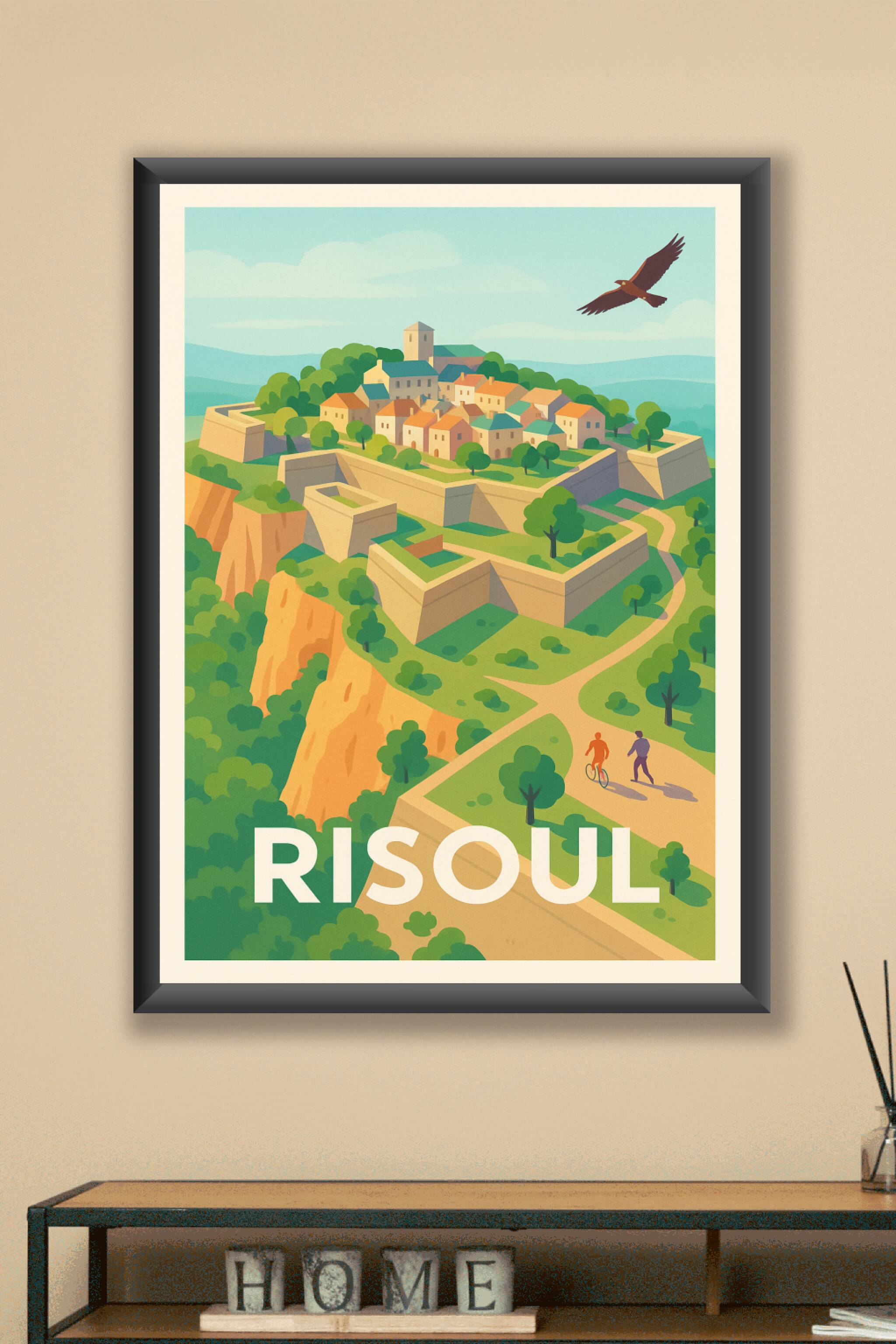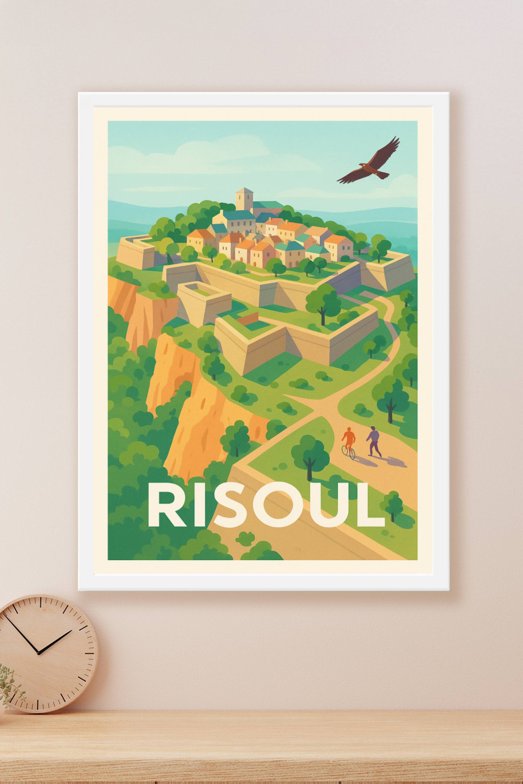 Découvrez la beauté unique de Risoul avec cette affiche illustrée qui met en avant la fortification et les paysages verdoyants typiques des Alpes. ...