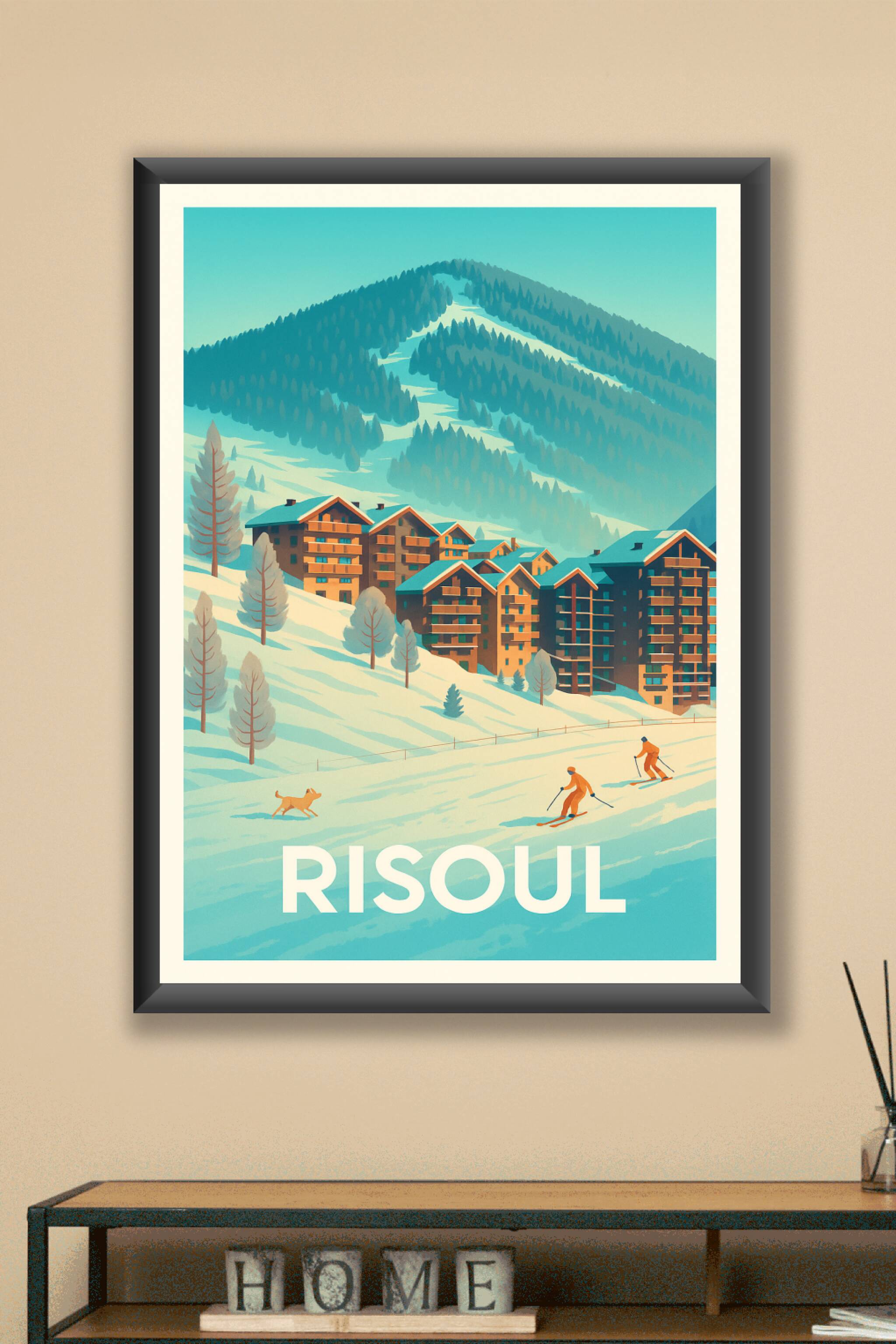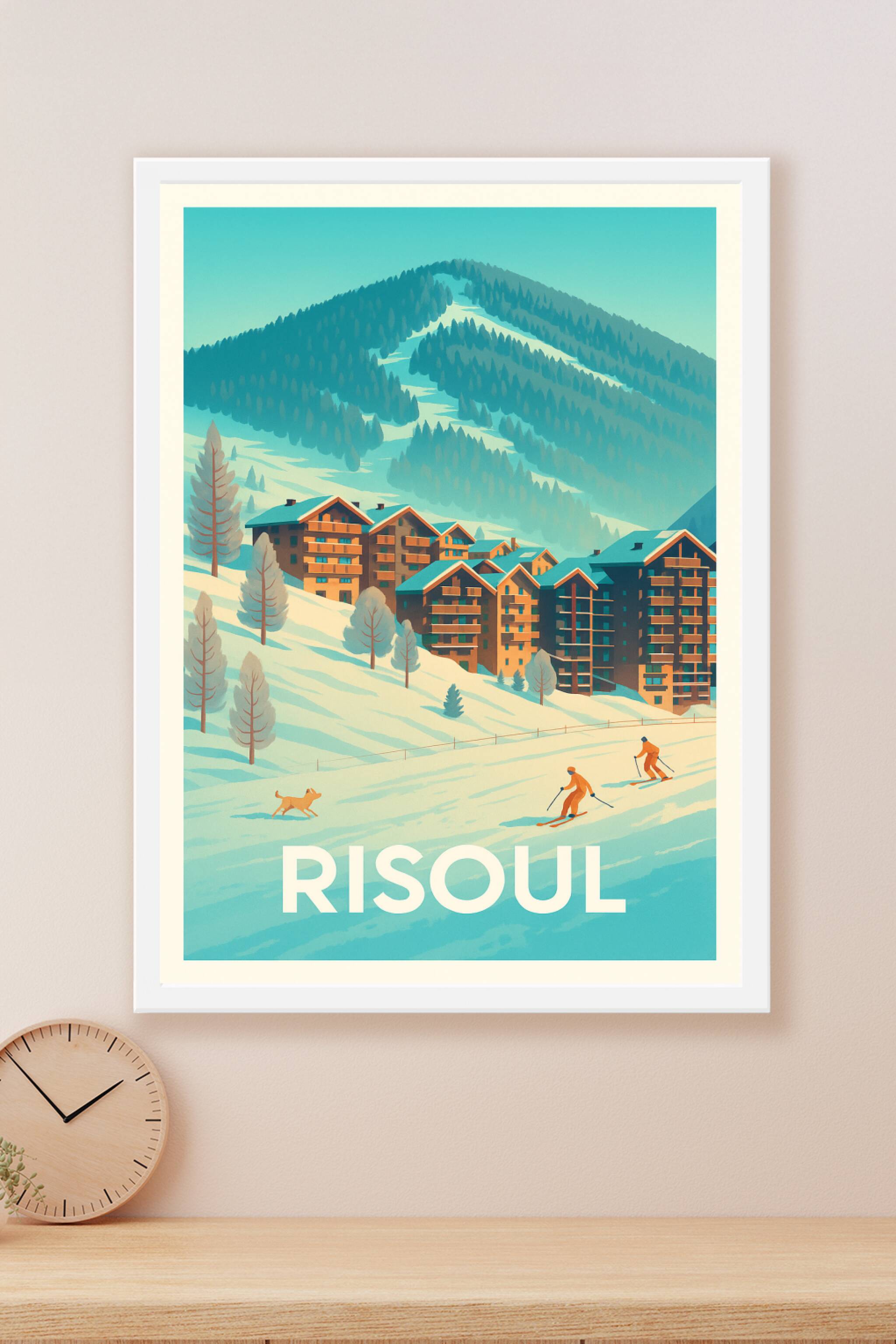 Découvrez la beauté enneigée de Risoul à travers cette affiche vintage qui capture à la perfection l'ambiance chaleureuse d'une station de ski auth...