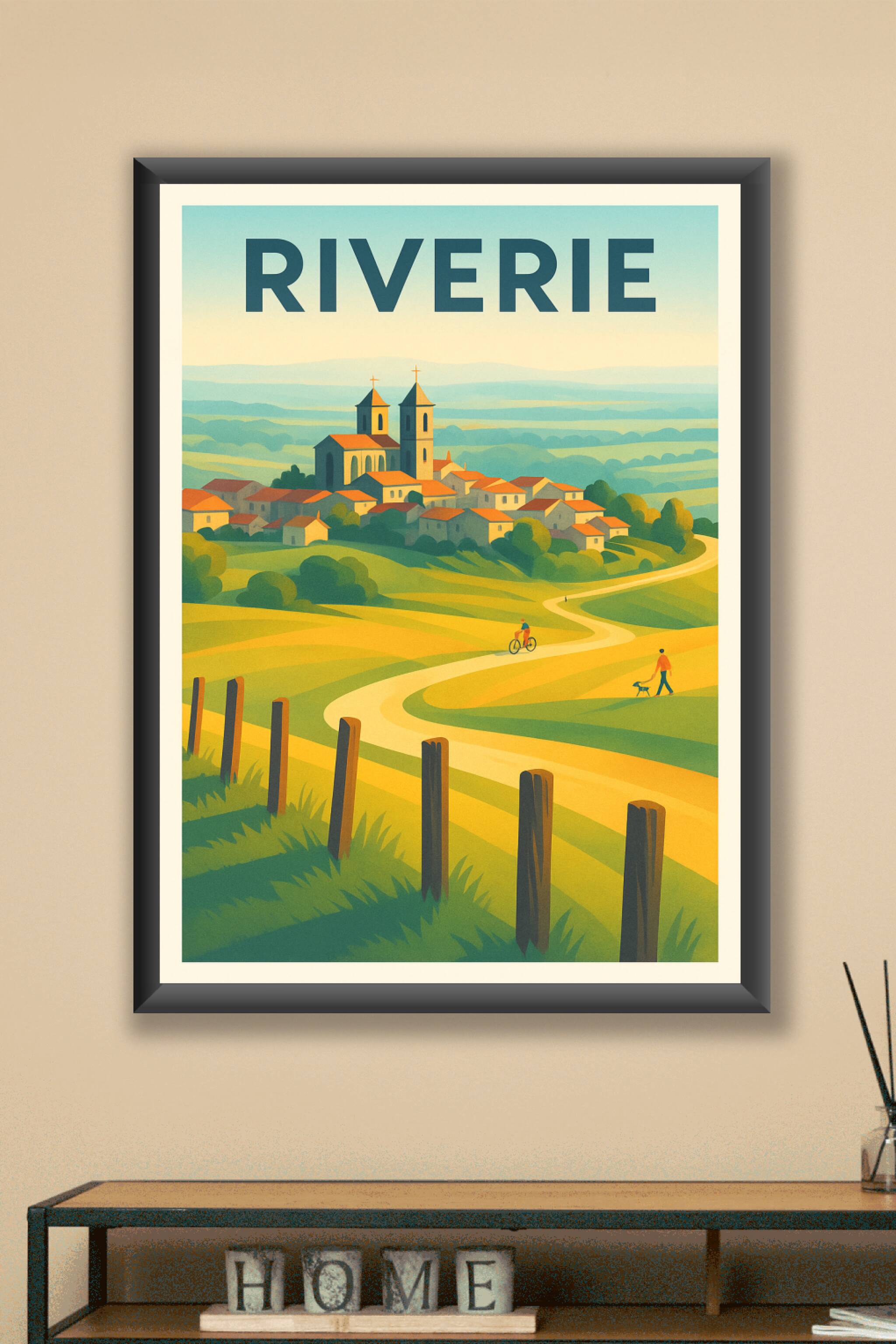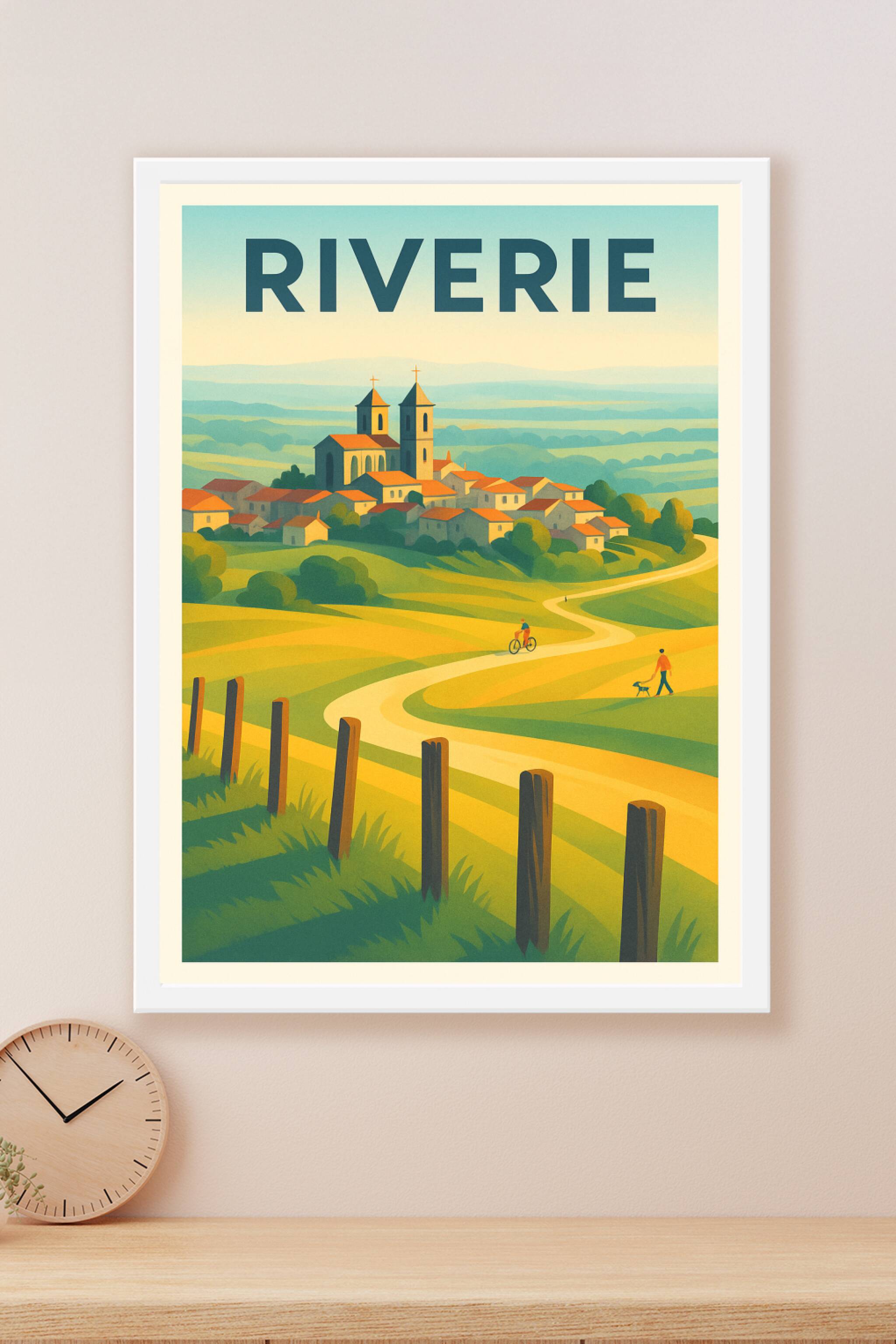 Plongez dans l'atmosphère paisible et authentique de Riverie avec cette affiche illustrée mettant en scène son village typique niché au cœur d'un p...