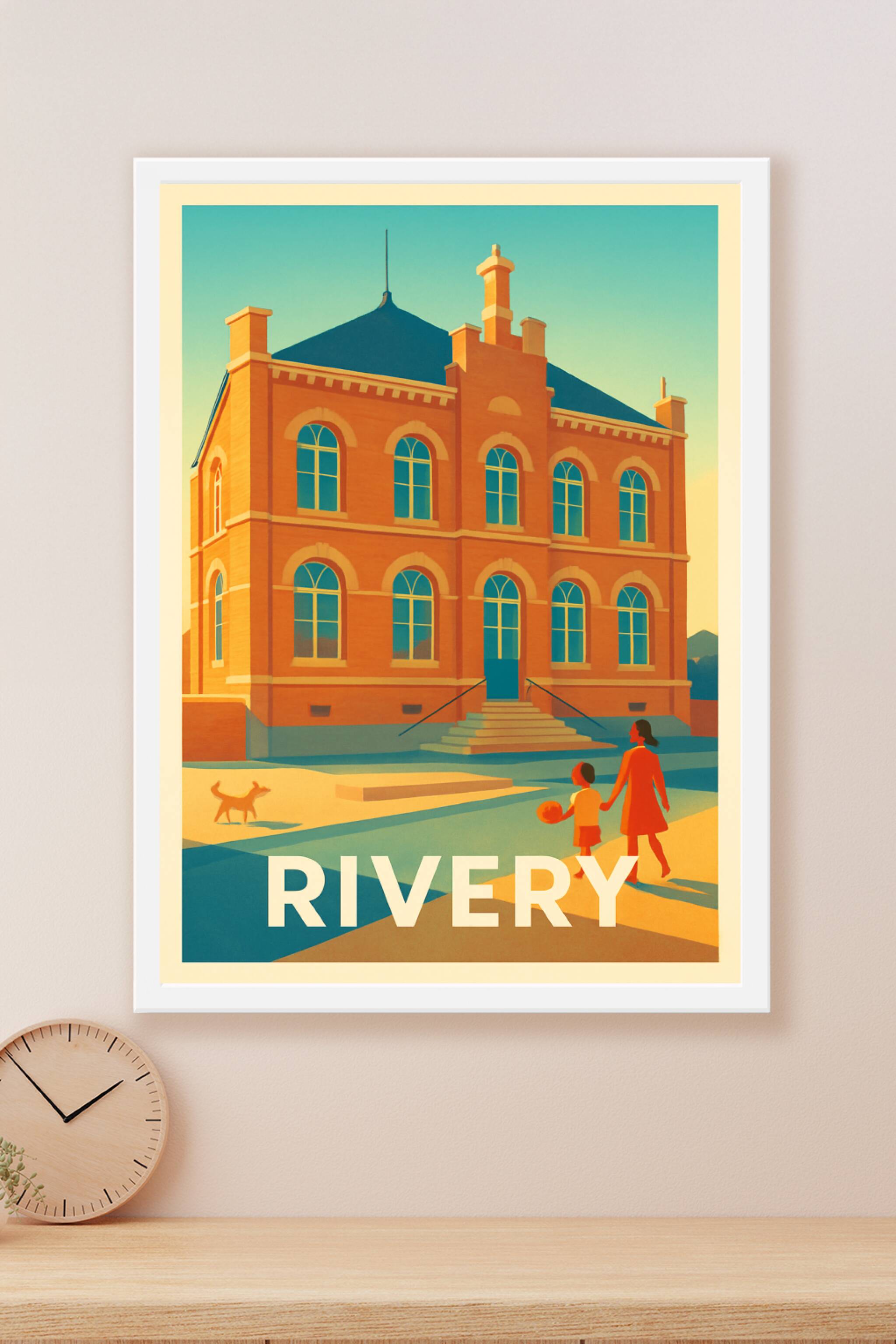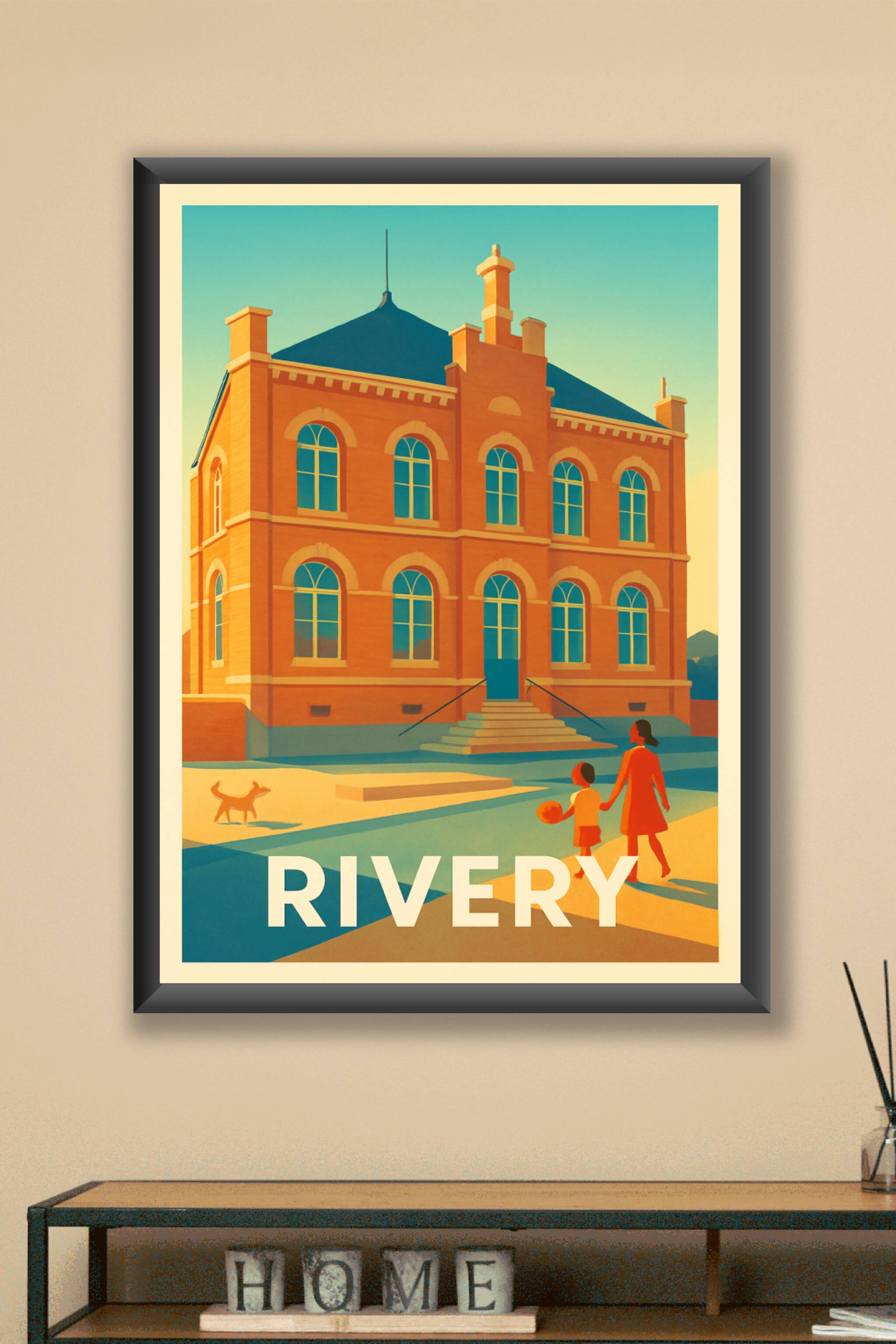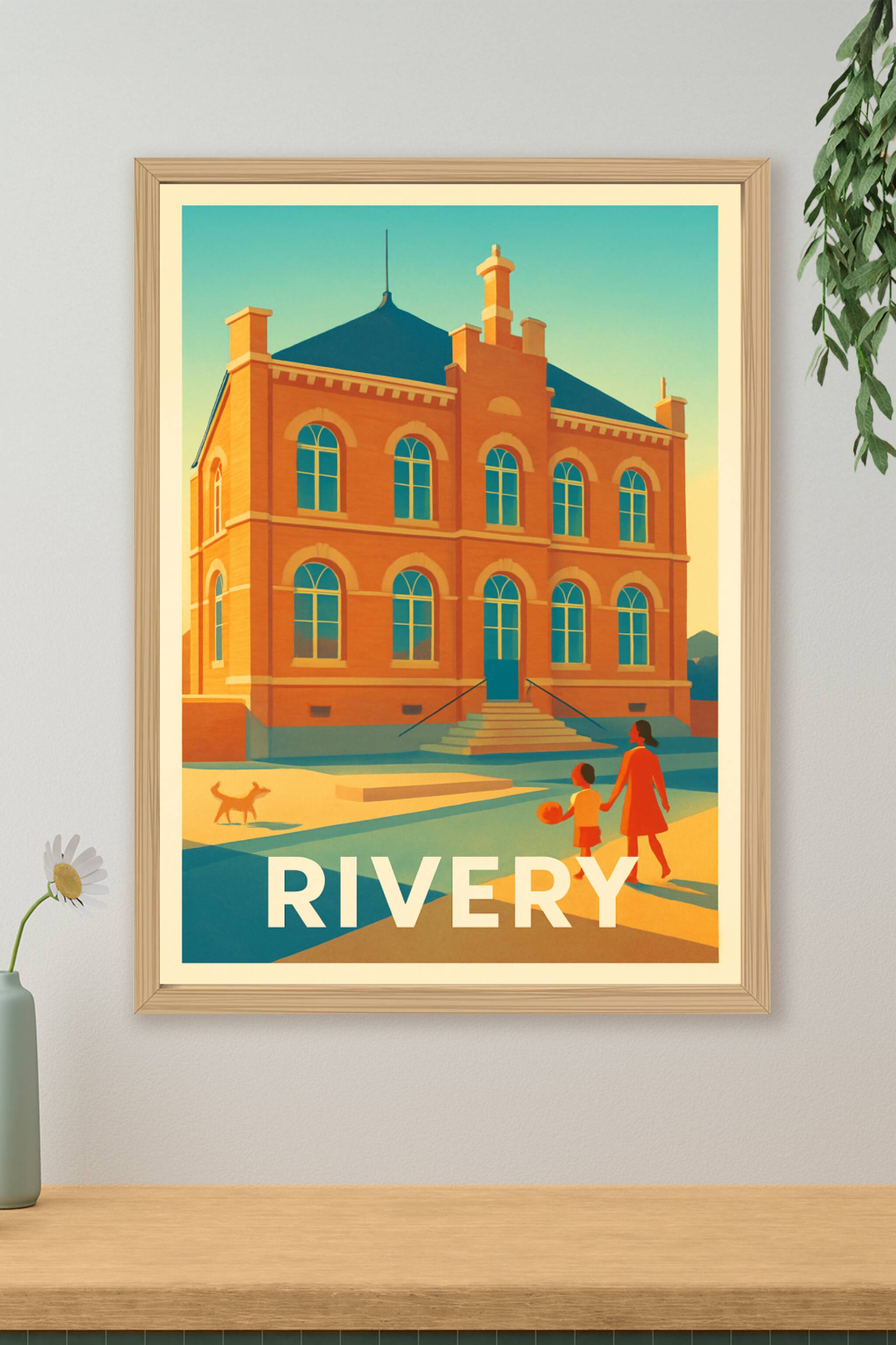 Découvrez ce poster illustrant la beauté emblématique de Rivery à travers une architecture aux teintes chaudes et lumineuses, capturant une scène p...