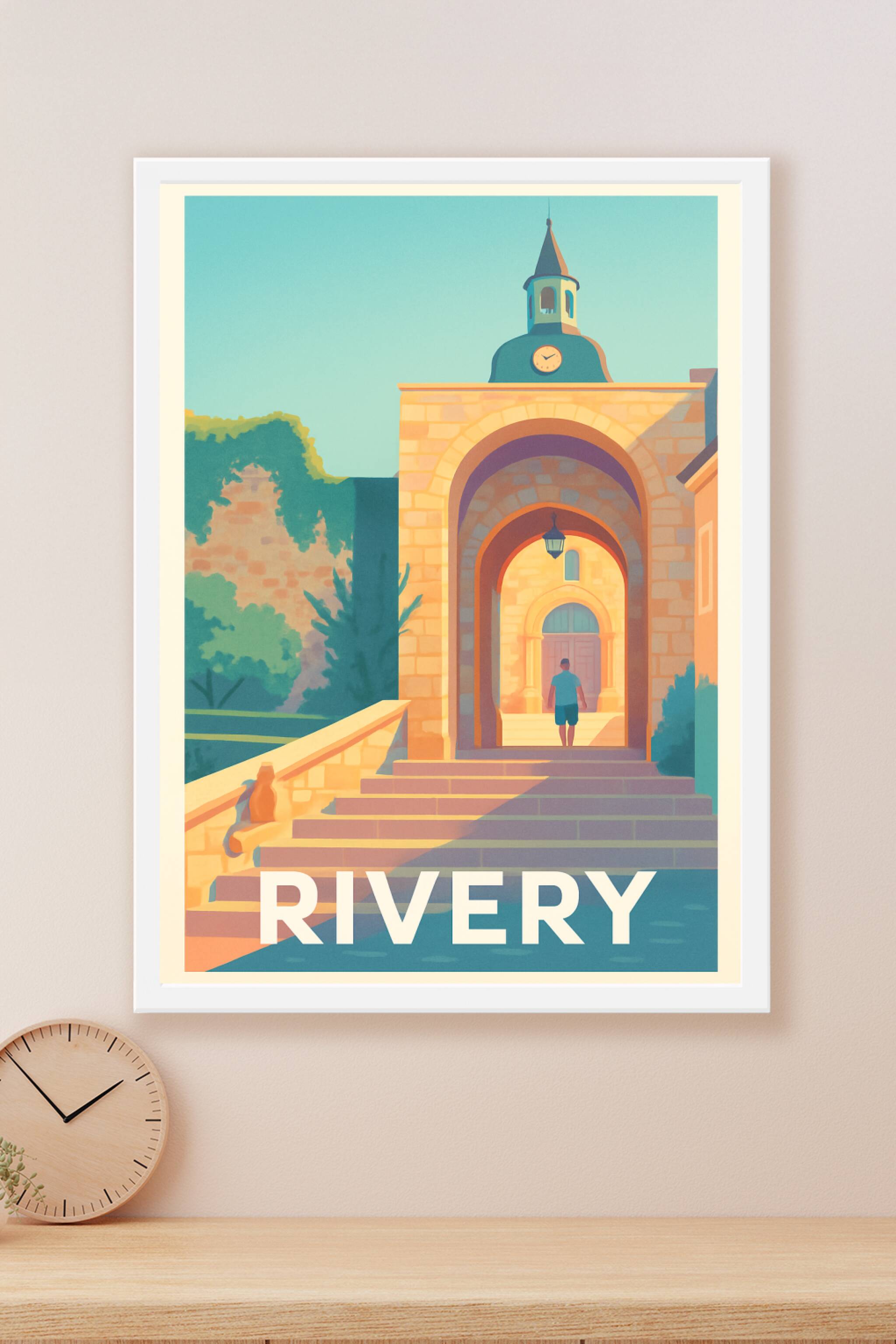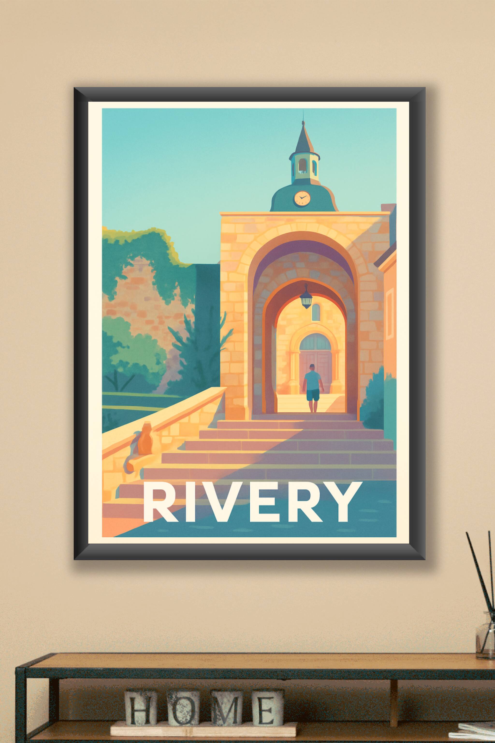 Découvrez la beauté intemporelle de Rivery à travers cette affiche élégante qui capture un instant de calme et de lumière dorée sur une architectur...