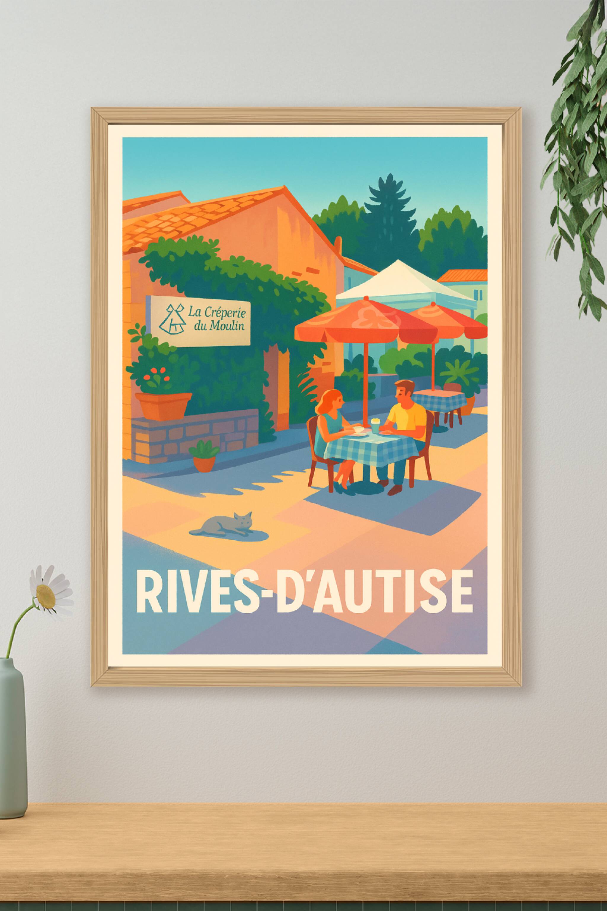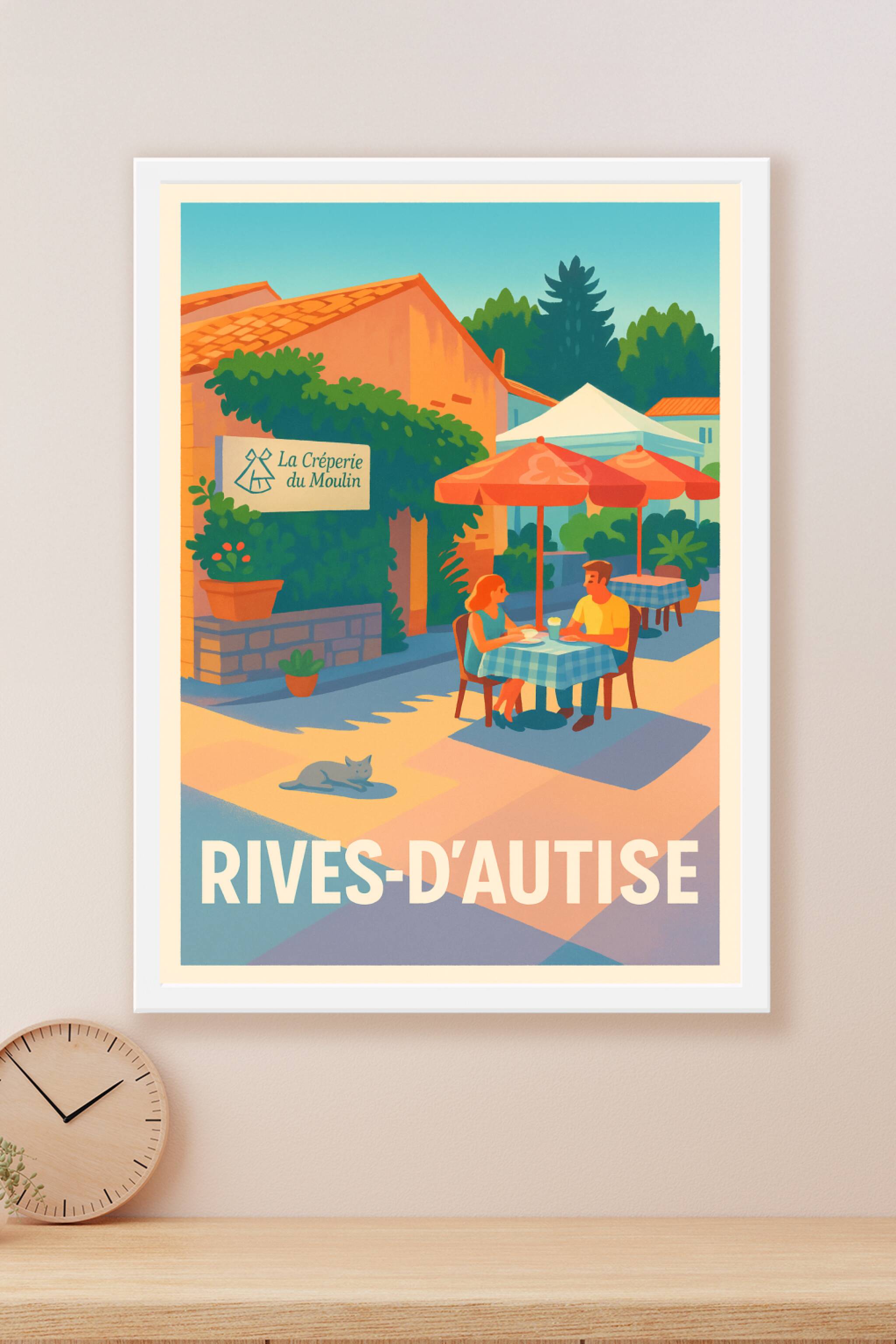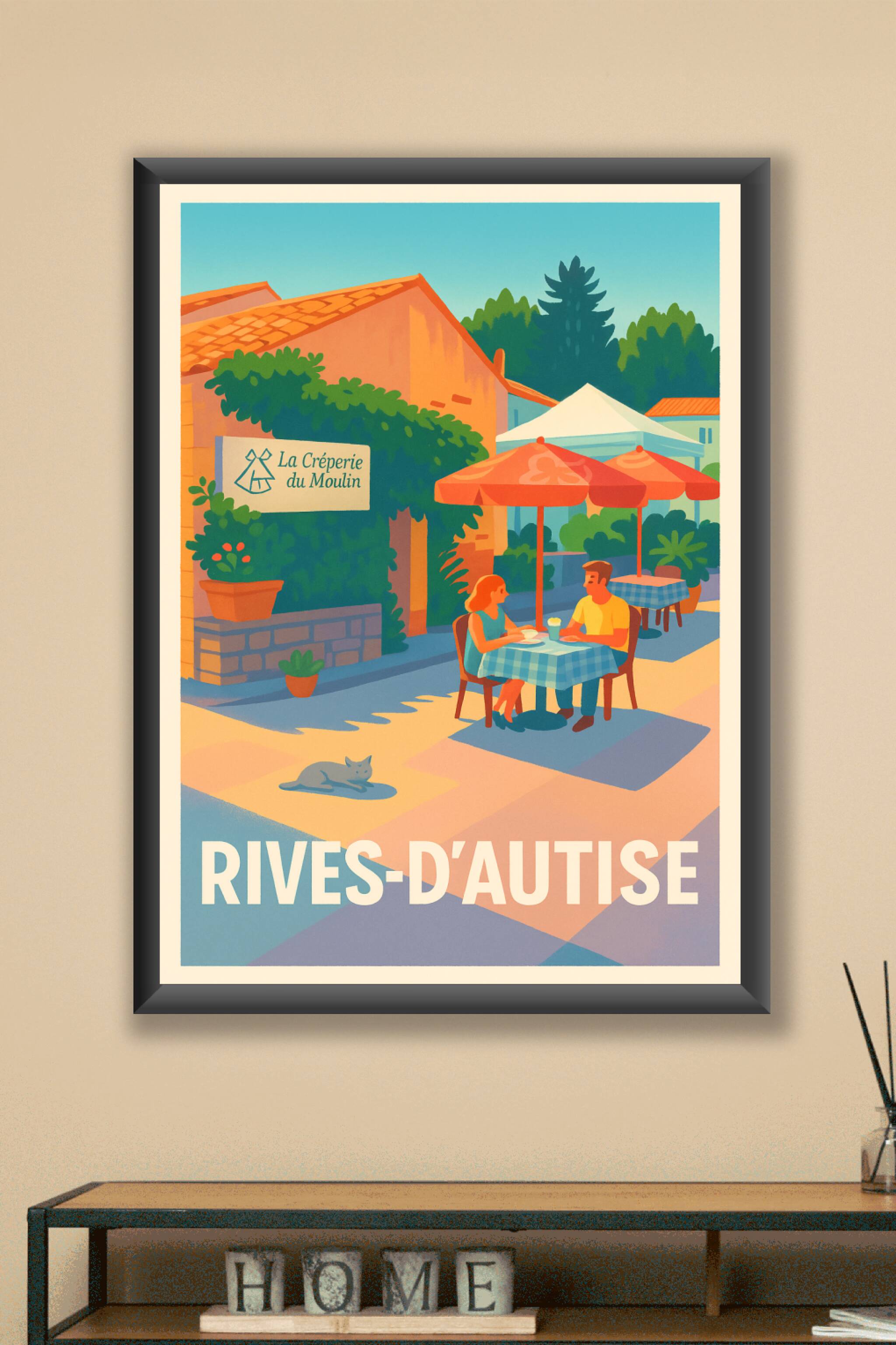 Découvrez l'atmosphère conviviale et paisible de Rives-d'Autise avec cette affiche illustrée mettant en scène une terrasse ensoleillée où se côtoie...