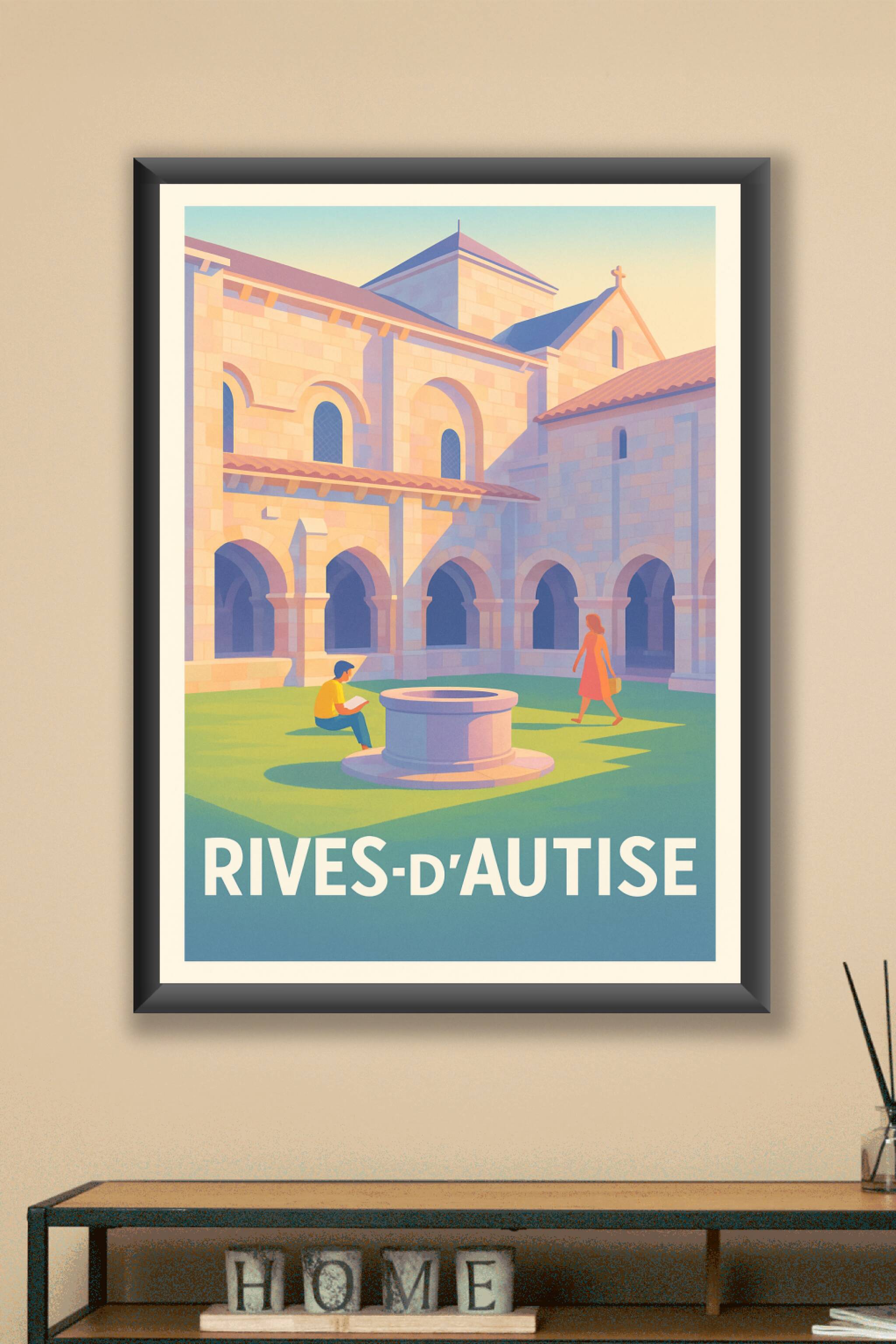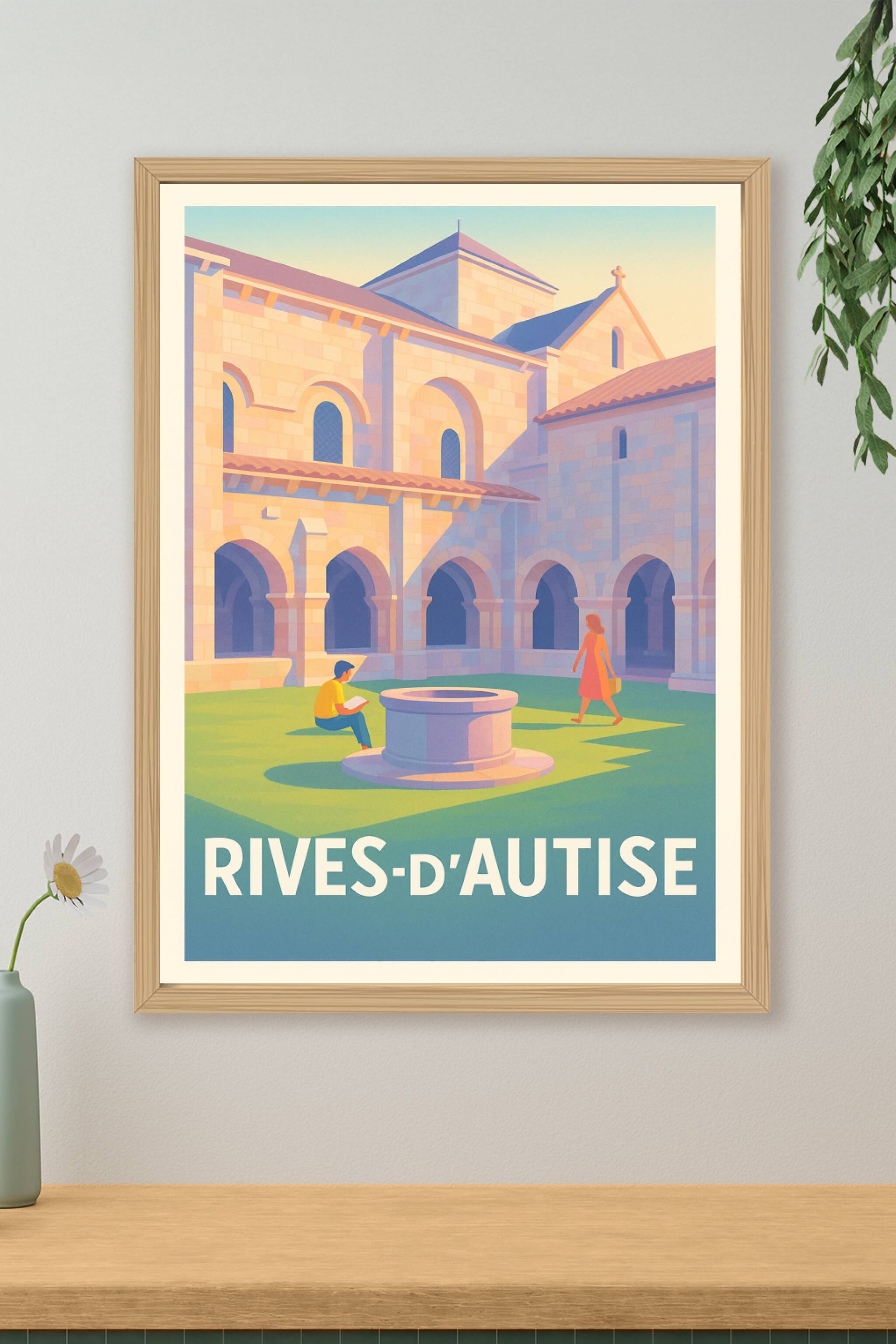 Découvrez la douceur de vivre à Rives-d'Autise avec cette affiche illustrée mettant en scène la paix et la beauté architecturale de son abbaye. Le ...