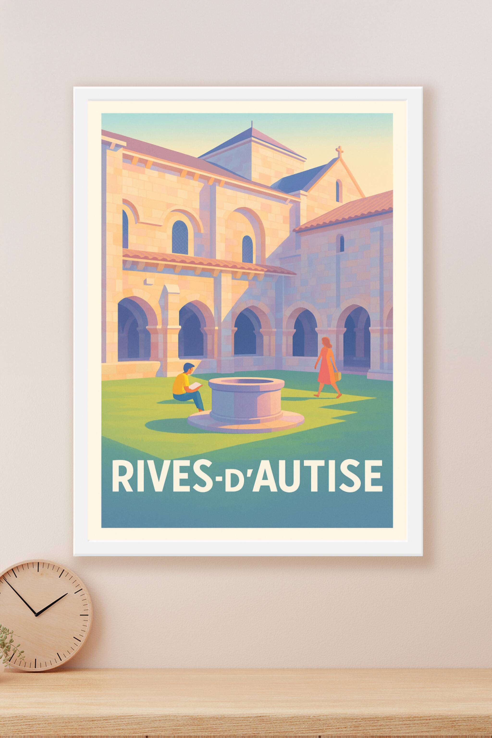 Découvrez la douceur de vivre à Rives-d'Autise avec cette affiche illustrée mettant en scène la paix et la beauté architecturale de son abbaye. Le poster capture l'ambiance lumineuse et apaisante d'un cloître, sublimée par des couleurs chaudes et harmonieuses. Imprimée en tirage "Fine Art" sur un papier 305g coton de haute qualité, cette affiche ravira les amateurs d'art et de patrimoine. Elle est disponible en formats A1 à A4, avec ou sans cadre, pour s'adapter parfaitement à votre décoration intérieure. Offrez-vous ou à vos proches un souvenir élégant de cette destination pleine de charme, grâce à une impression premium 100% fabriquée en France.