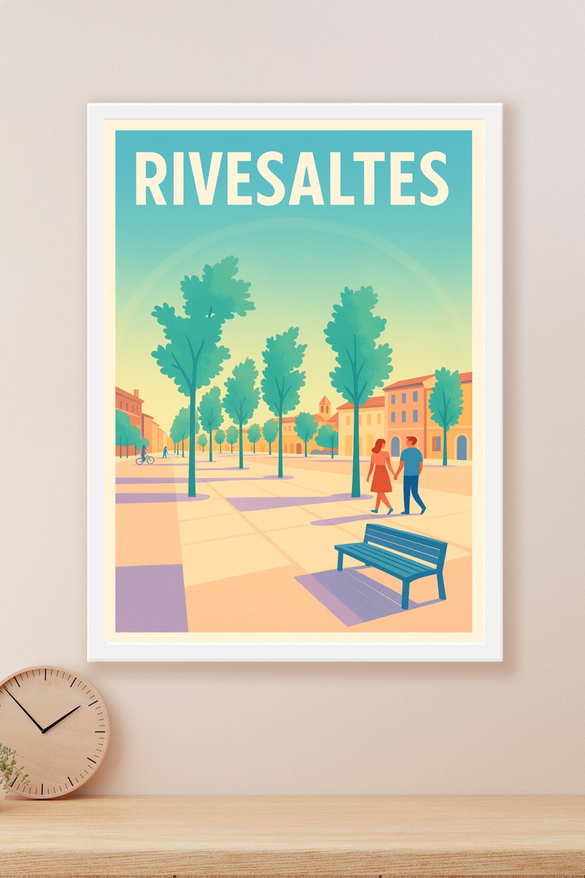 Découvrez la douceur de vivre méditerranéenne avec cette affiche au style rétro illustrant une promenade paisible dans les rues ensoleillées de Riv...