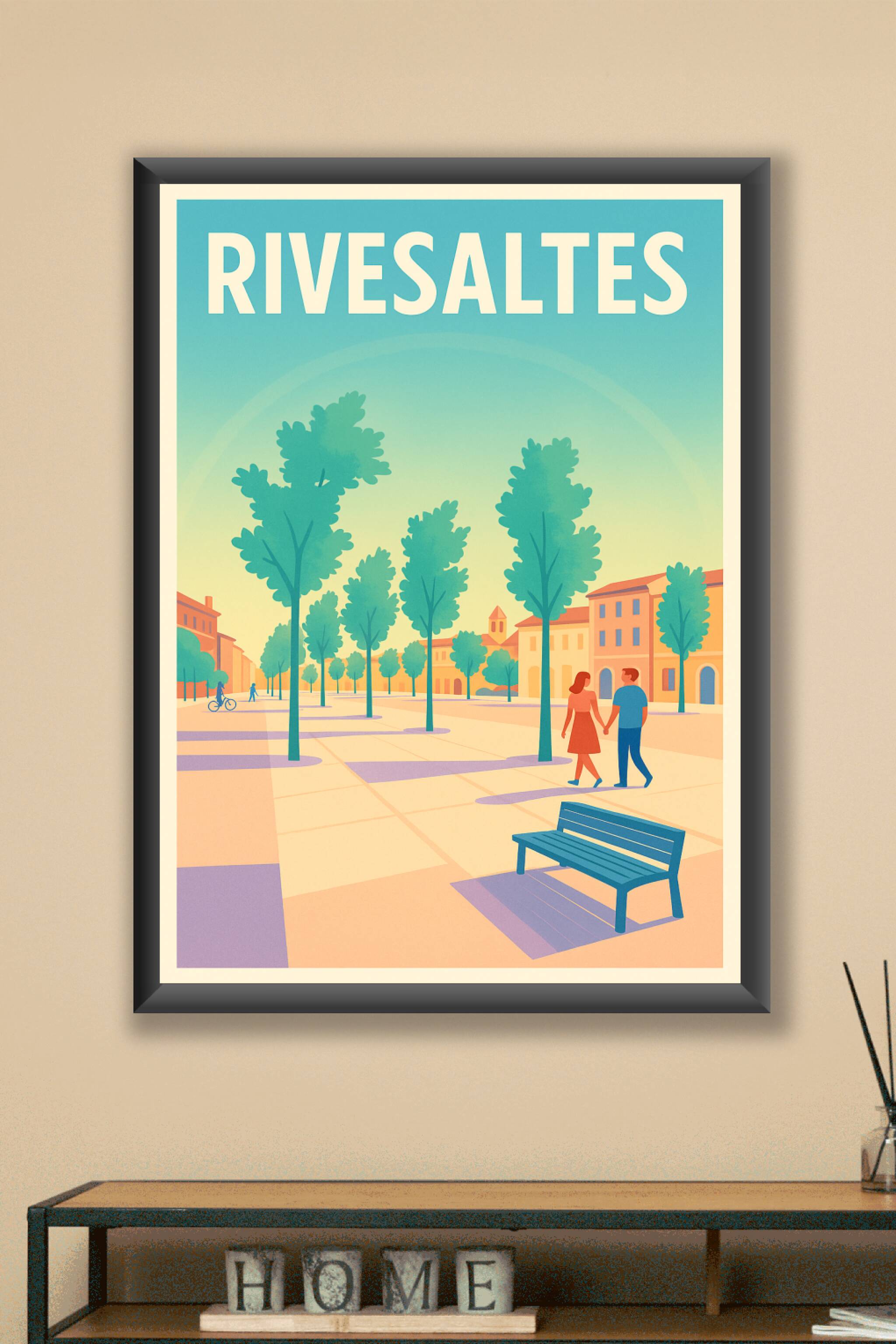 Découvrez la douceur de vivre méditerranéenne avec cette affiche au style rétro illustrant une promenade paisible dans les rues ensoleillées de Rivesaltes. Ce poster met en scène une atmosphère chaleureuse et apaisante, idéale pour apporter une touche de sérénité et d'élégance à votre décoration intérieure. Imprimé en tirage "Fine Art" sur papier 305g coton, ce poster assure une qualité d'impression exceptionnelle, des couleurs vibrantes et une durabilité remarquable. Disponible en plusieurs formats du A1 au A4, avec ou sans cadre, ce poster saura s’adapter à tous les espaces, qu’il s’agisse de embellir un salon, un bureau ou une chambre. Offrez-vous une œuvre d’art authentique et raffinée, fabriquée avec soin en France, pour célébrer la beauté inattendue de Rivesaltes.