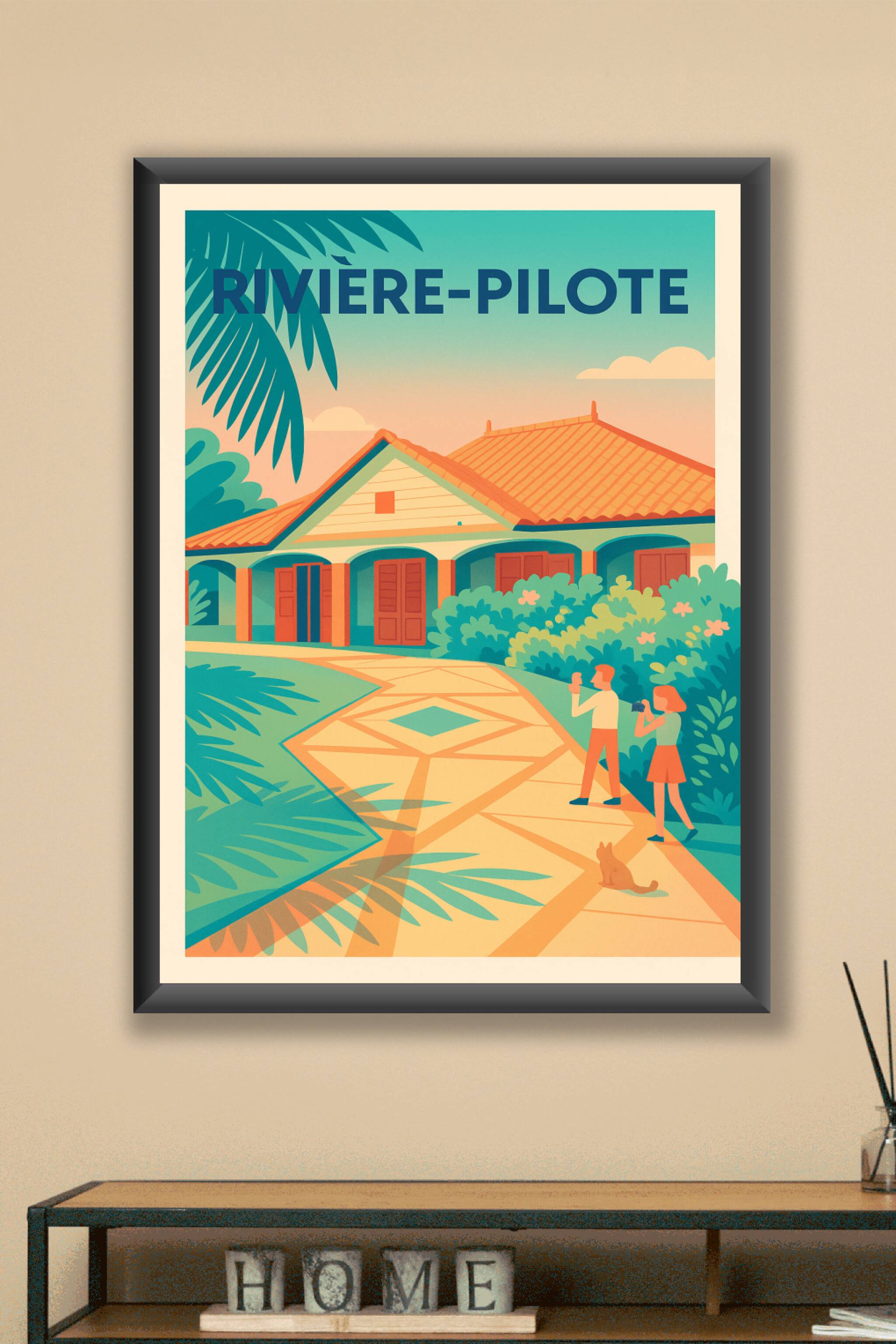 Découvrez l'élégance tranquille de Rivière-Pilote avec cette affiche illustrée au style vintage doucement coloré. Ce poster met en avant une maison...