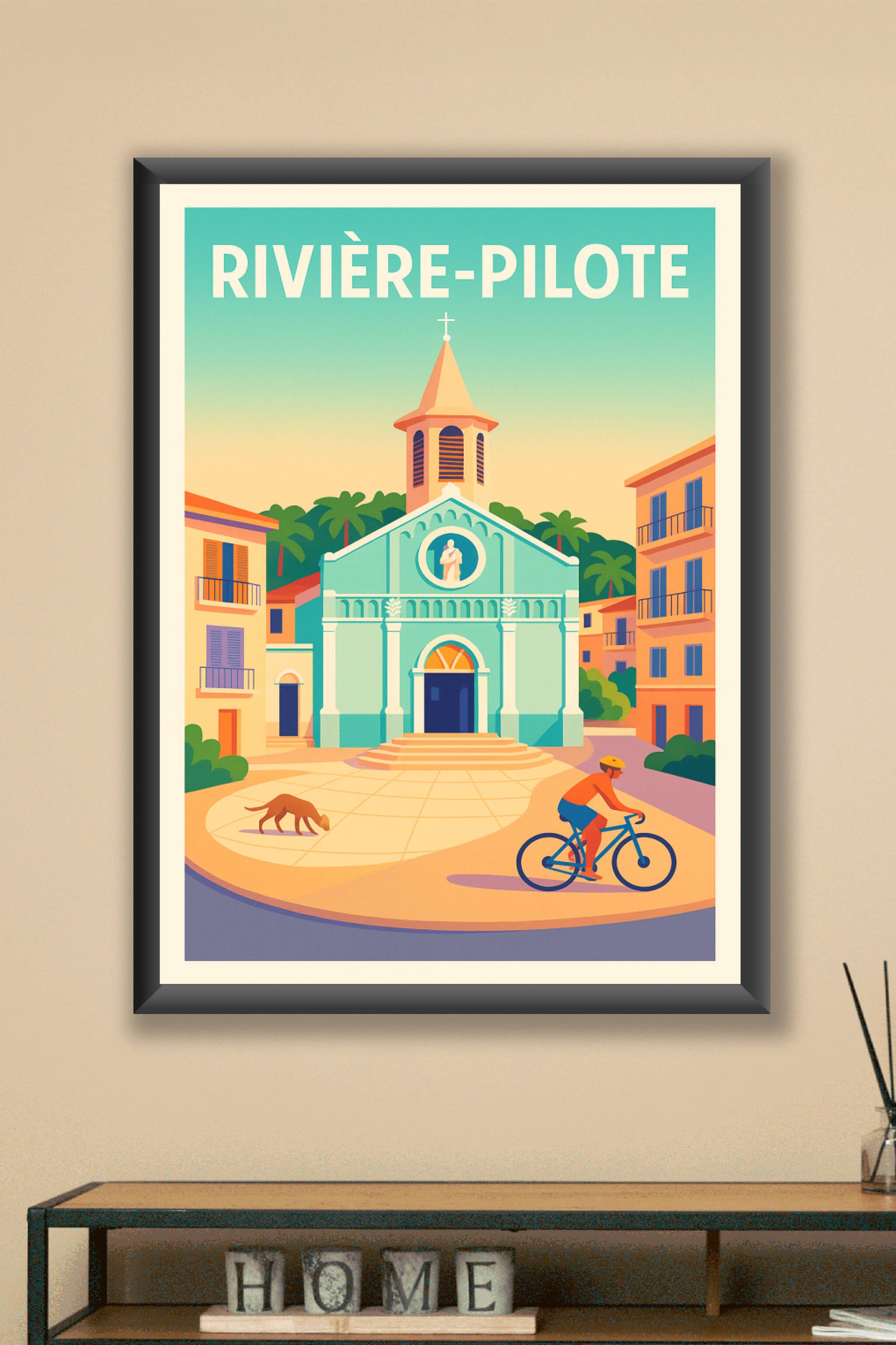 Découvrez l'atmosphère paisible et ensoleillée de Rivière-Pilote avec cette affiche illustrée au style rétro-vintage. La scène met en avant une charmante église aux tons doux entourée de végétation tropicale et de bâtiments colorés, incarnant parfaitement l’ambiance chaleureuse de cette ville martiniquaise. Ce poster est imprimé en tirage "Fine Art" sur un papier coton 305g de haute qualité, garantissant des couleurs éclatantes et une durabilité optimale. Disponible en formats A1 à A4, avec ou sans cadre, cette affiche apportera une touche d’exotisme et d’élégance à votre décoration intérieure. Offrez-vous un souvenir authentique ou un cadeau raffiné avec ce tirage premium, 100% fabriqué en France.