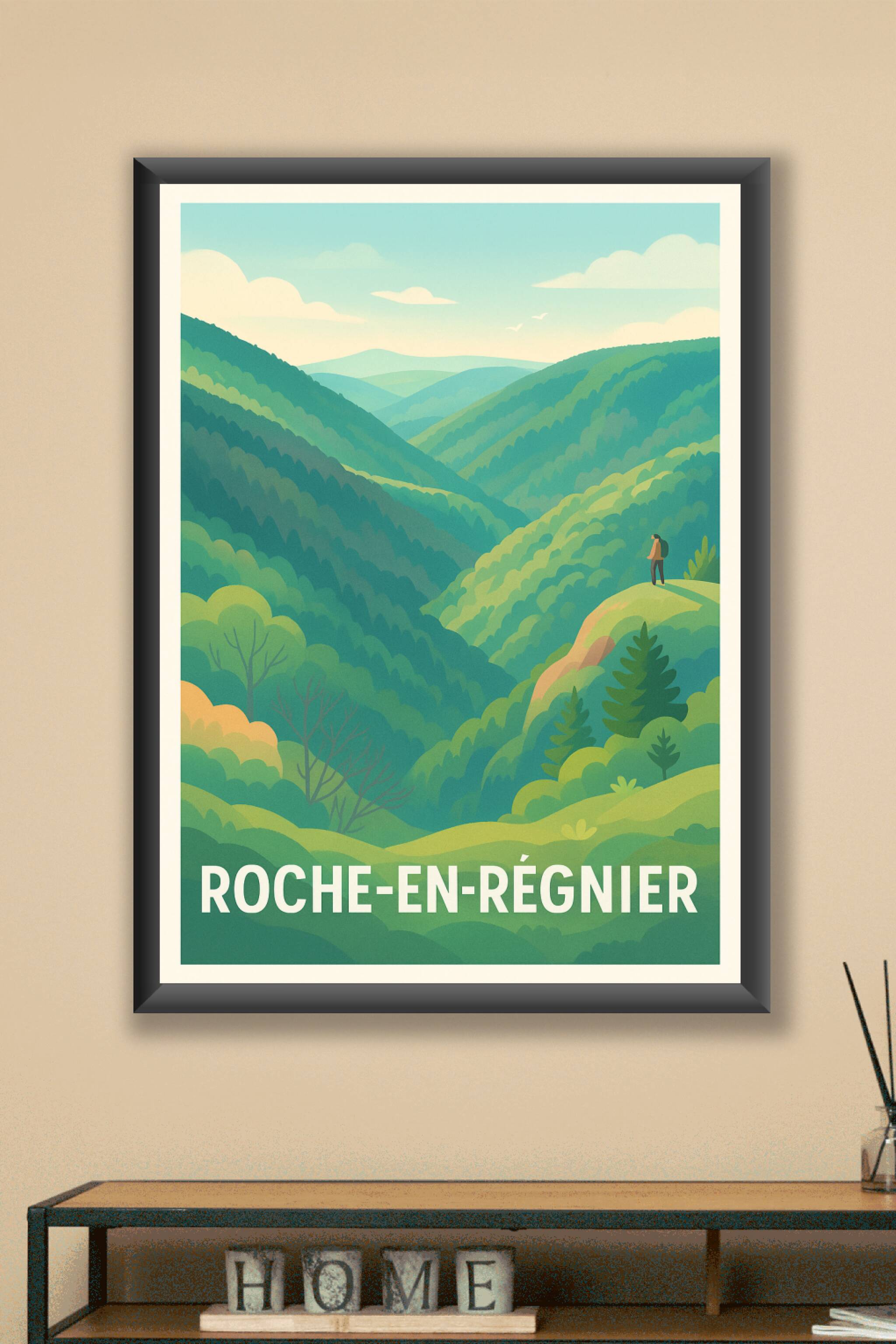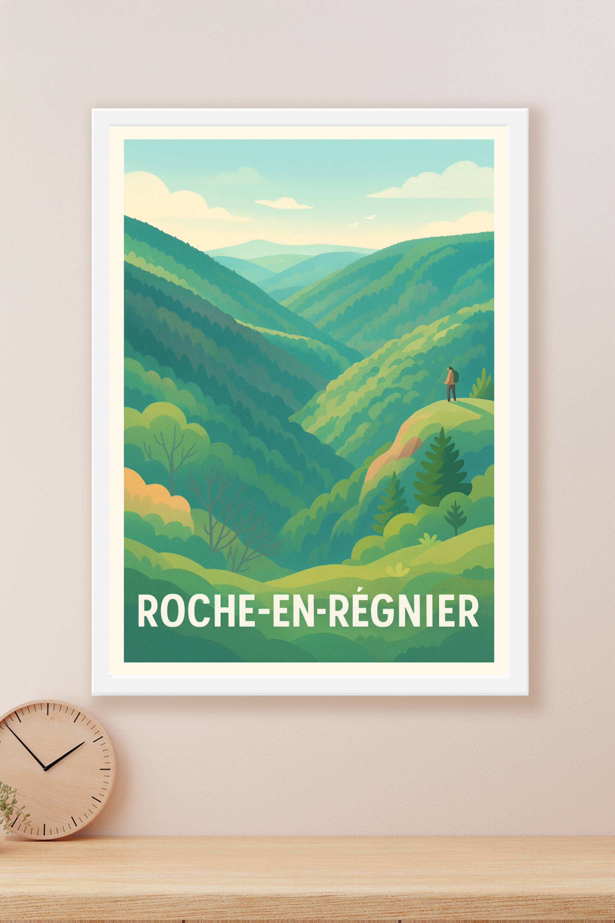 Découvrez la beauté naturelle de Roche-en-Régnier avec cette affiche illustrée qui capture les vallées verdoyantes et les paysages apaisants de cet...