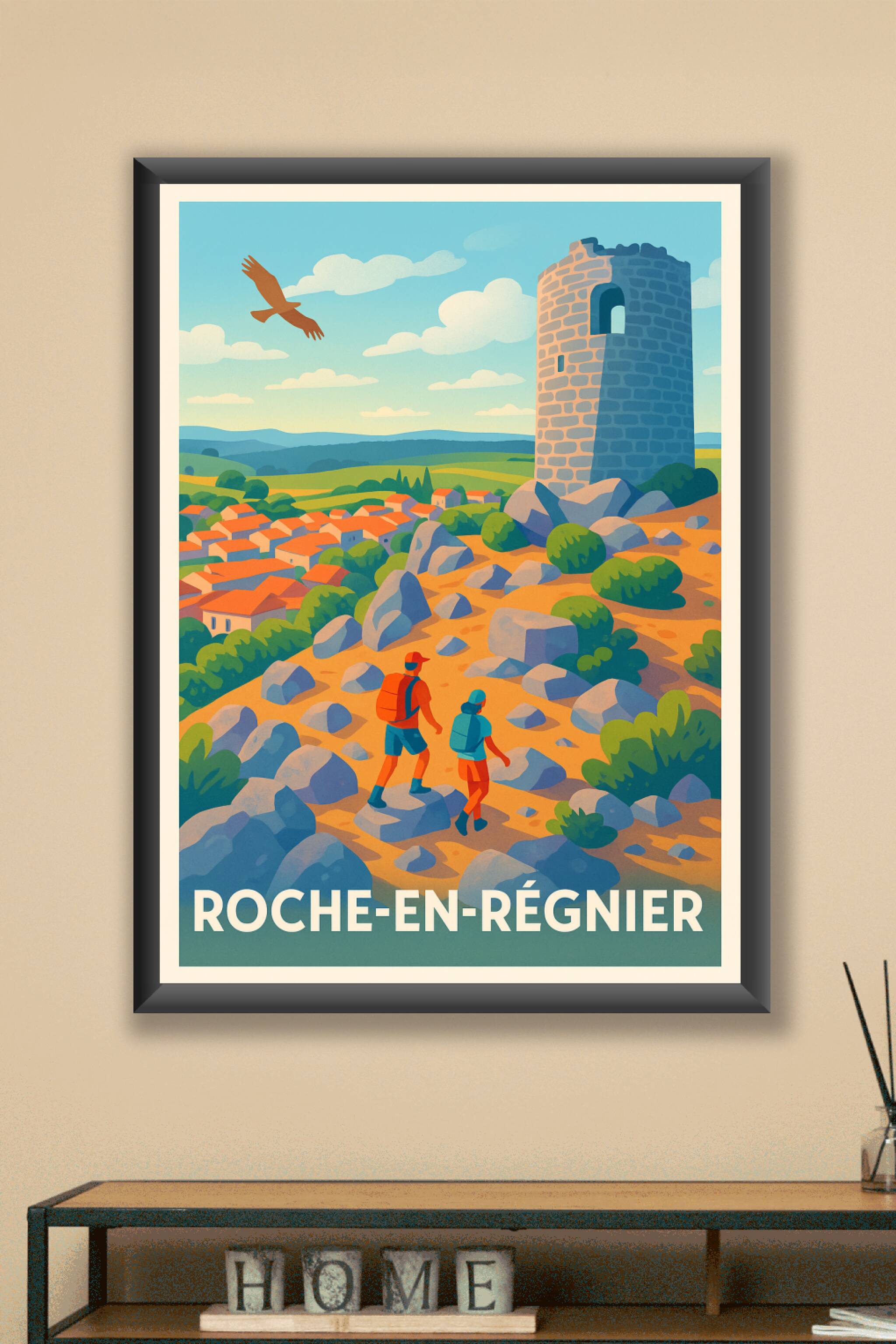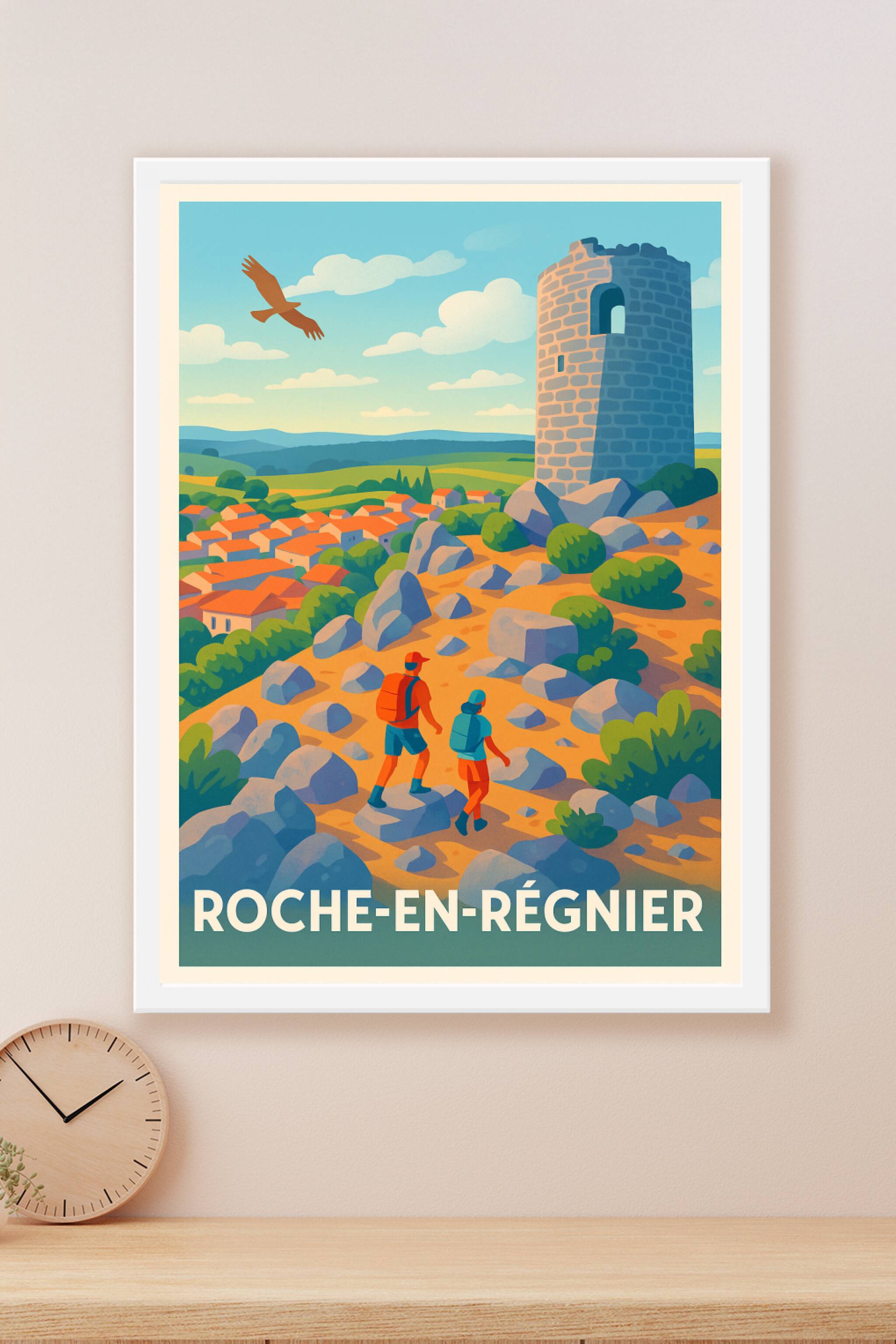 Découvrez la beauté authentique de Roche-en-Régnier avec cette affiche illustrée mettant en scène des randonneurs admirant les paysages vallonnés e...
