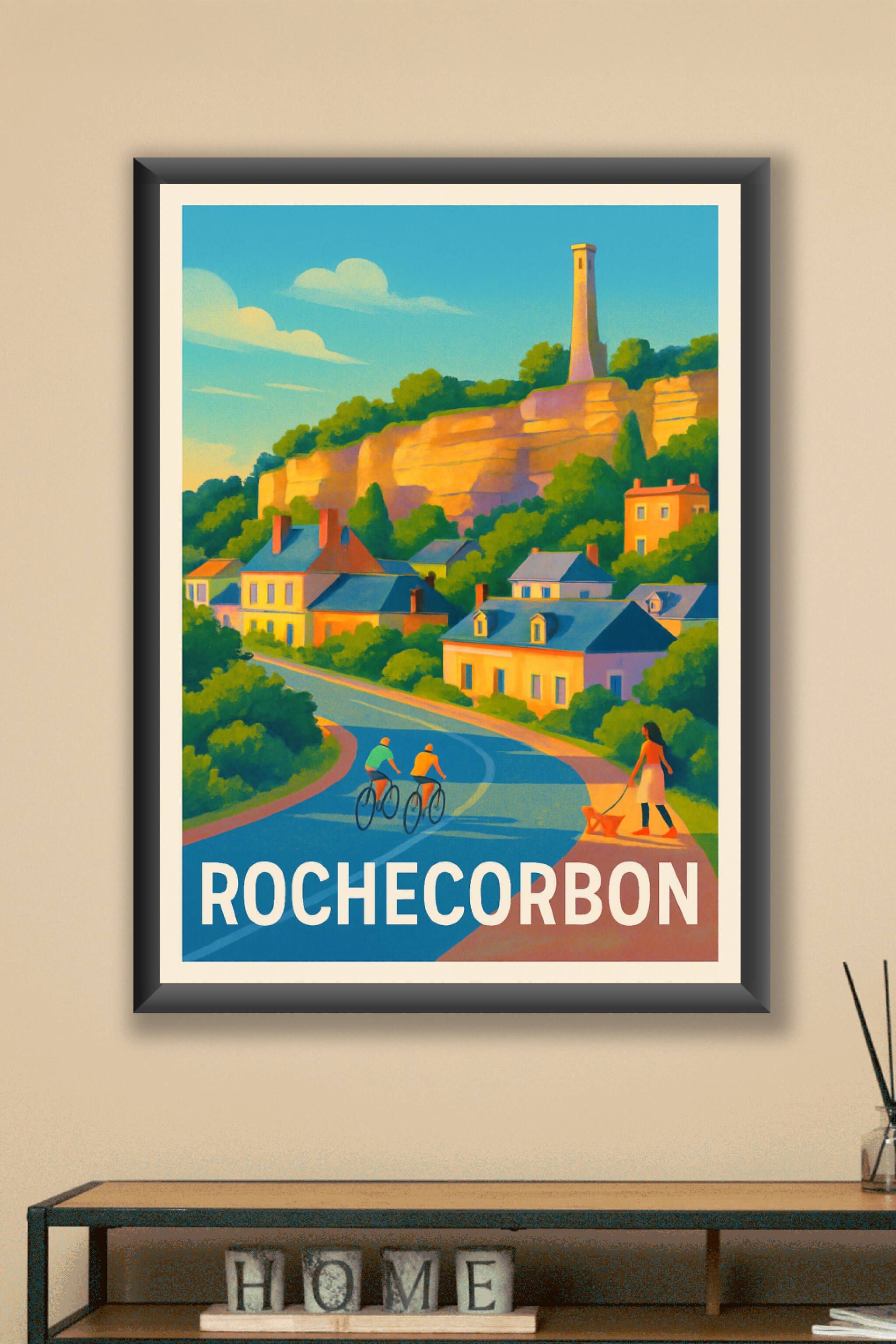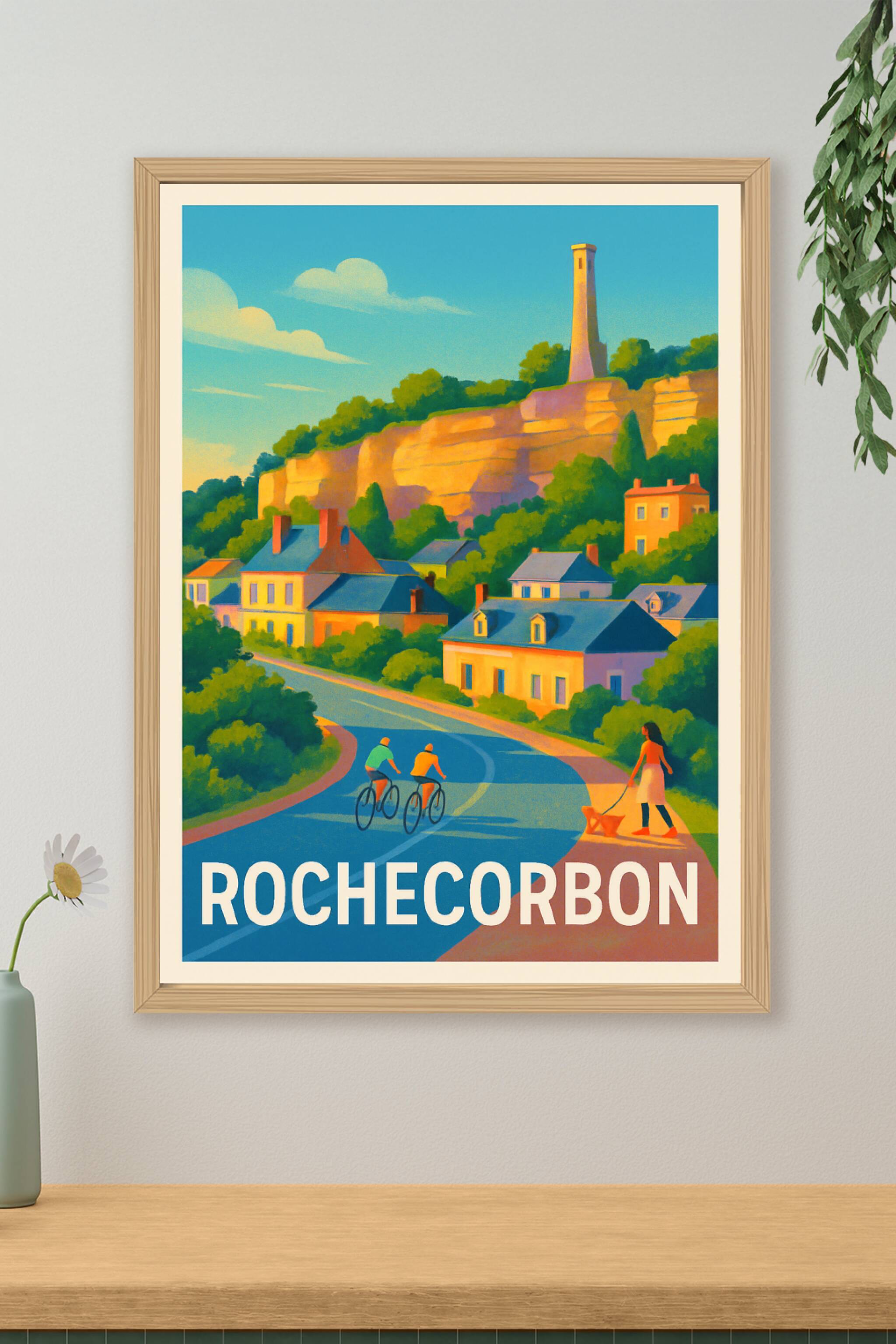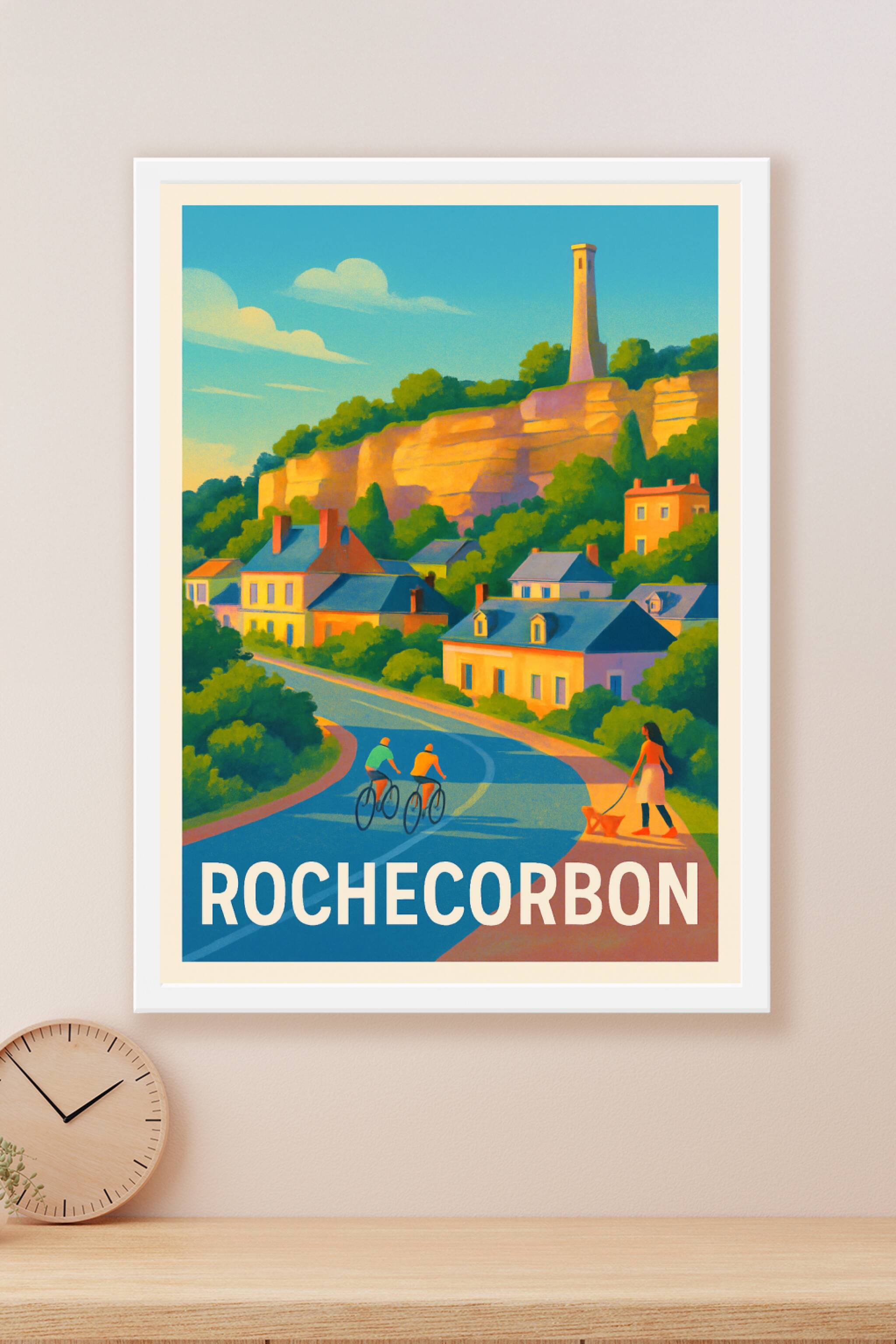 Découvrez l'atmosphère paisible et lumineuse de Rochecorbon avec cette affiche au style rétro illustrant ses maisons colorées nichées au pied des falaises dorées. Deux cyclistes et une promeneuse avec son chien ajoutent une note de vie à cette scène typique de la vallée de la Loire. Ce poster est imprimé en tirage "Fine Art" sur un papier 305g coton de grande qualité offrant une impression nette et des couleurs éclatantes. Disponible en plusieurs formats du A4 au grand format A1, avec ou sans cadre, cette affiche saura embellir votre intérieur tout en vous faisant voyager vers cette destination authentique et accueillante. Une belle idée cadeau ou une façon élégante de rappeler vos souvenirs de vacances en Touraine.