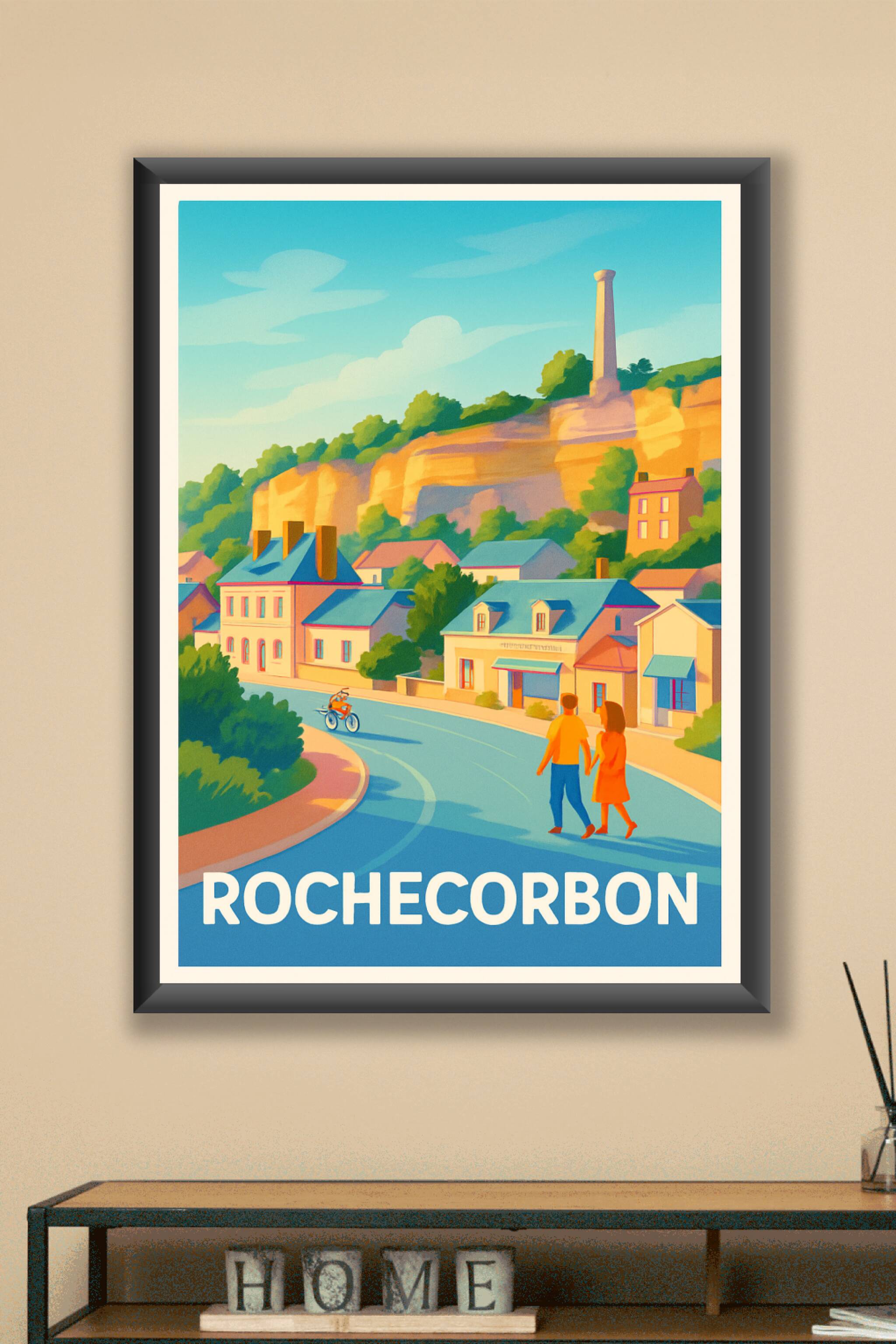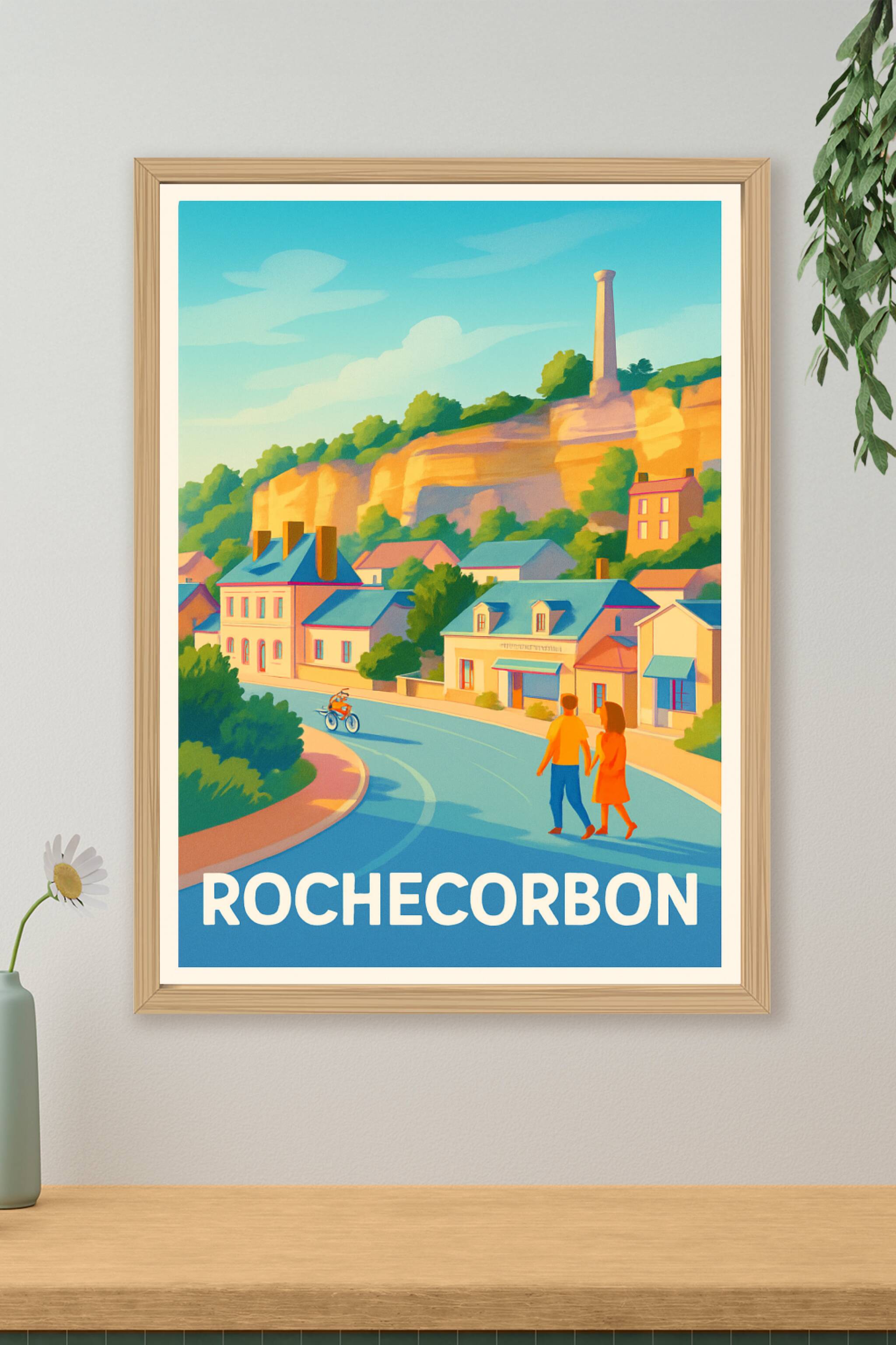 Découvrez l'atmosphère paisible et pittoresque de Rochecorbon avec cette affiche illustrée aux couleurs chaudes et lumineuses. Ce poster met en scè...