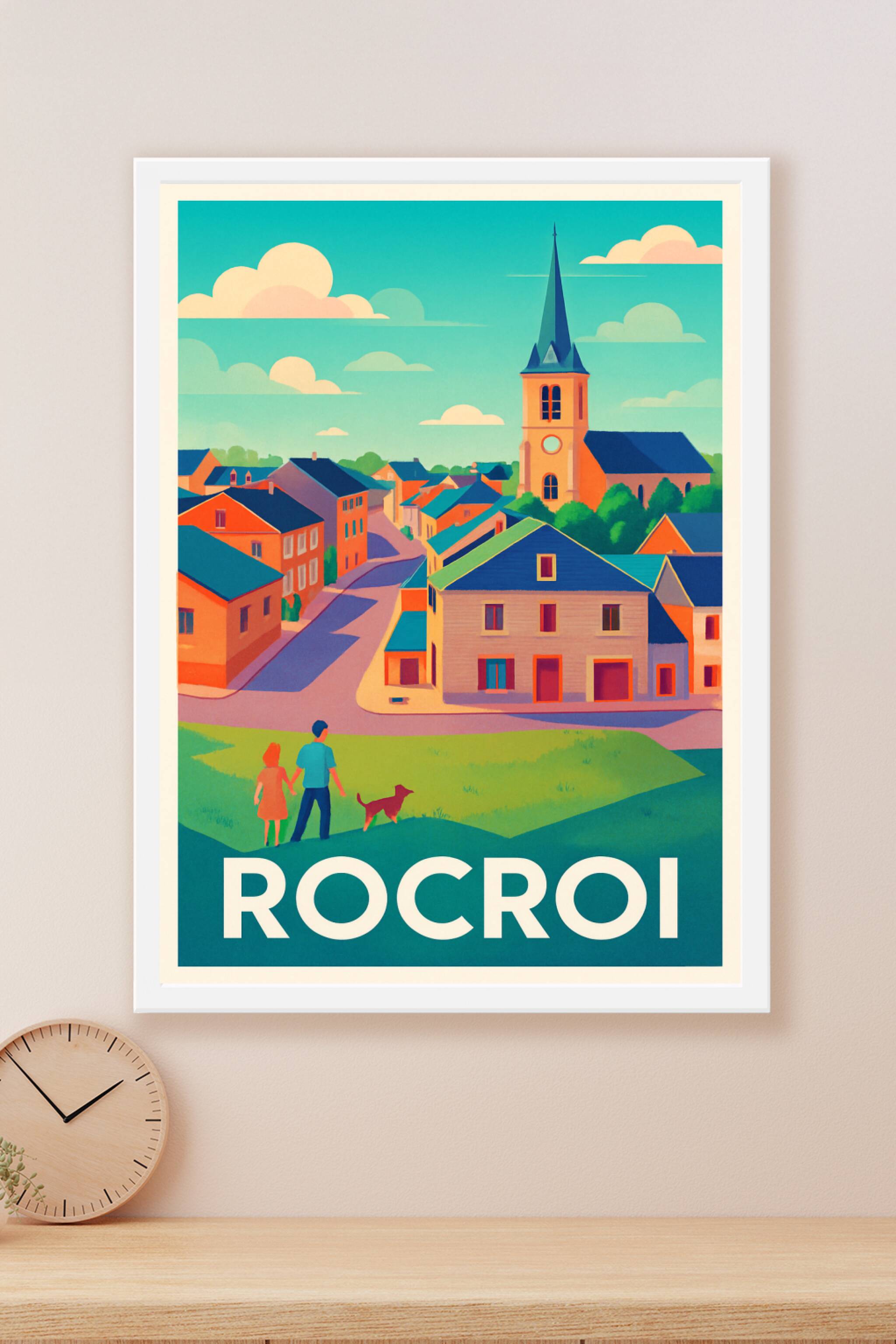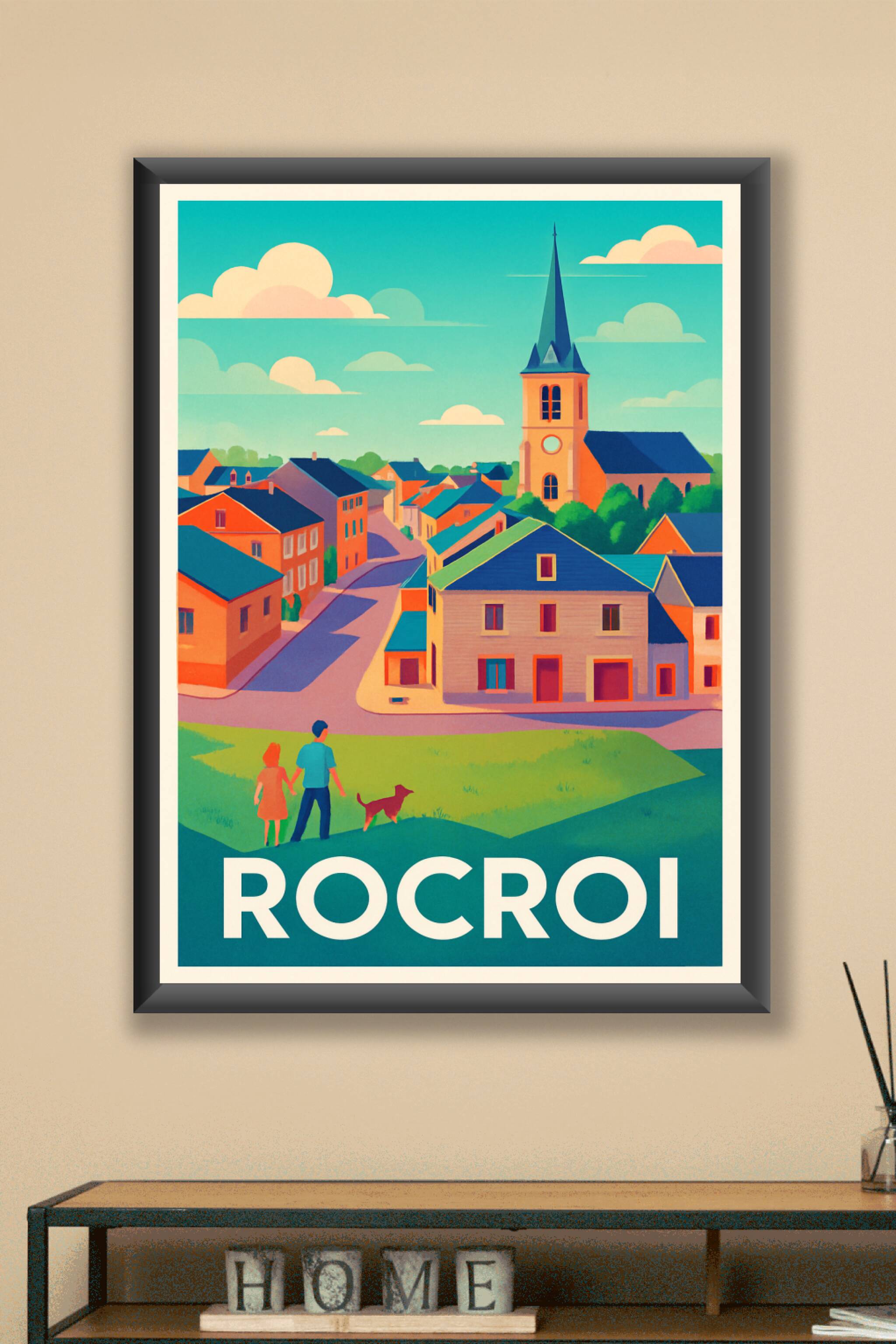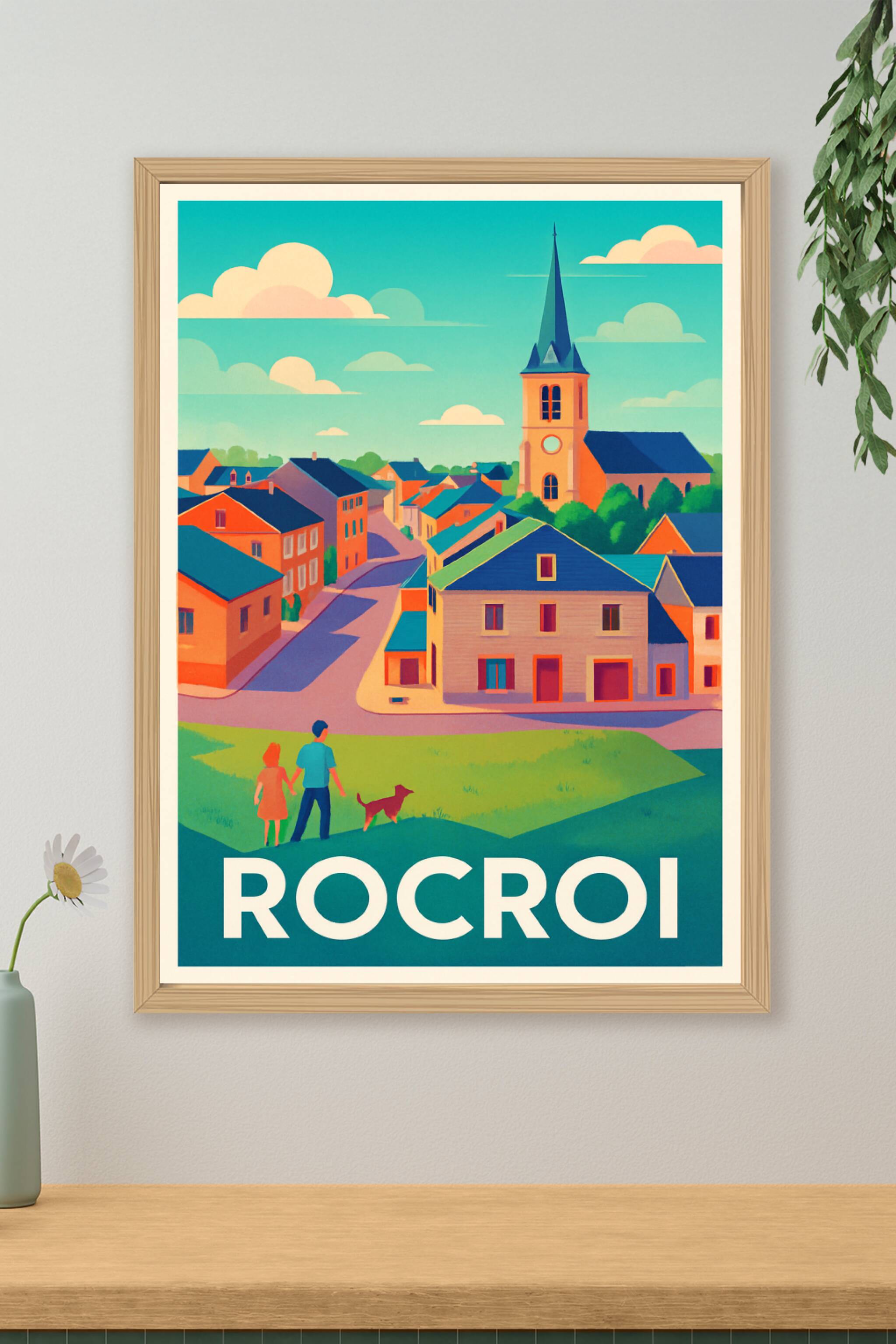 Découvrez Rocroi à travers cette affiche au style coloré et doux, qui capture l’essence paisible de ce village typique avec ses maisons aux toits v...