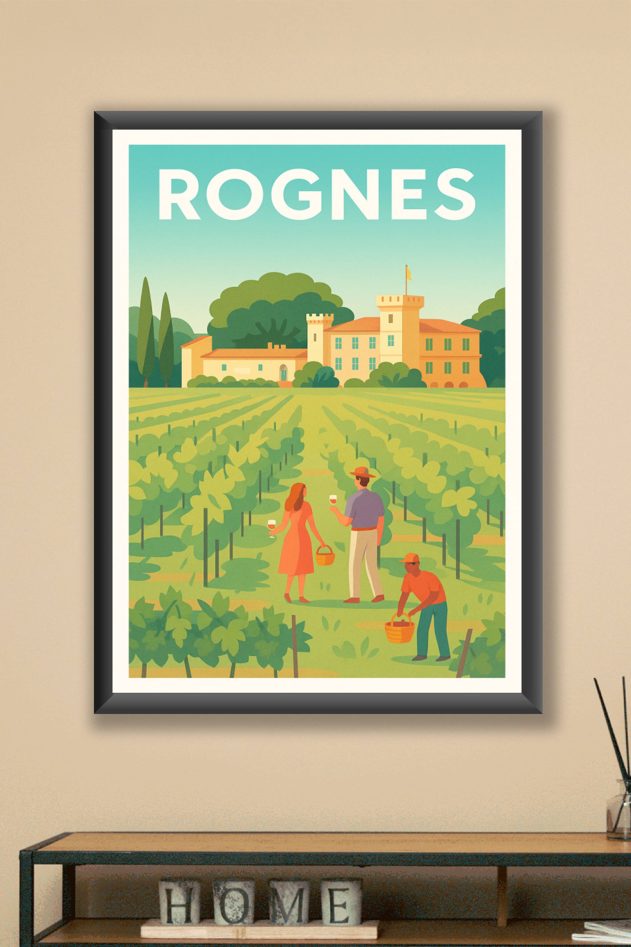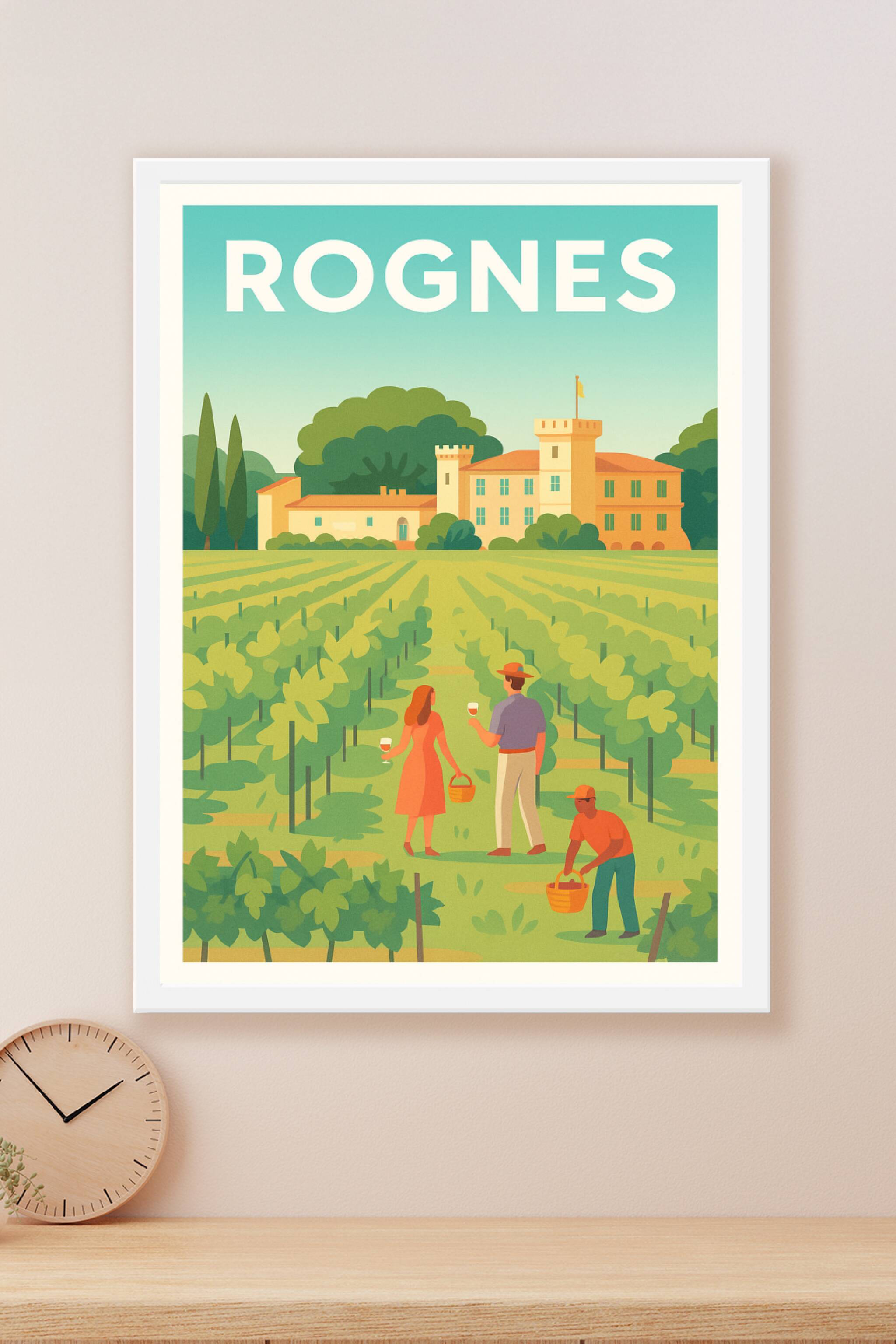 Découvrez l'ambiance paisible et authentique des vignobles de Rognes avec cette affiche au style rétro et coloré. Ce poster illustré met en scène l...