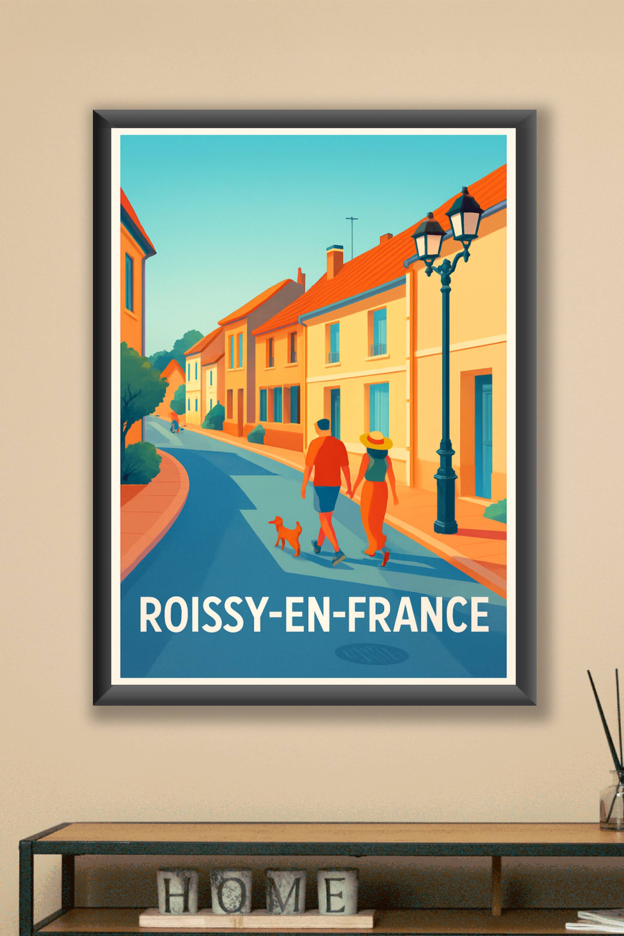 Découvrez l'élégance tranquille de Roissy-en-France avec cette affiche illustrée mettant en scène une promenade ensoleillée dans une rue bordée de ...