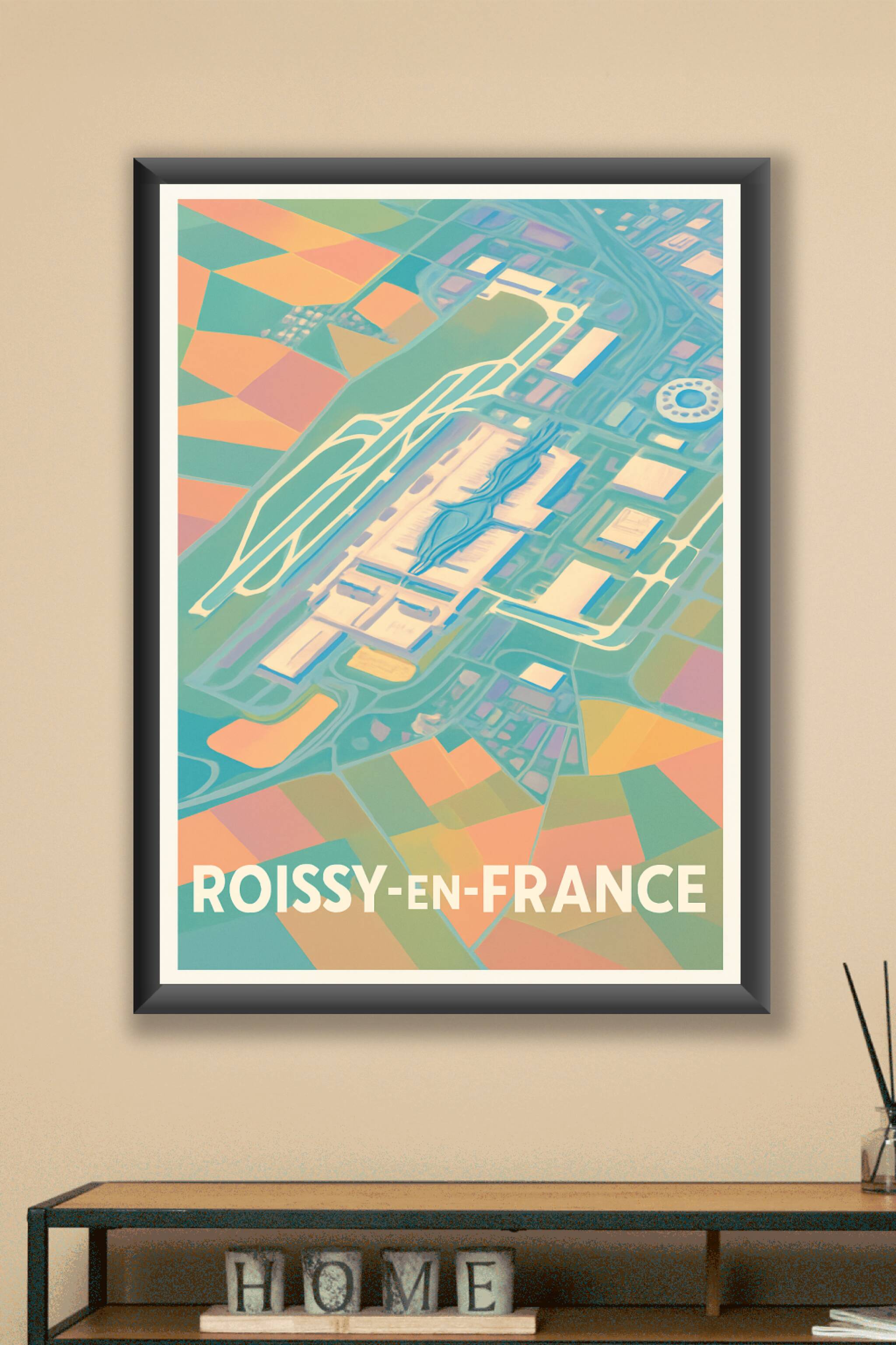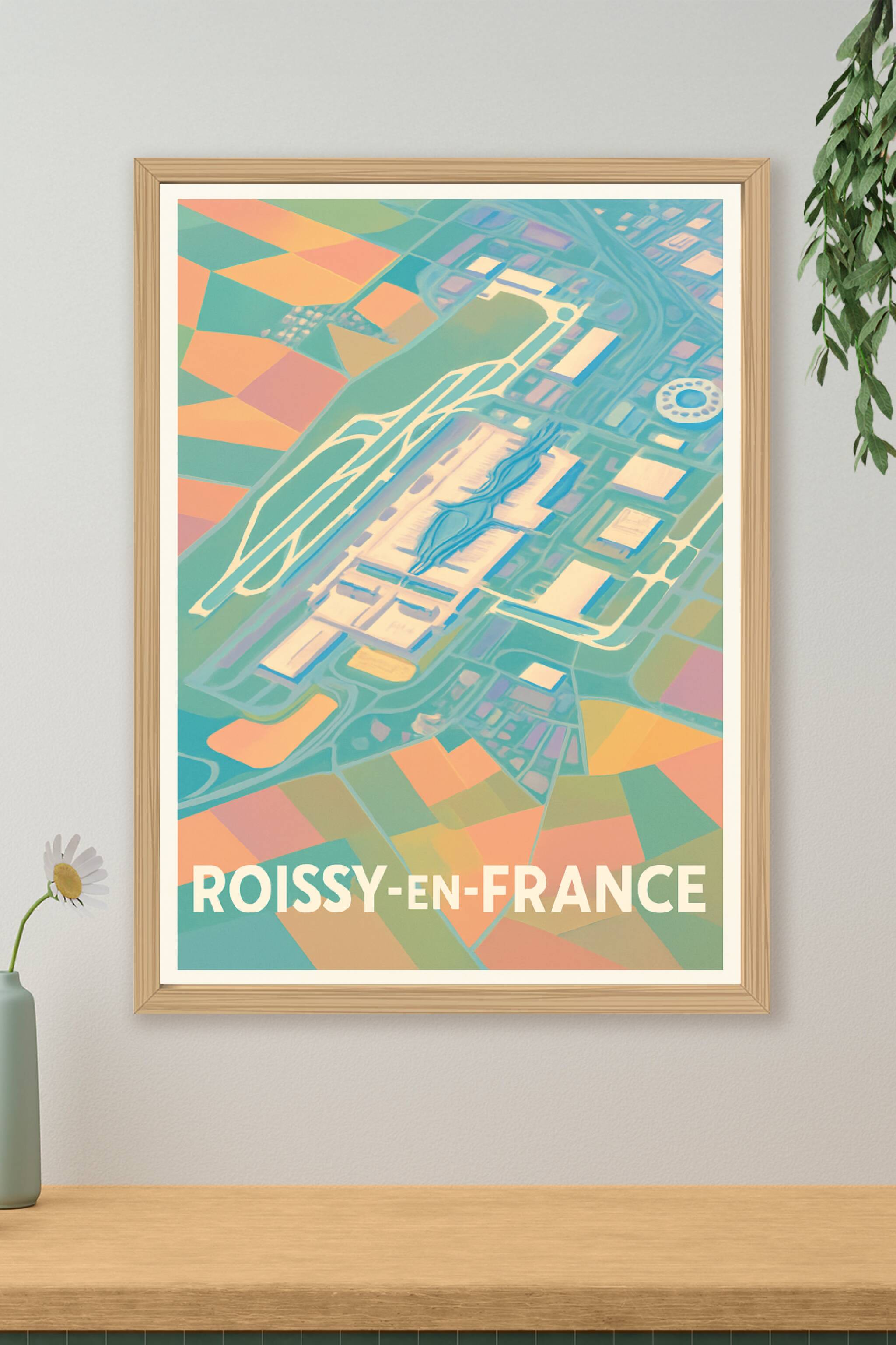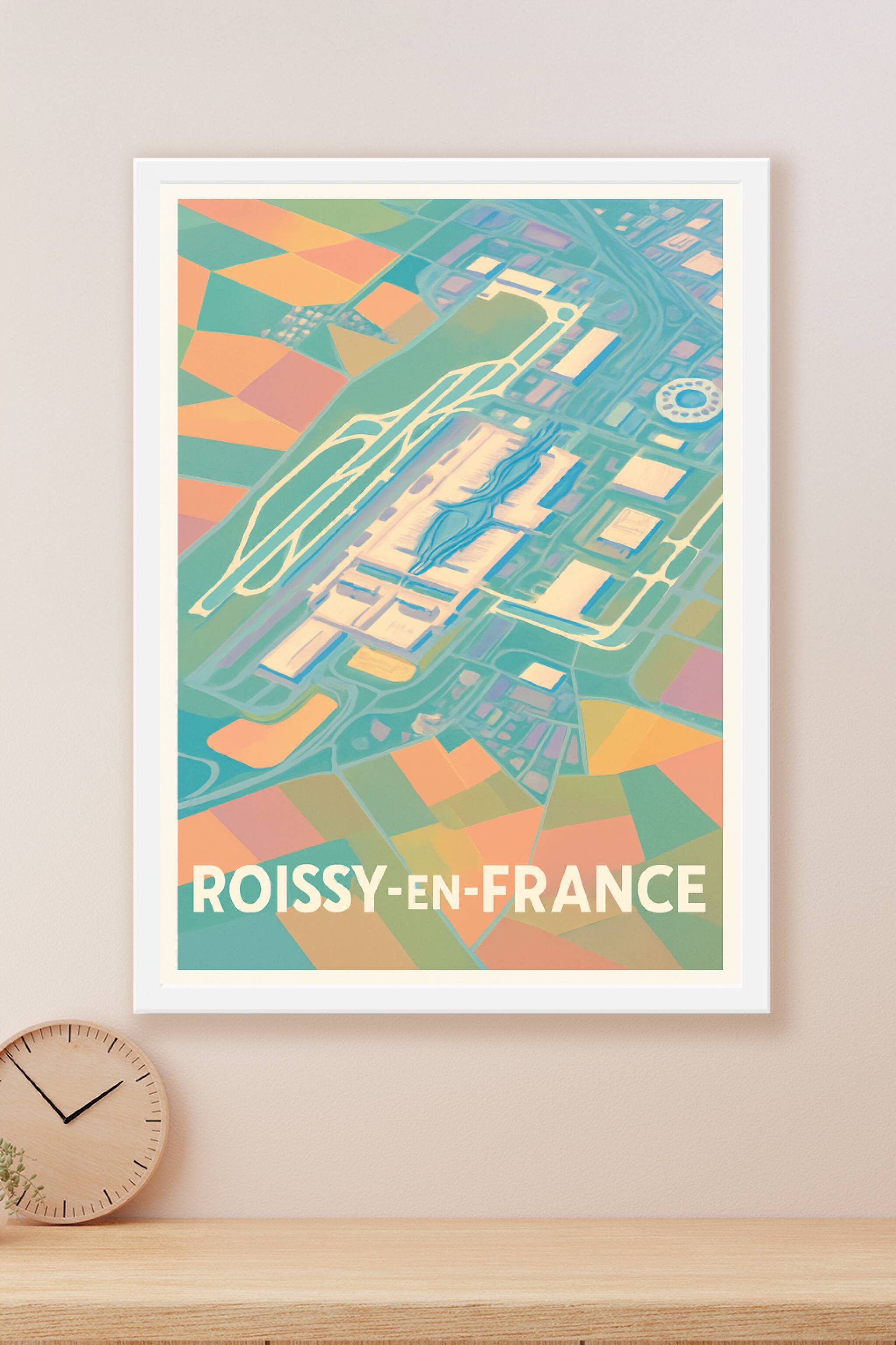 Découvrez cette affiche unique représentant une interprétation artistique de Roissy-en-France, célèbre pour son aéroport international majeur. Ce p...