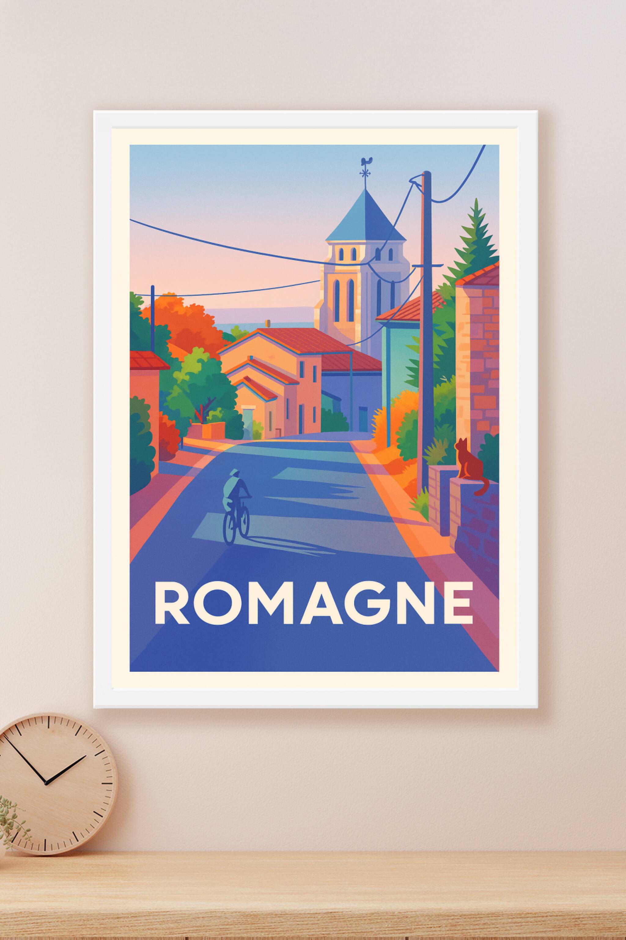 Découvrez l'atmosphère paisible et chaleureuse du village de Romagne à travers cette affiche au style graphique moderne. L'illustration met en scèn...