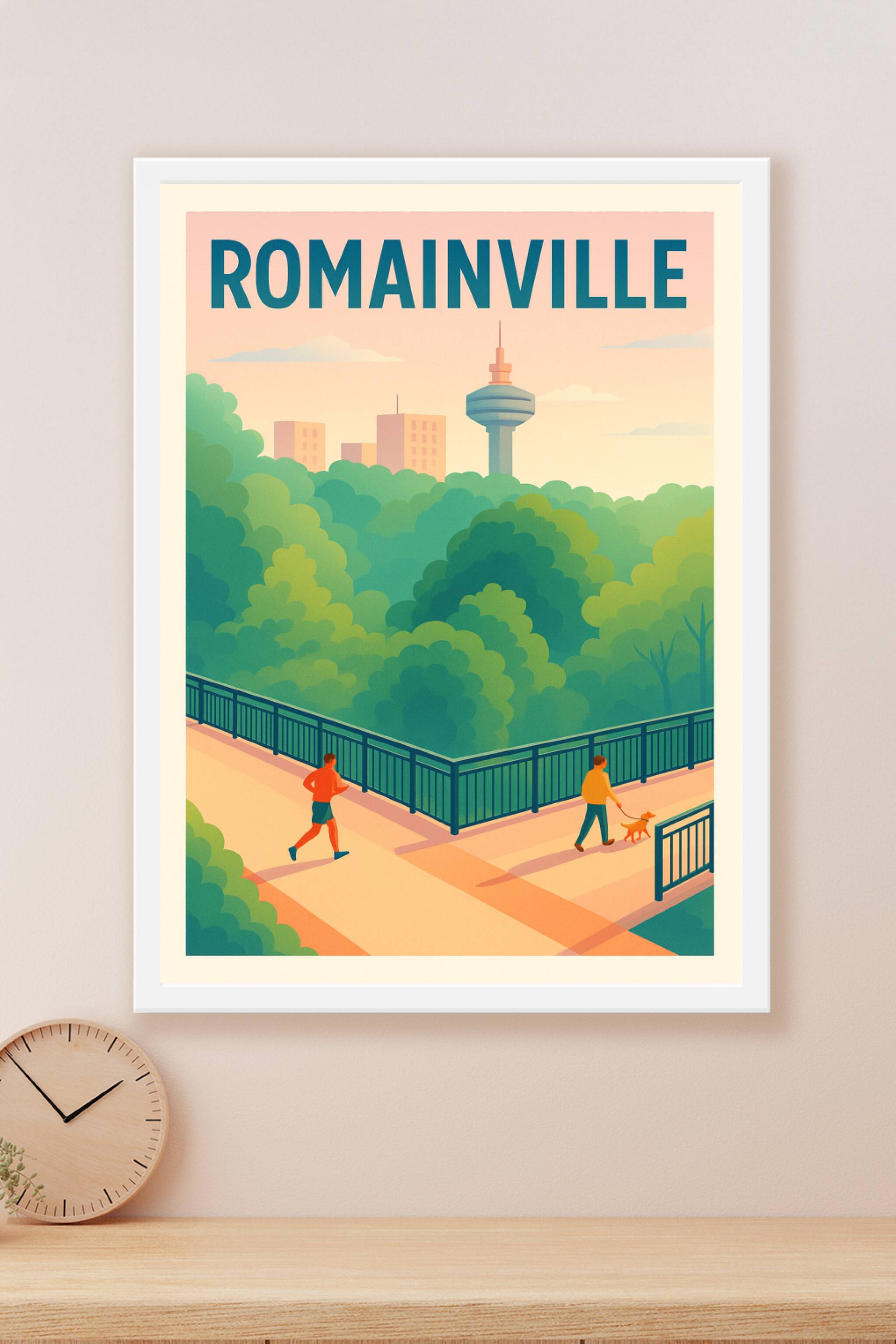 Découvrez l'harmonie parfaite entre urbanisme et verdure avec ce poster illustré mettant en scène un coin paisible de Romainville, dominé par la cé...