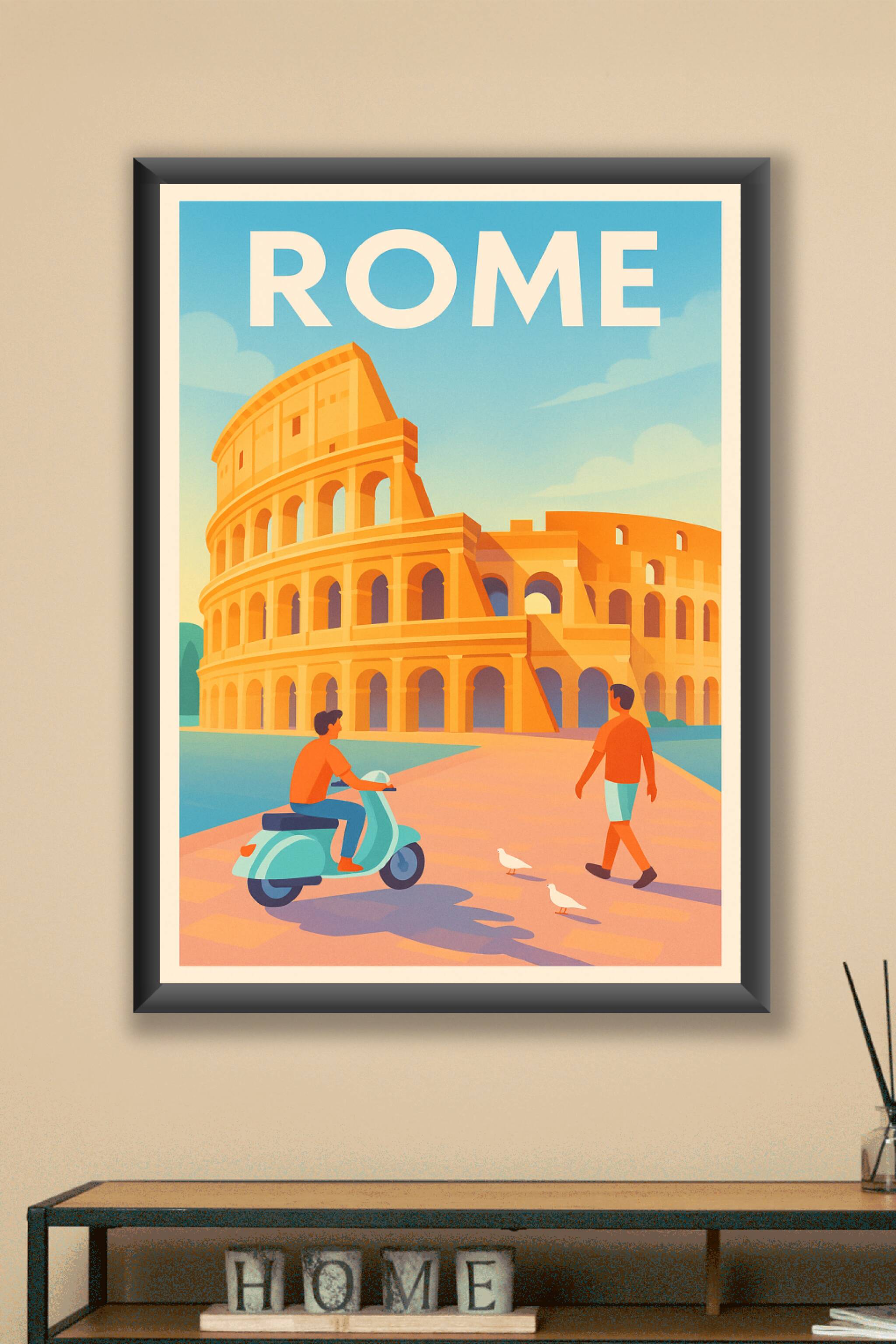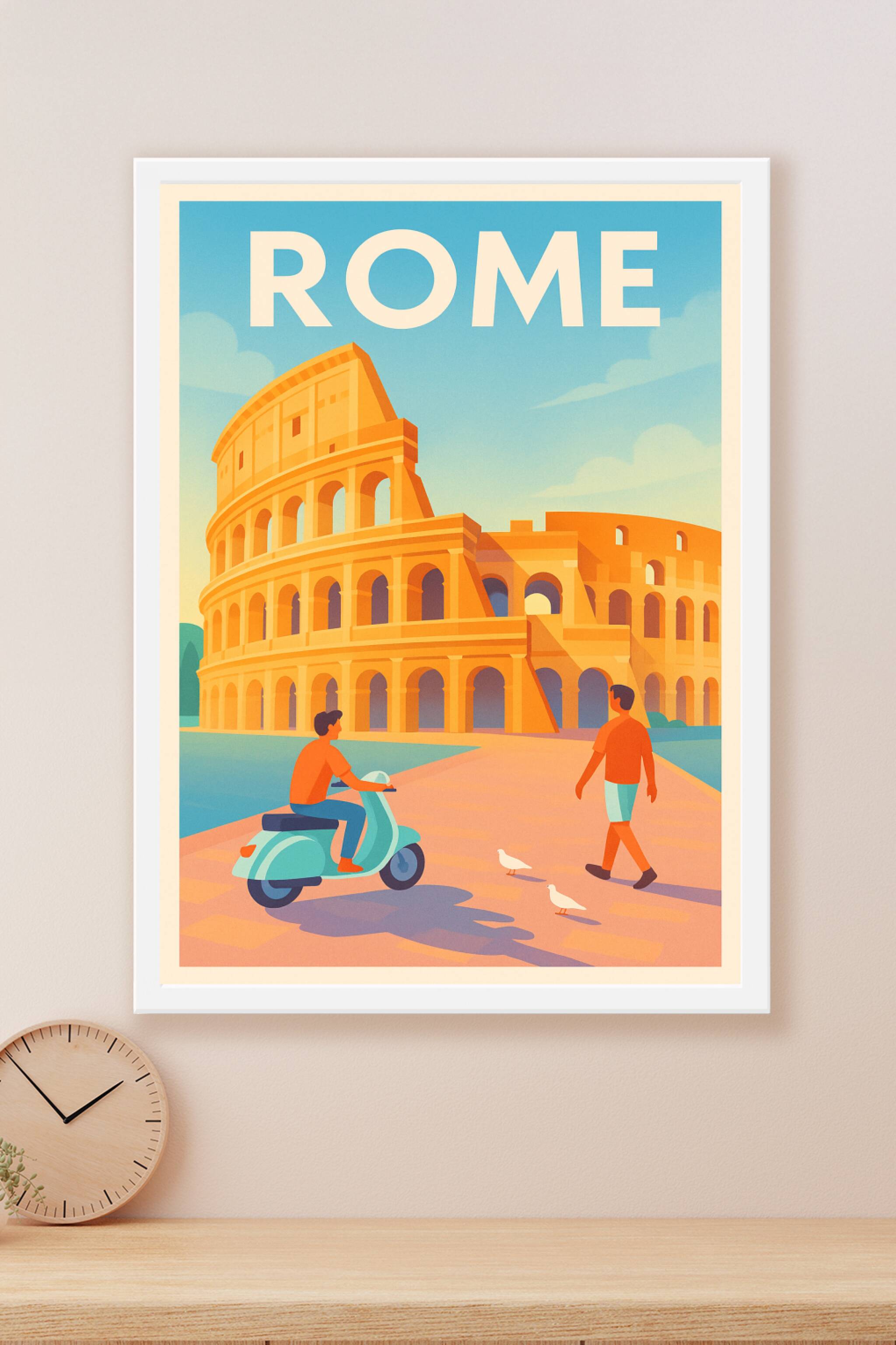 Découvrez la magie de Rome avec cette affiche illustrée mettant en scène le célèbre Colisée sous un ciel lumineux. Ce poster au style vintage captu...