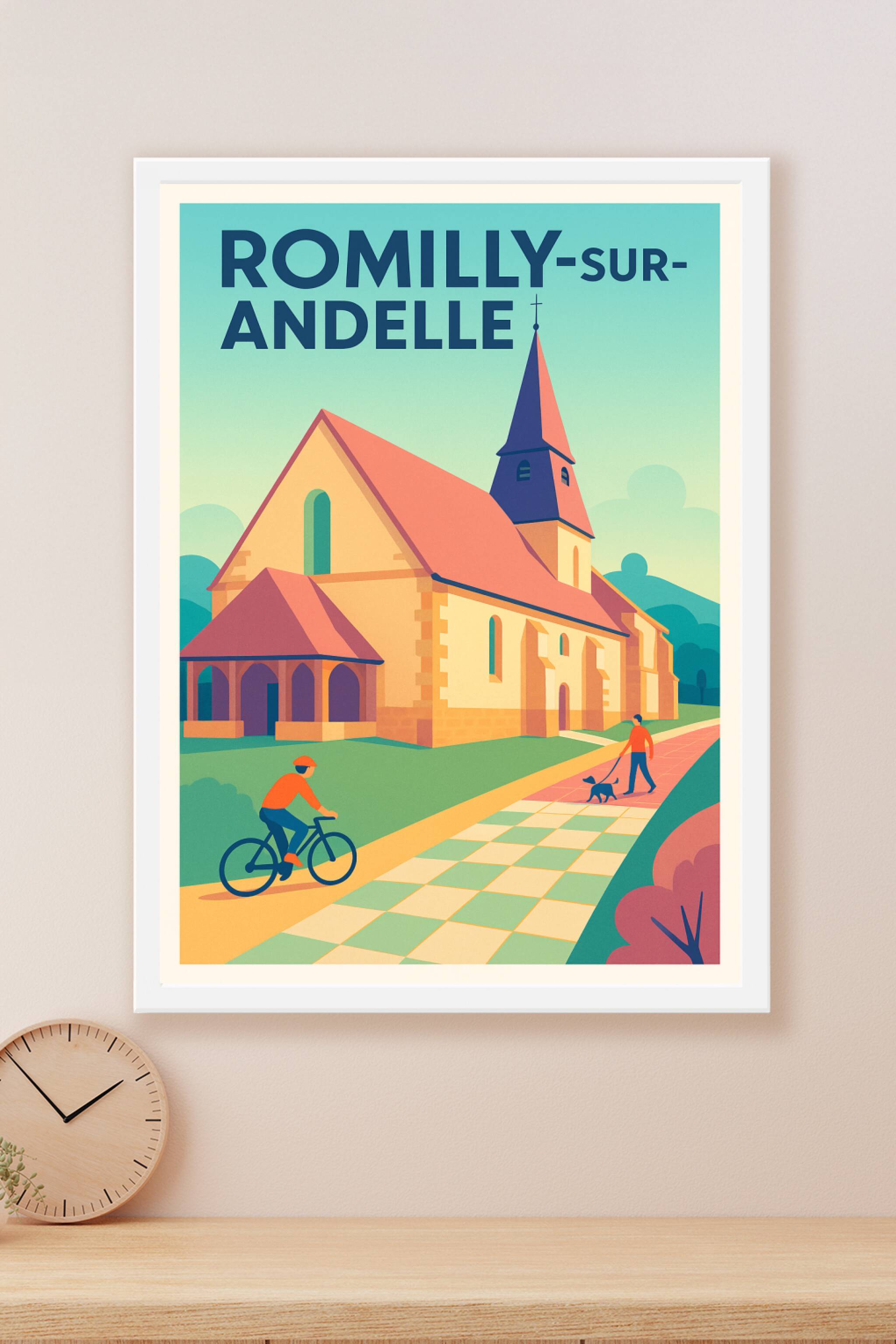 Découvrez l'élégance paisible de Romilly-sur-Andelle avec cette affiche illustrée mettant en scène un paysage typique de la région normande, où s'é...