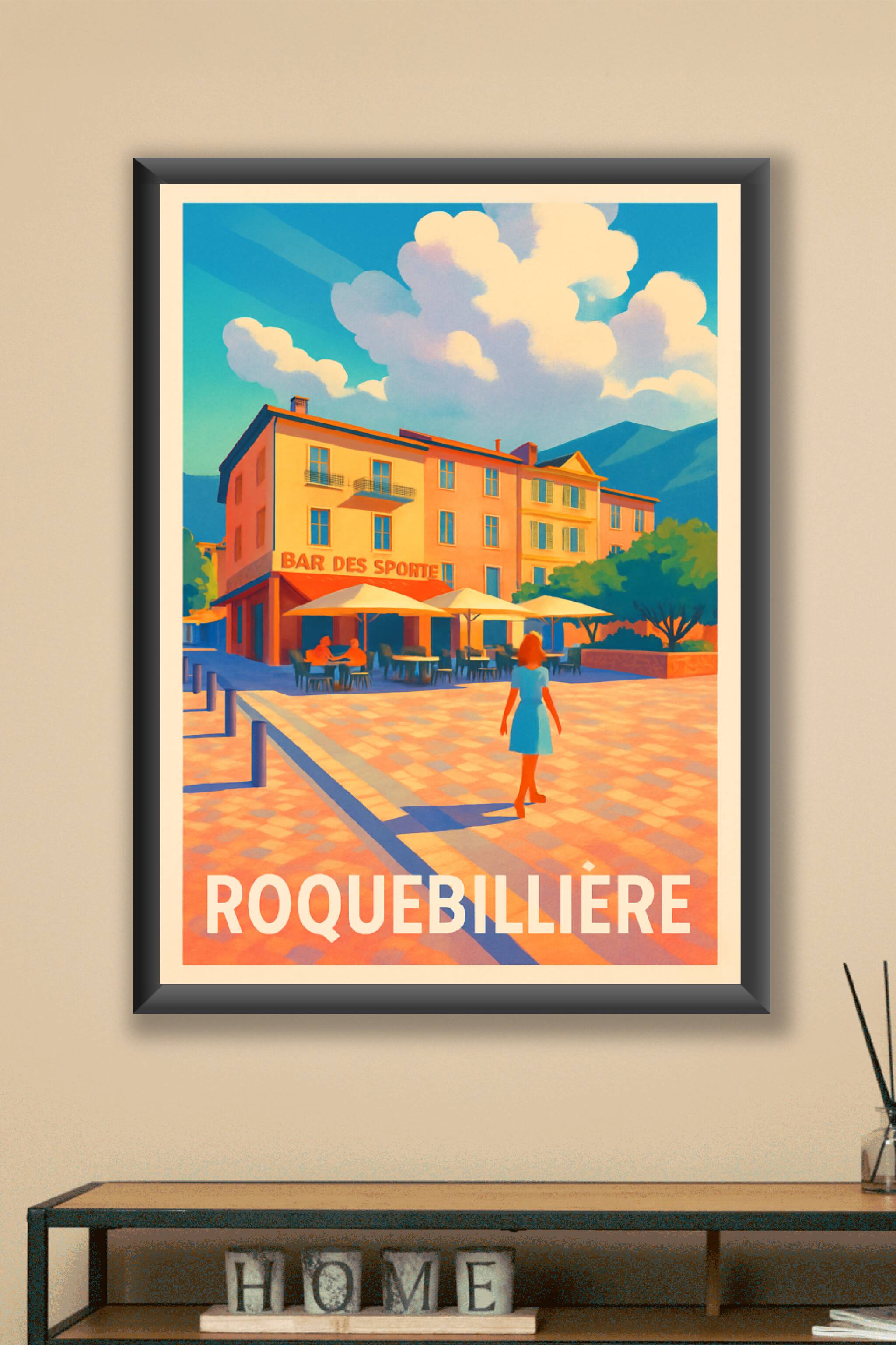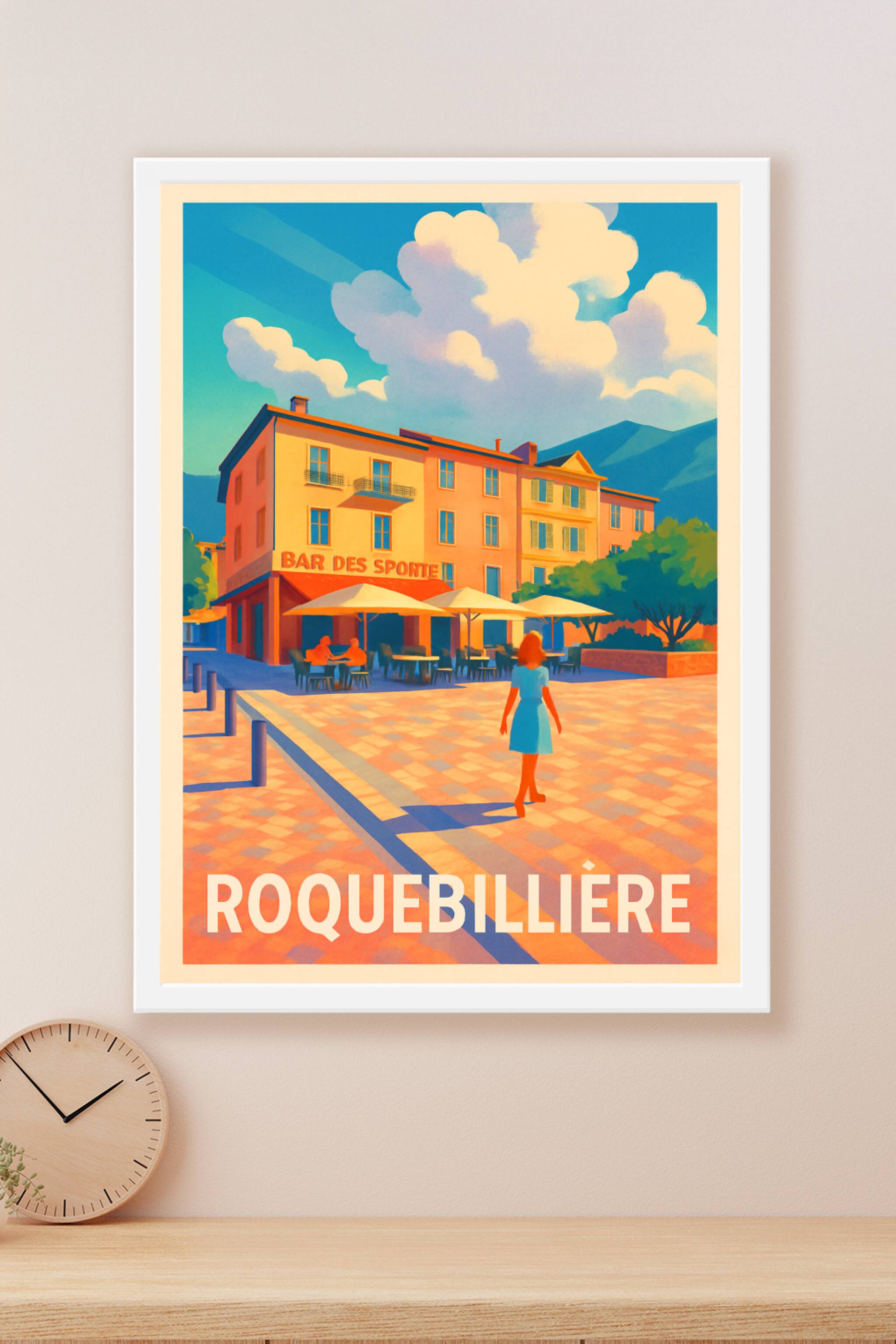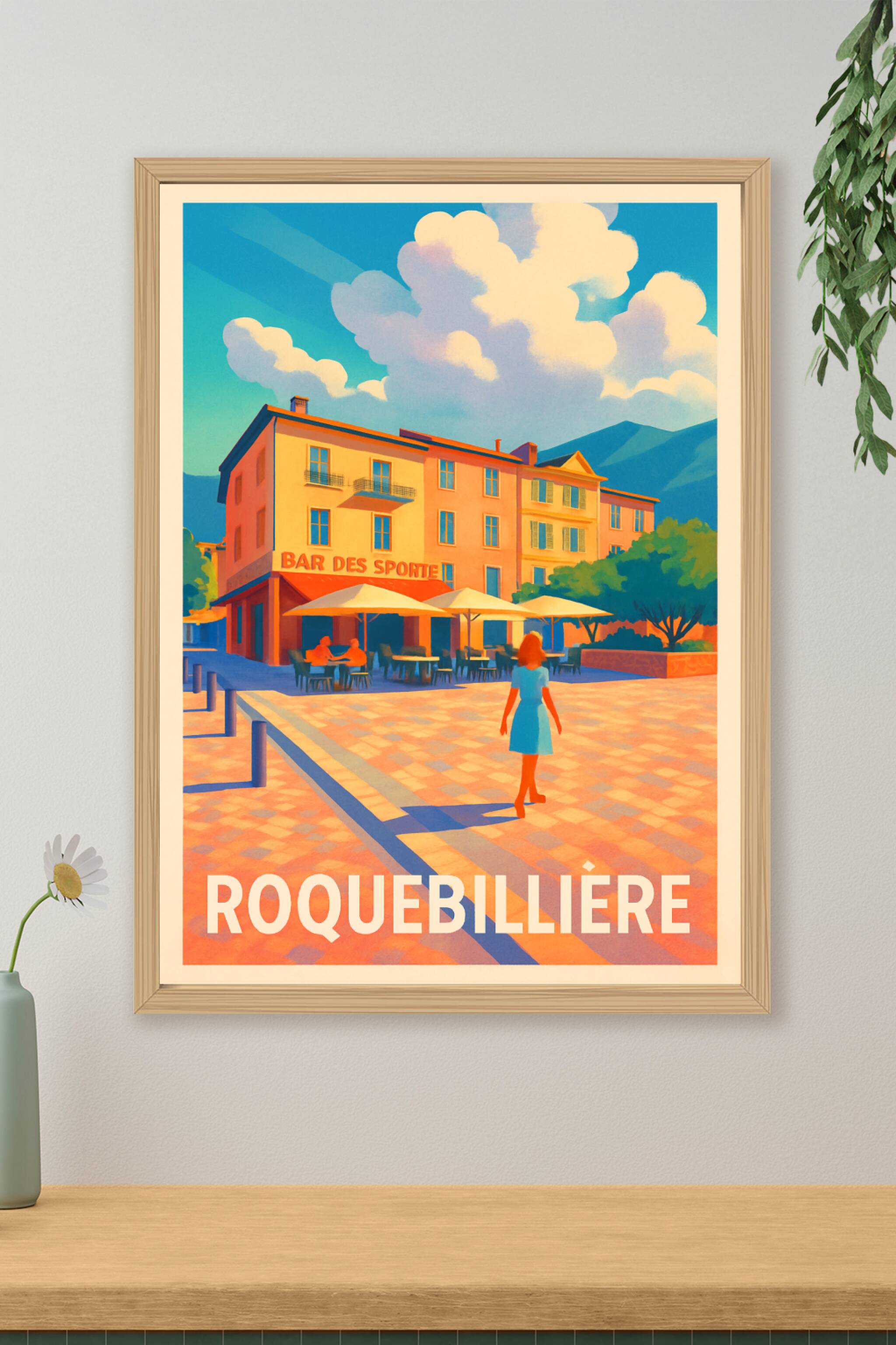 Découvrez l'élégance et la sérénité de Roquebillière à travers cette affiche vintage au style chaleureusement coloré. Ce poster met en scène une place animée autour du Bar des Sports, baignée par une lumière douce qui souligne les nuances chaudes des bâtiments et le ciel éclatant. Imprimée en tirage "Fine Art" sur un papier 305g coton haut de gamme, cette affiche offre une qualité d'impression exceptionnelle, parfaite pour sublimer votre intérieur. Disponible en formats A1 à A4, avec ou sans cadre, cette pièce d'exception apportera une touche d'authenticité et de charme à votre décoration ou constituera un cadeau raffiné pour les amateurs de Roquebillière.