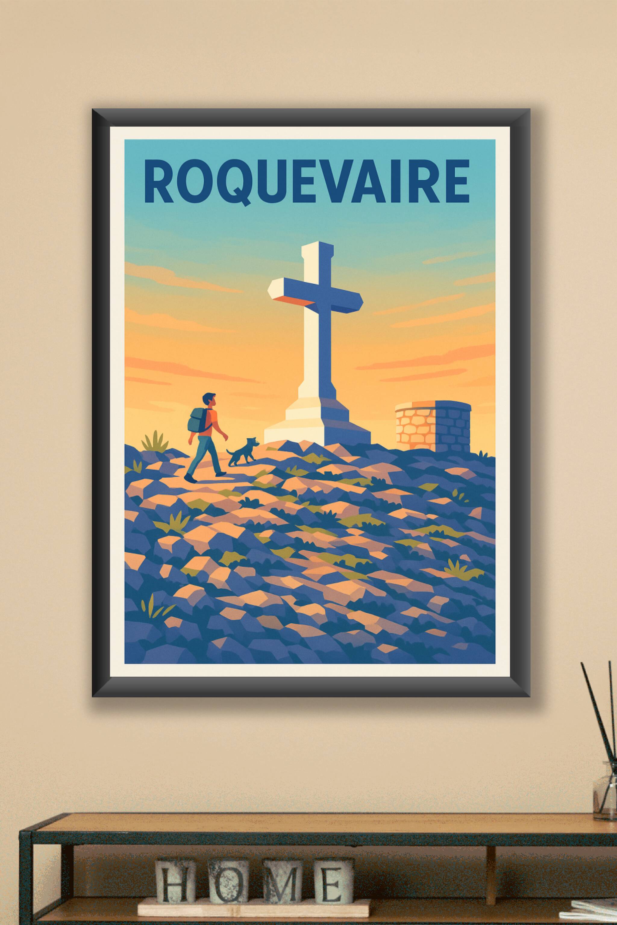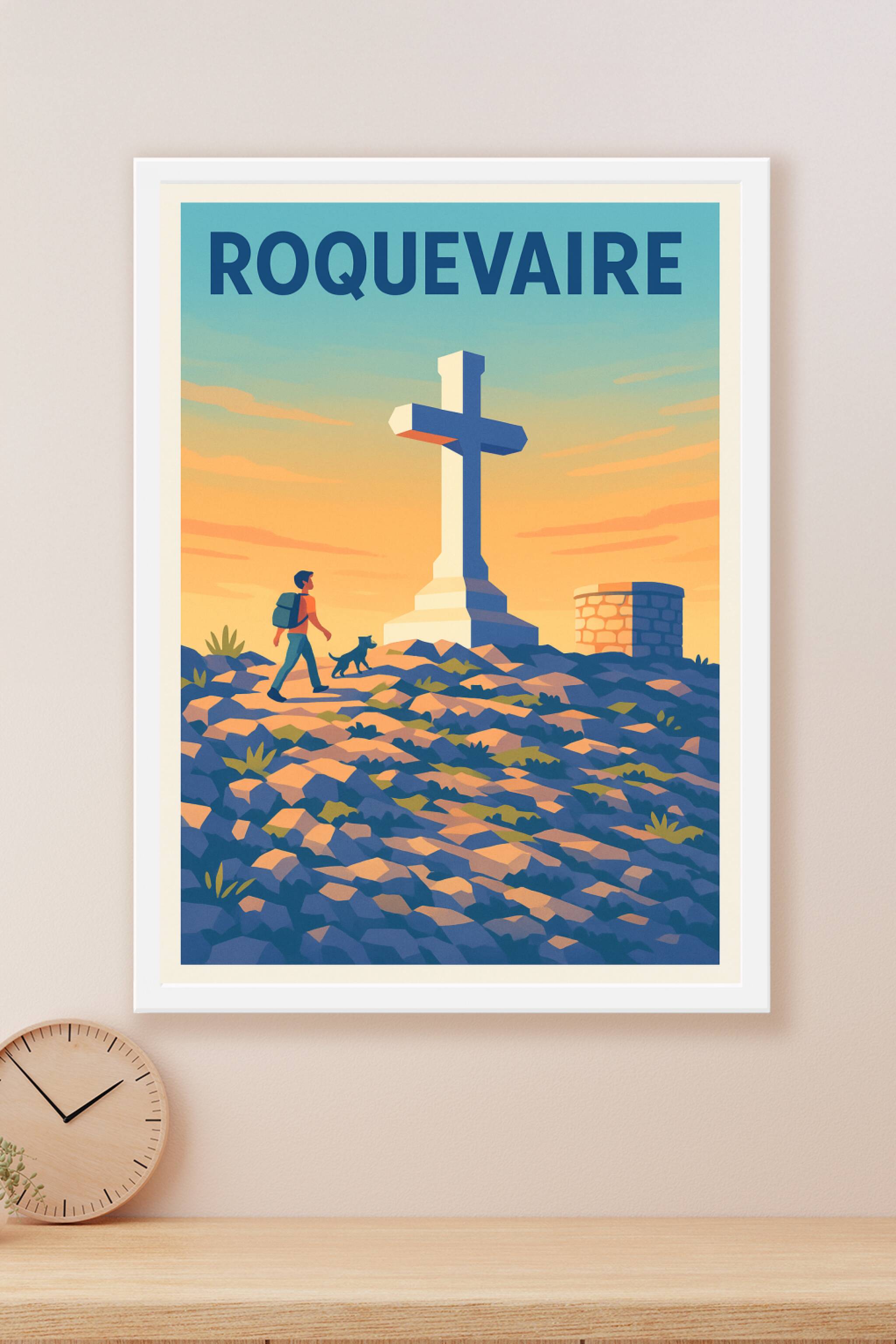 Découvrez la beauté naturelle et la sérénité de Roquevaire avec cette affiche illustrée pleine de charme, représentant un randonneur et son chien a...