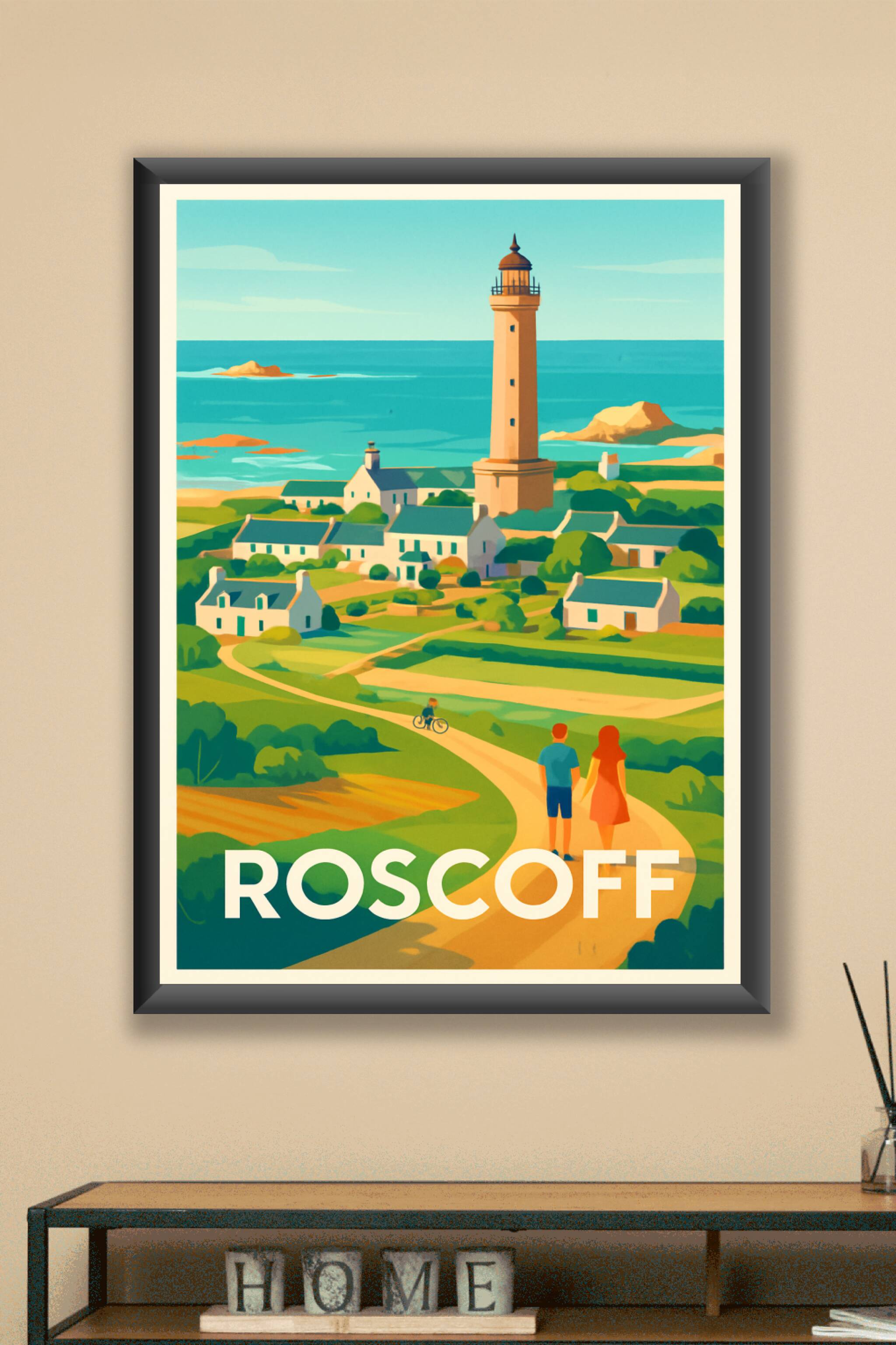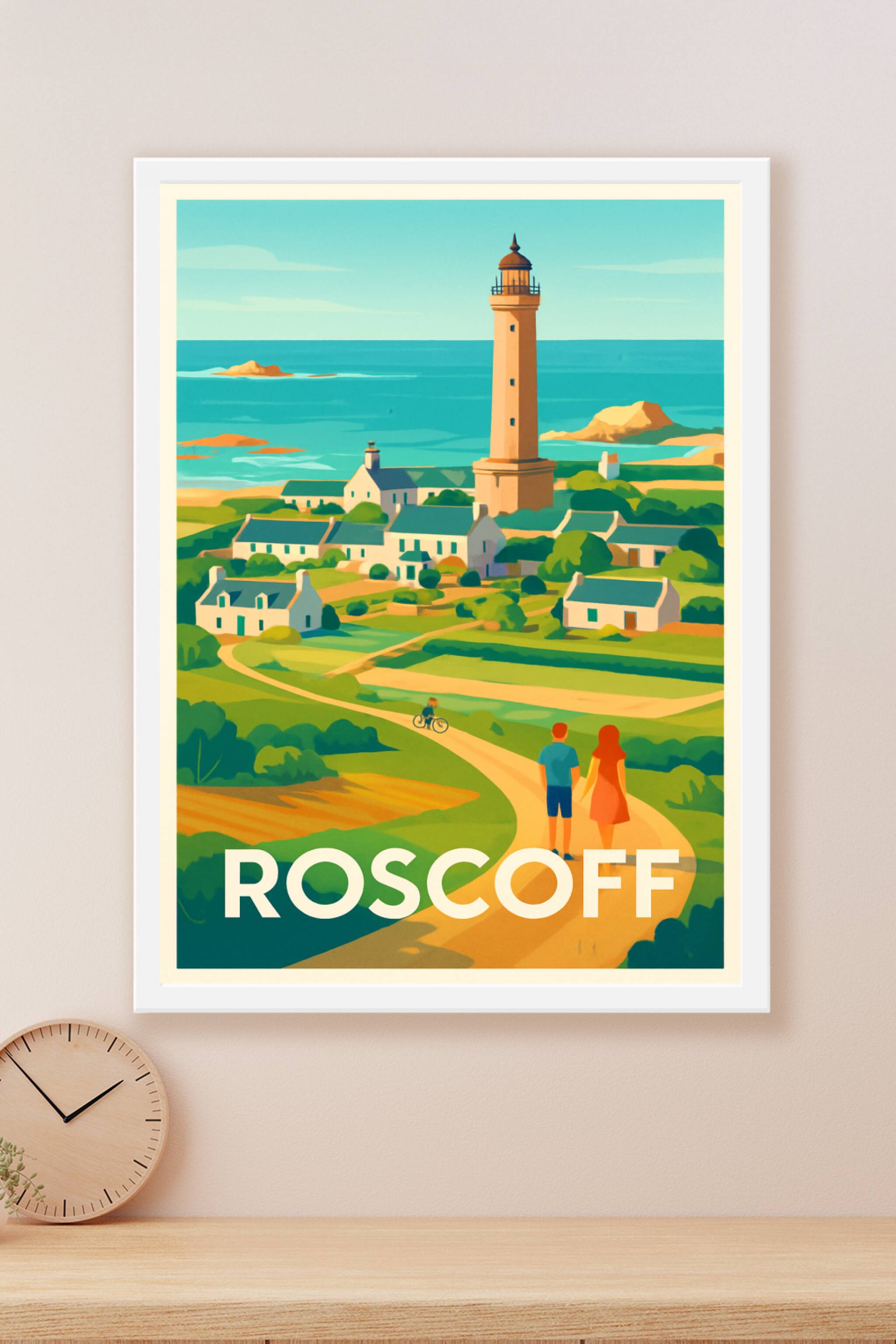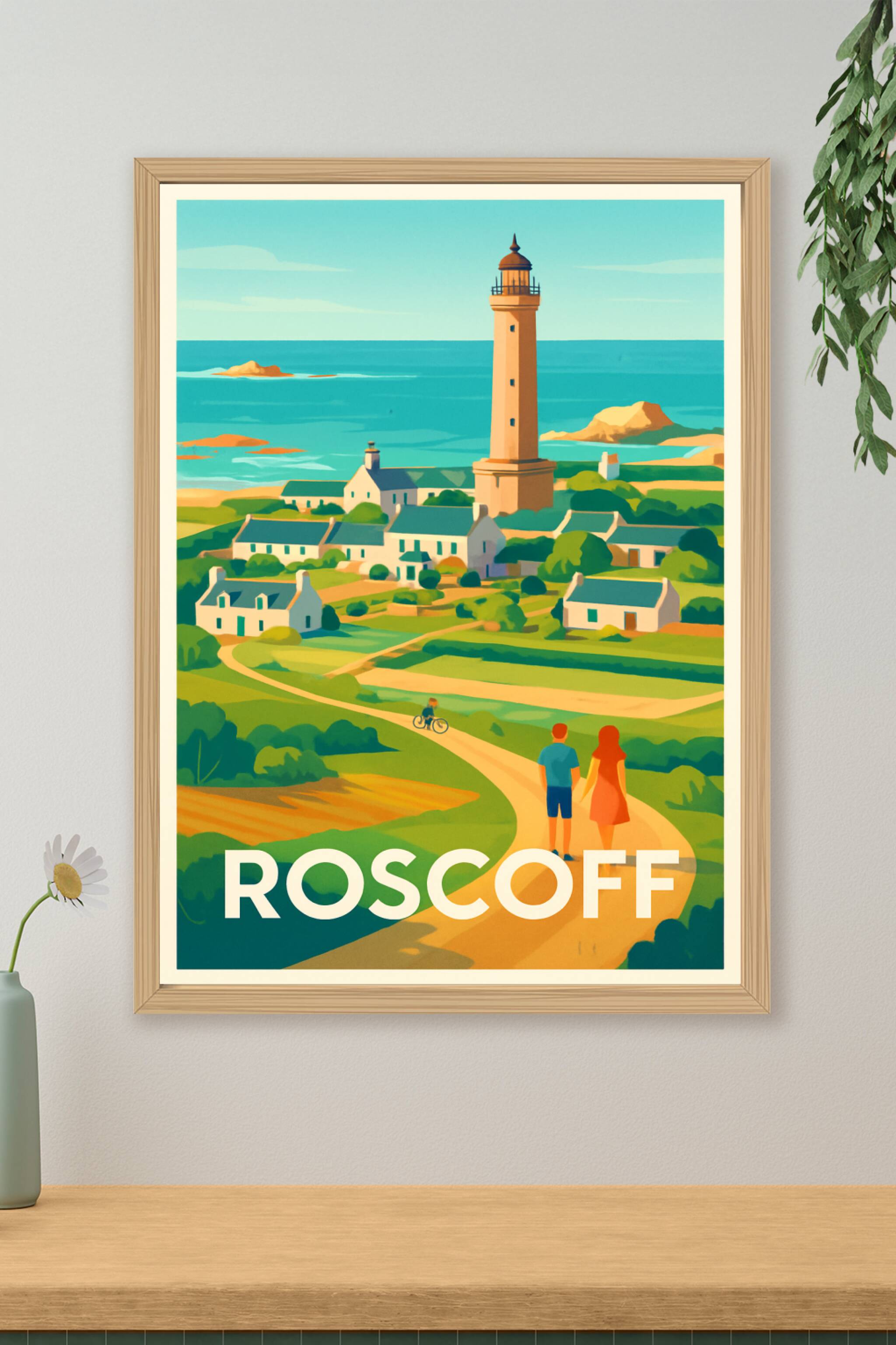 Découvrez l'ambiance paisible et authentique de Roscoff avec cette affiche illustrée au style rétro mettant en scène son célèbre phare et ses maiso...
