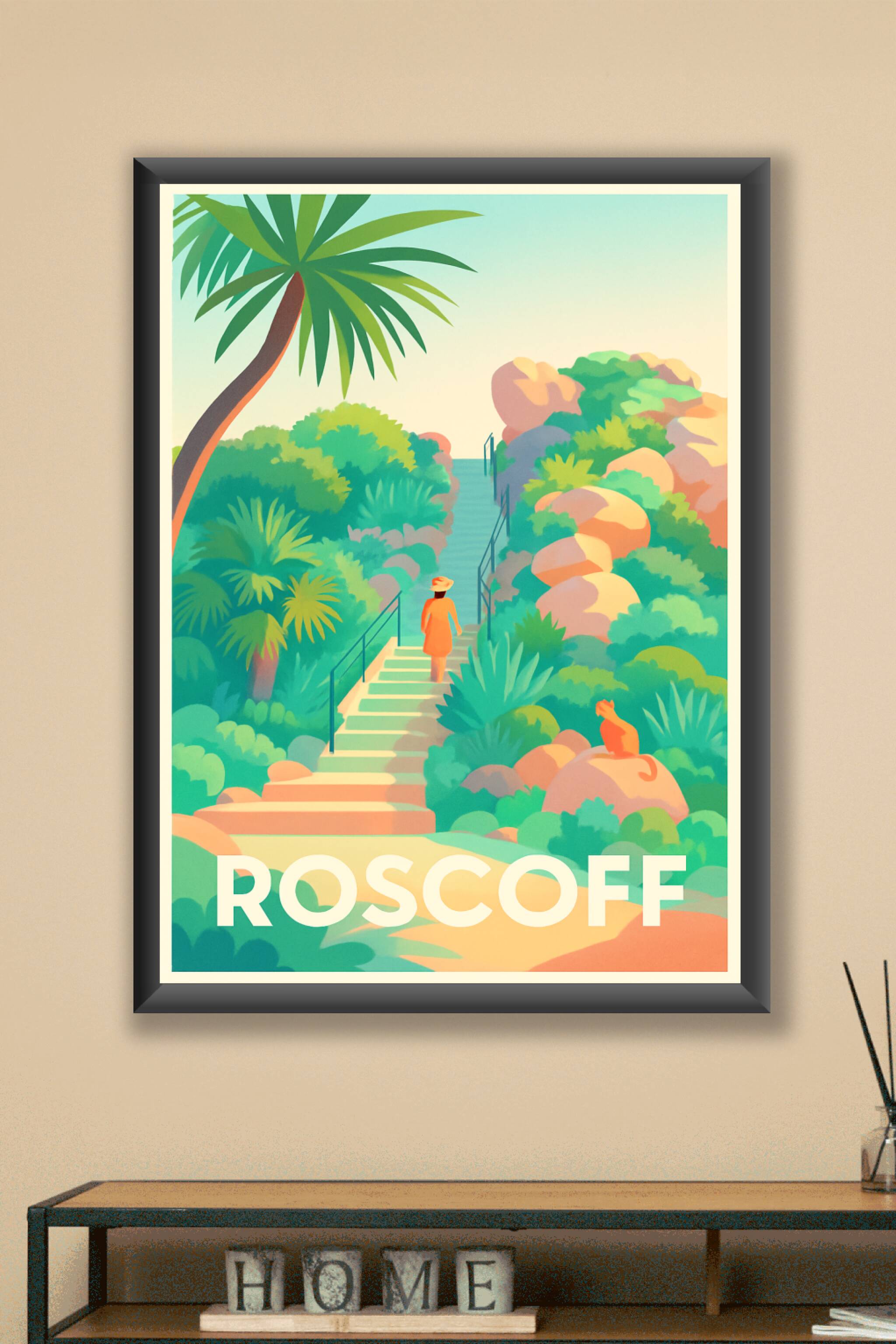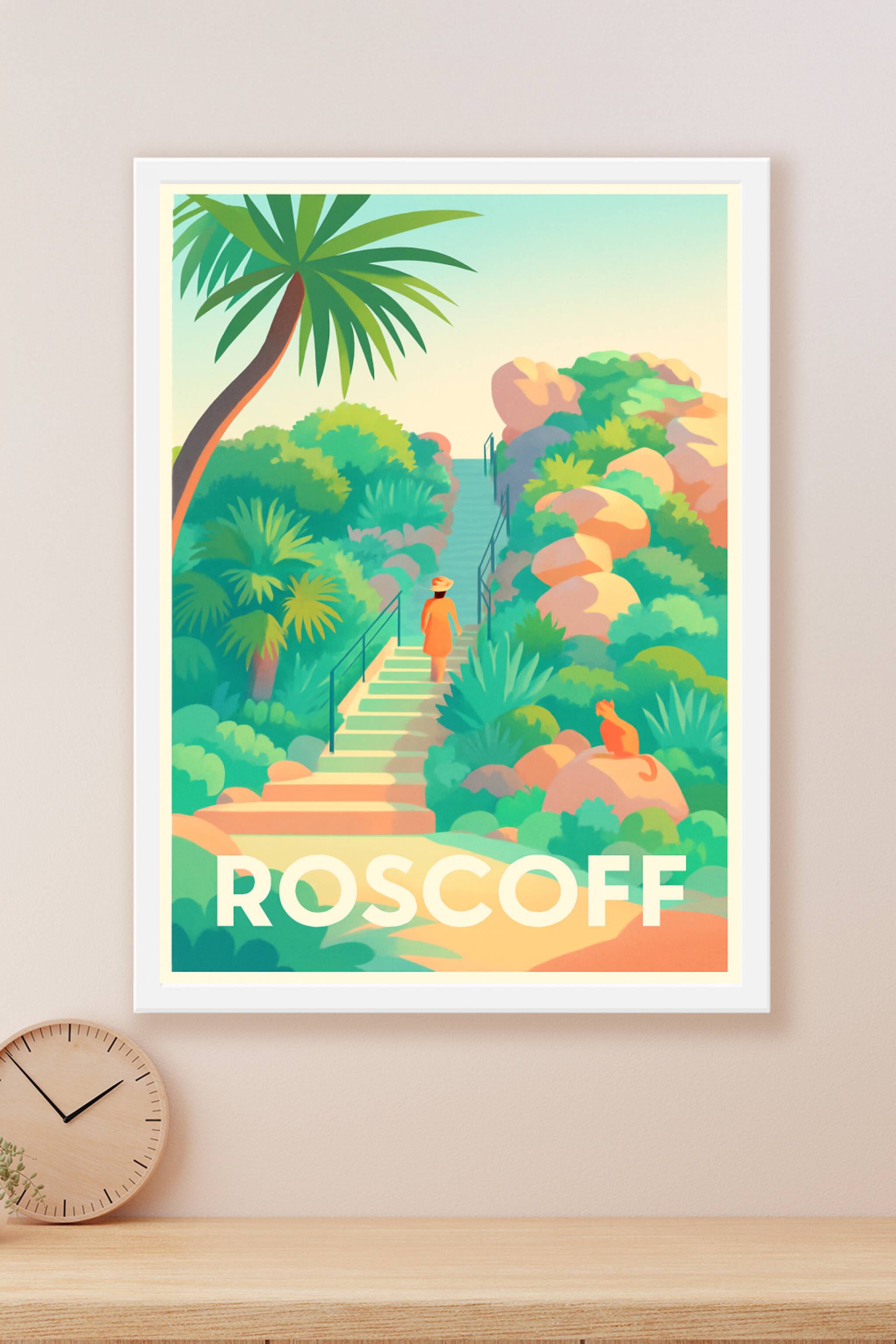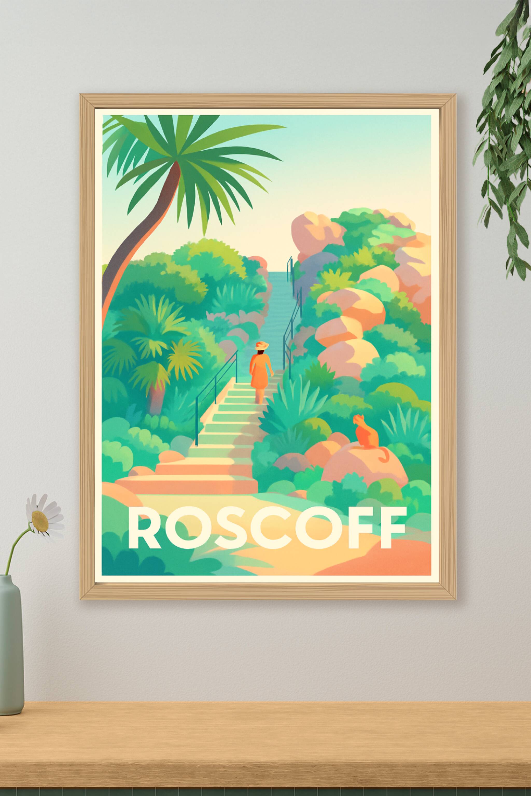 Découvrez la douceur et la sérénité de Roscoff à travers cette affiche illustrée aux couleurs apaisantes et à l'ambiance estivale. Une femme chemin...