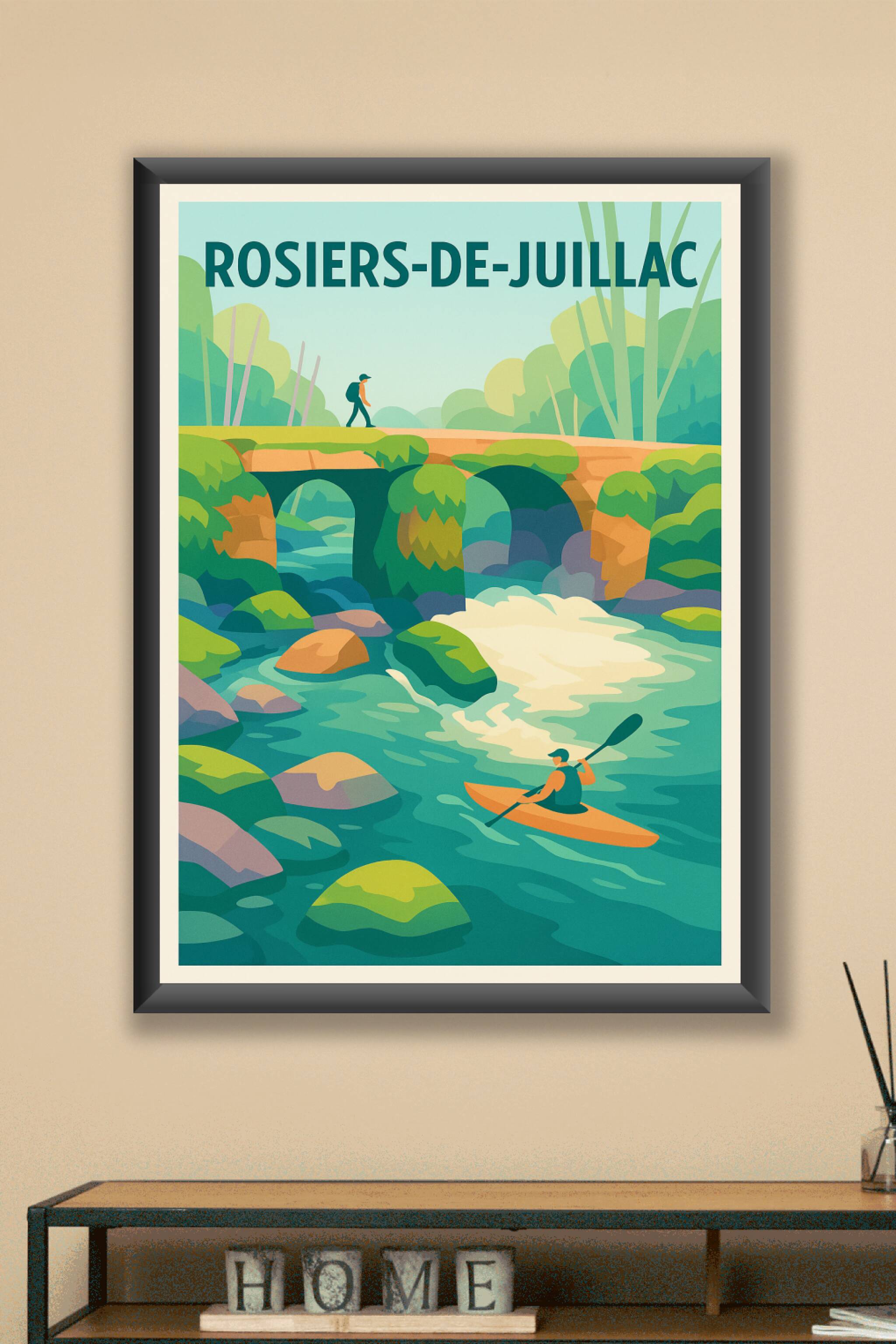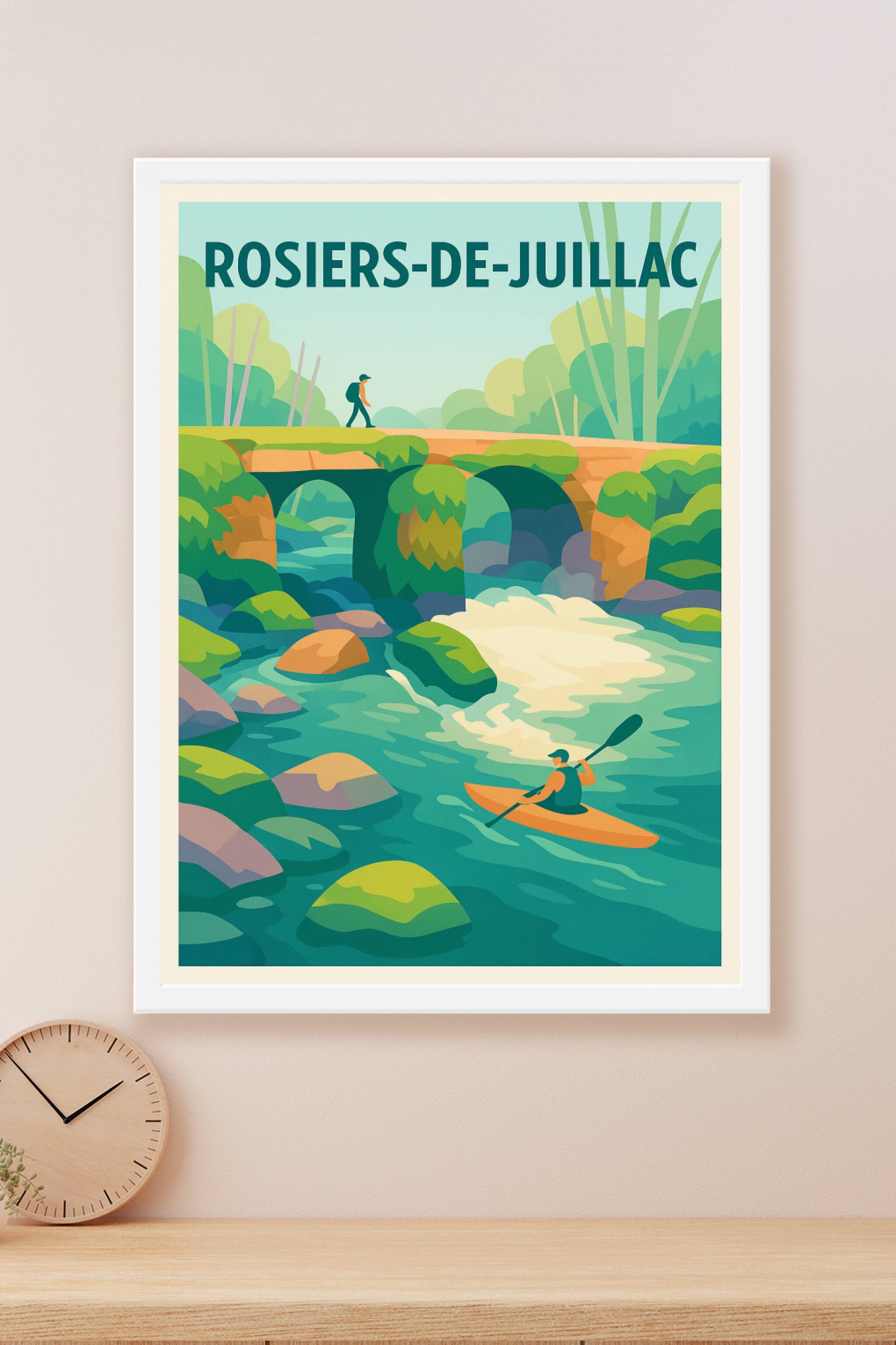 Découvrez la beauté sauvage et apaisante de Rosiers-de-Juillac avec cette affiche illustrée qui capture un moment d'aventure entre rivière et forêt...