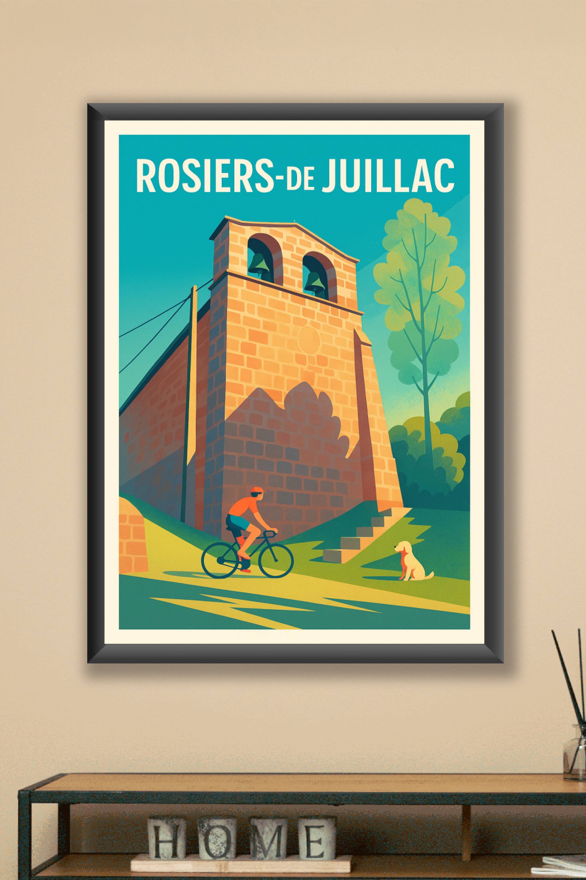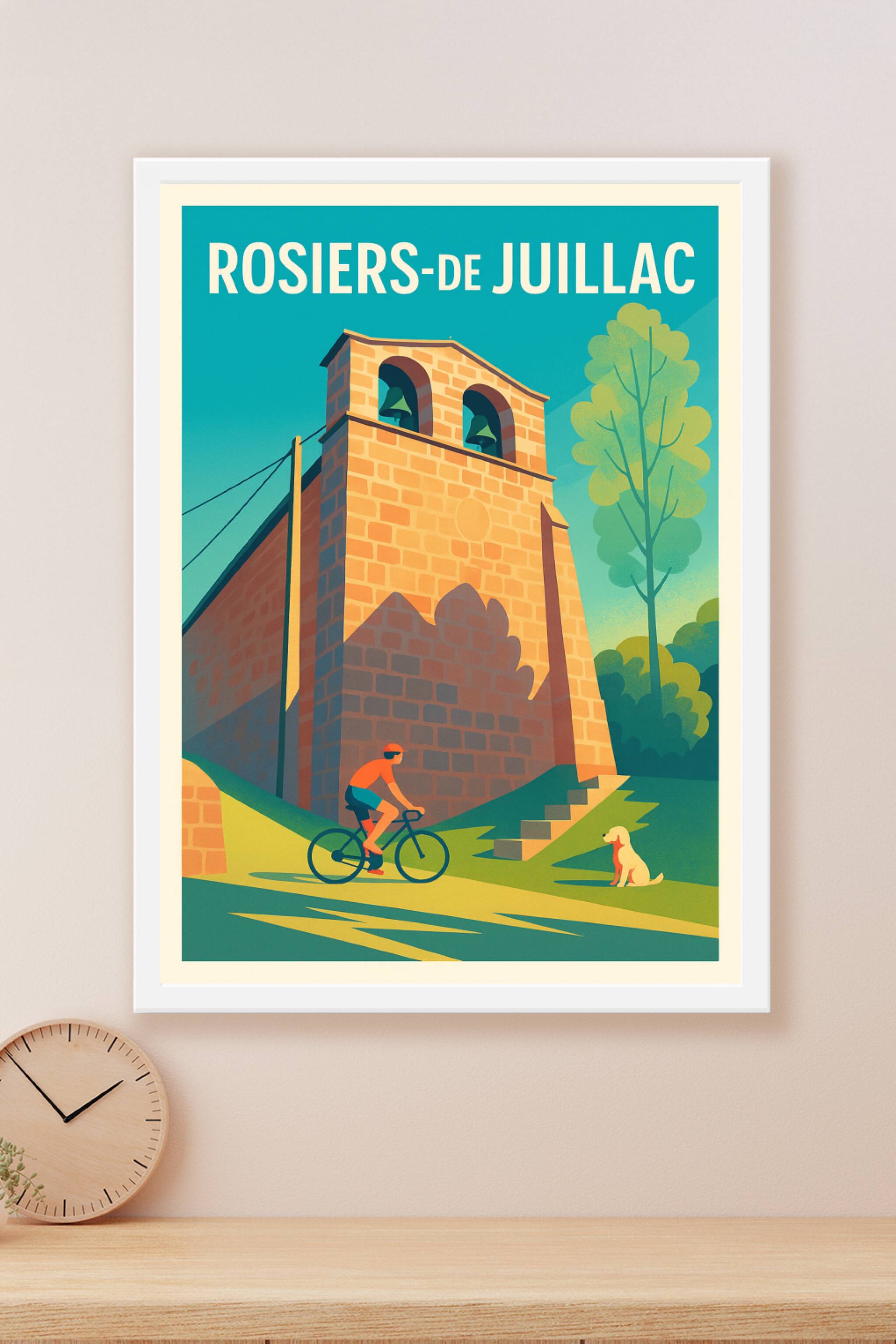 Découvrez l'esprit tranquille et bucolique de Rosiers-de-Juillac avec cette affiche illustrée mettant en scène un cycliste et son fidèle compagnon ...