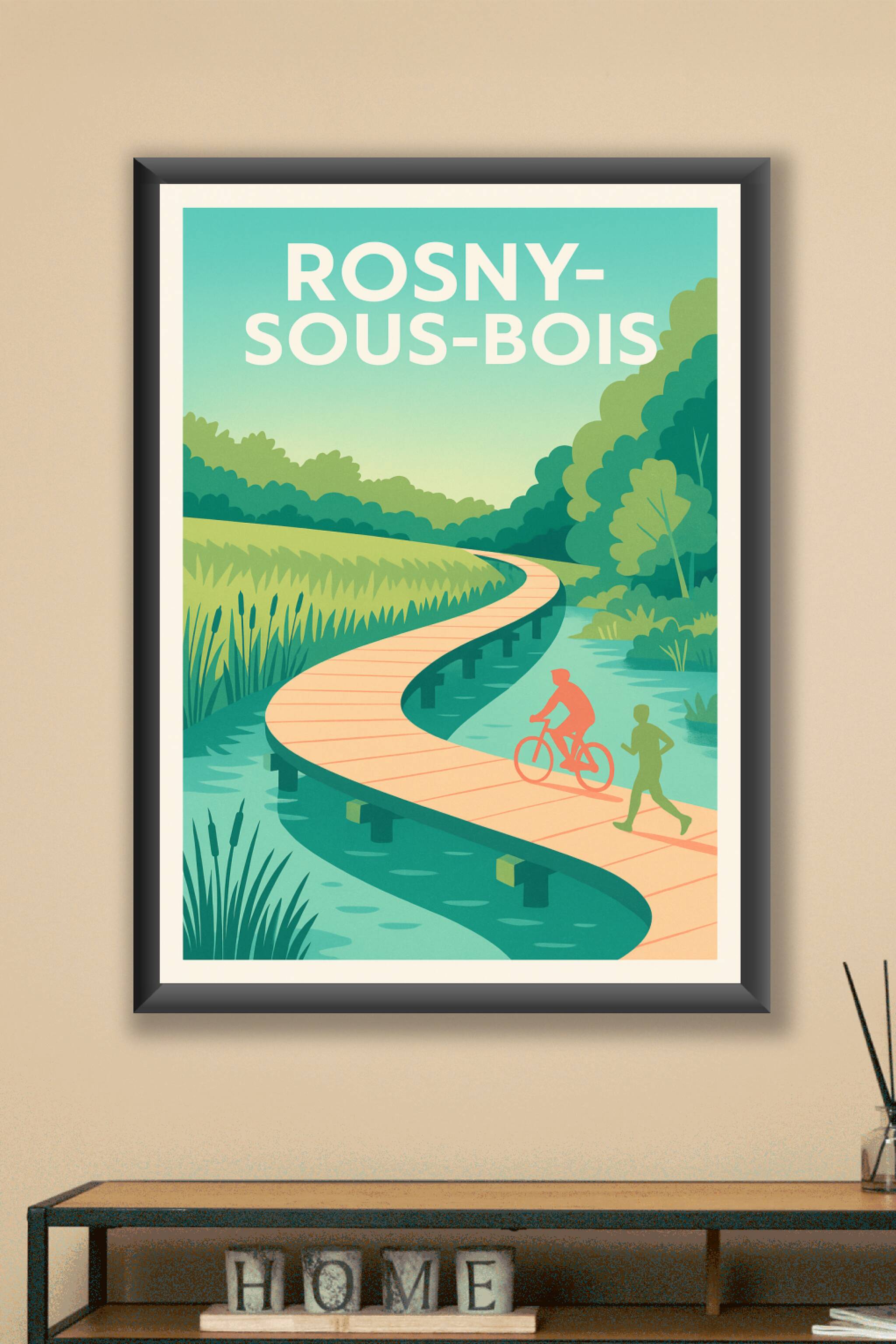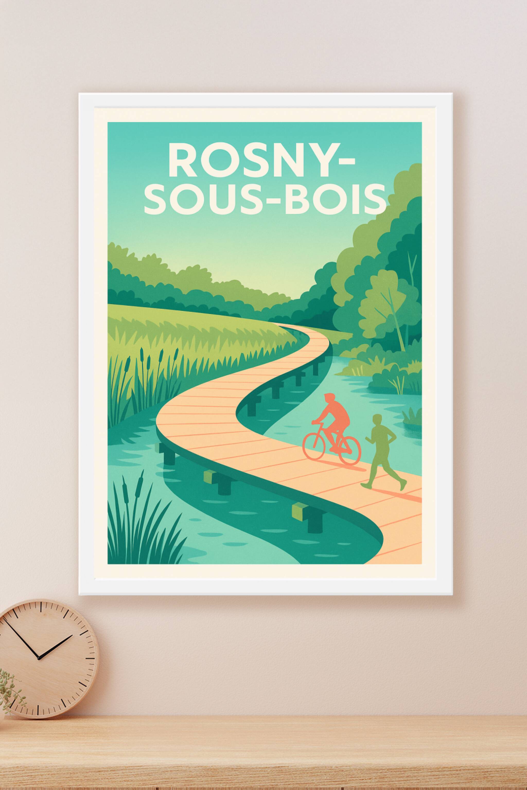 Découvrez la douceur et la sérénité de Rosny-sous-Bois avec cette affiche illustrée mettant en scène une promenade en pleine nature, entre rivières...