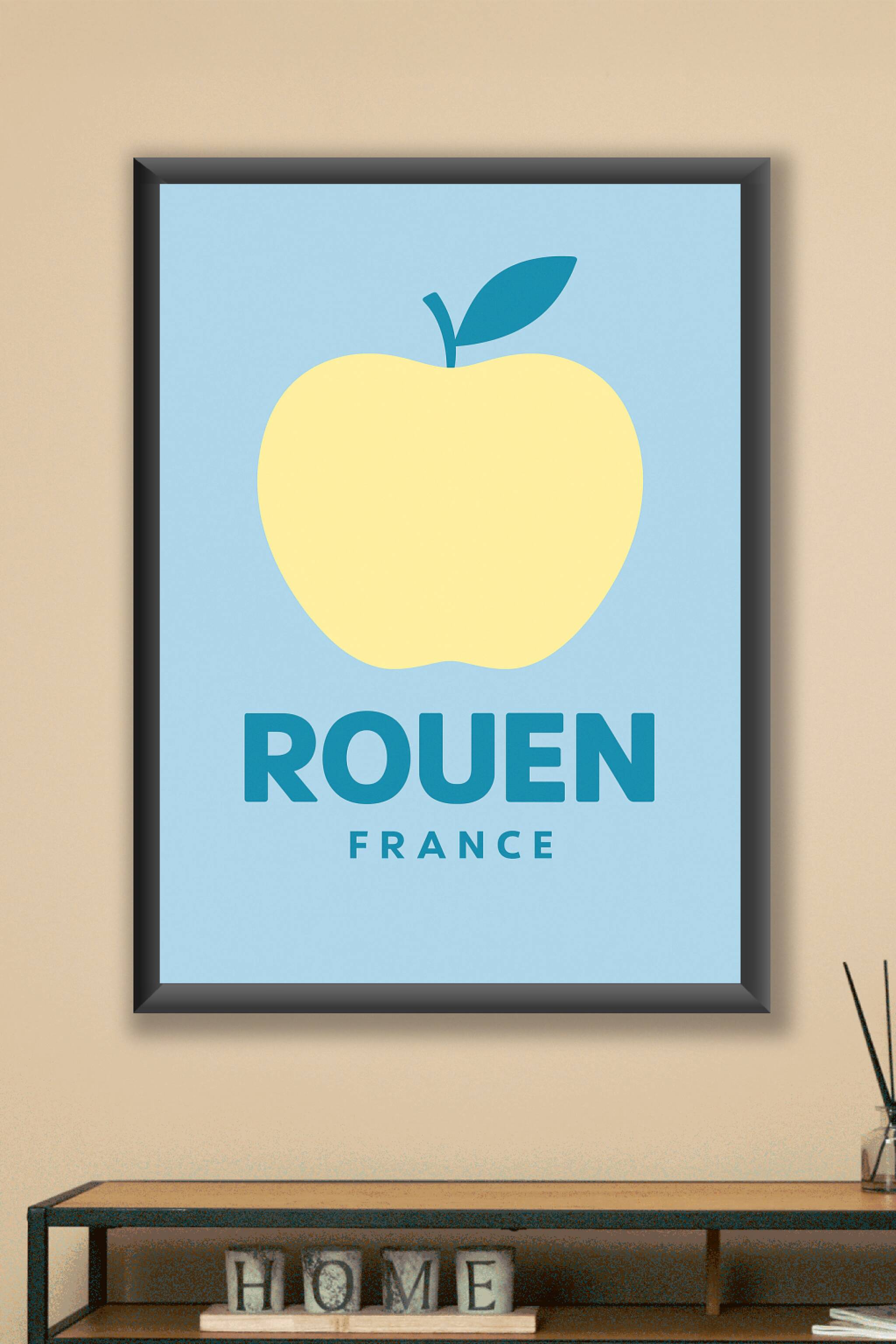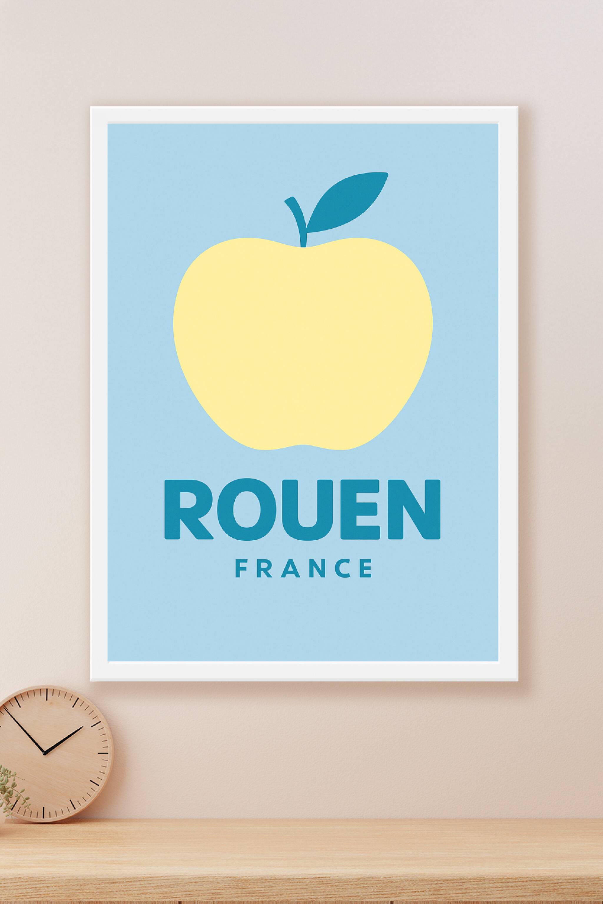 Découvrez cette affiche au design minimaliste et moderne inspirée par Rouen, avec sa pomme jaune stylisée sur un fond bleu apaisant. Ce poster élég...