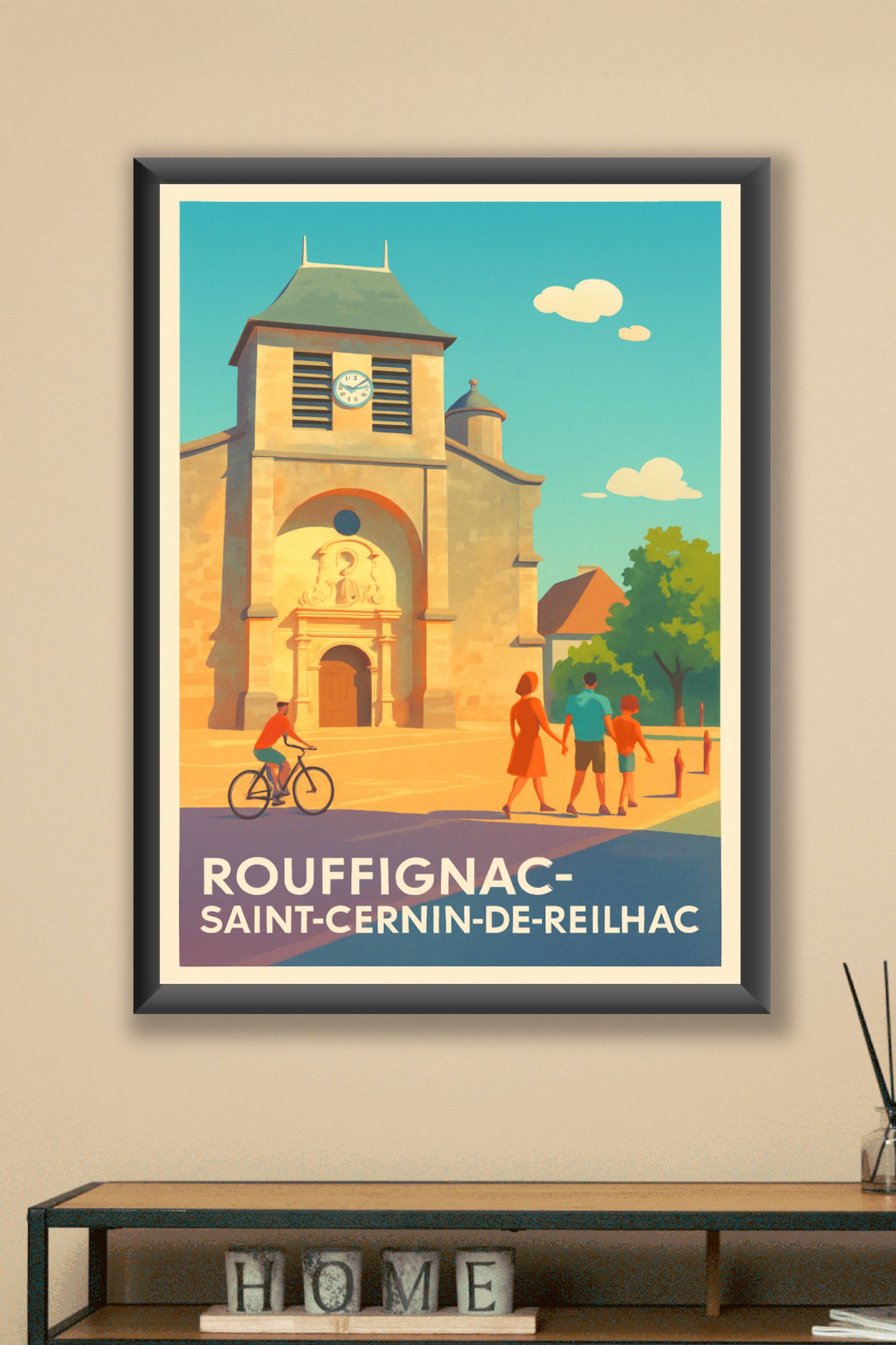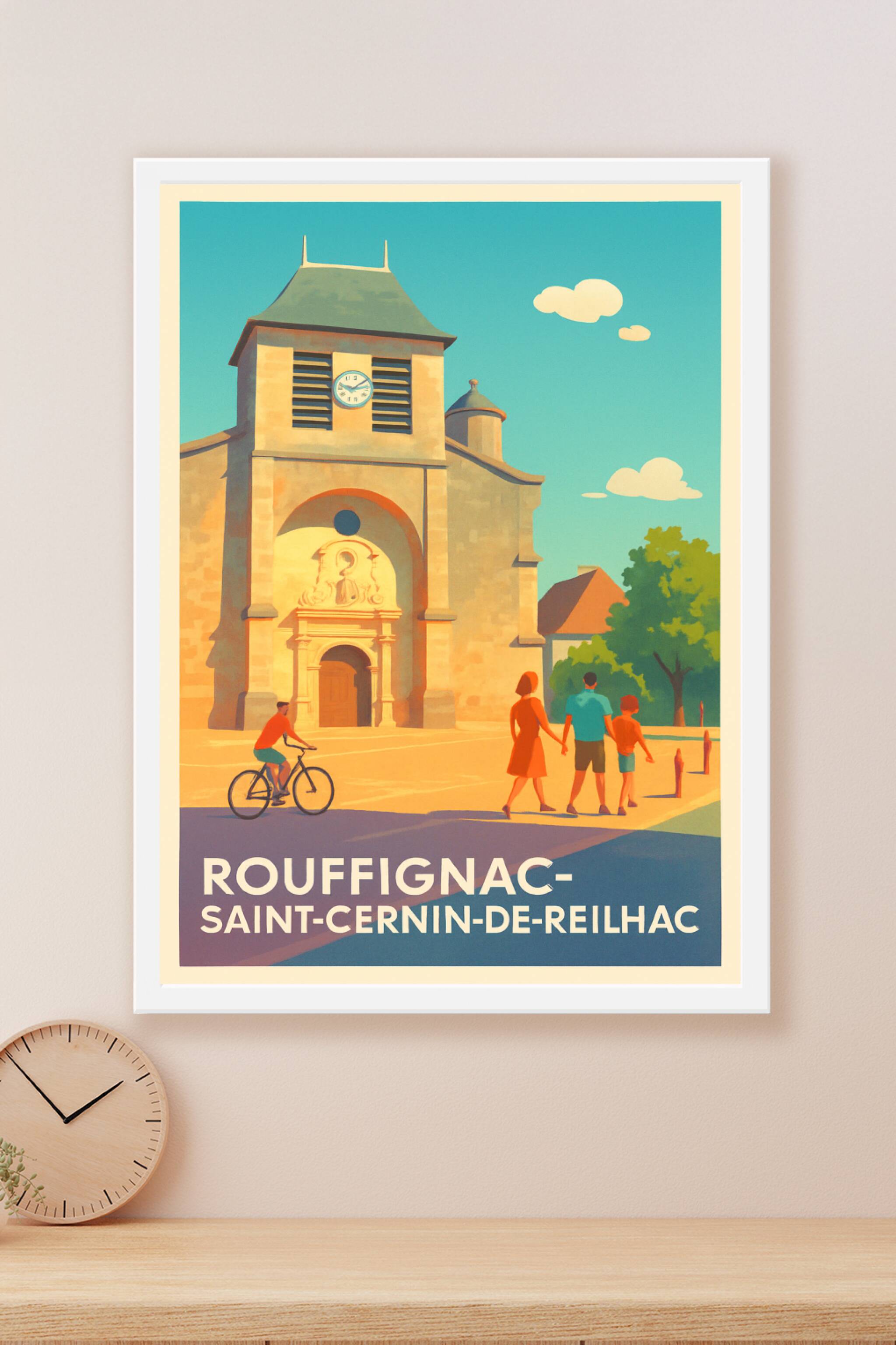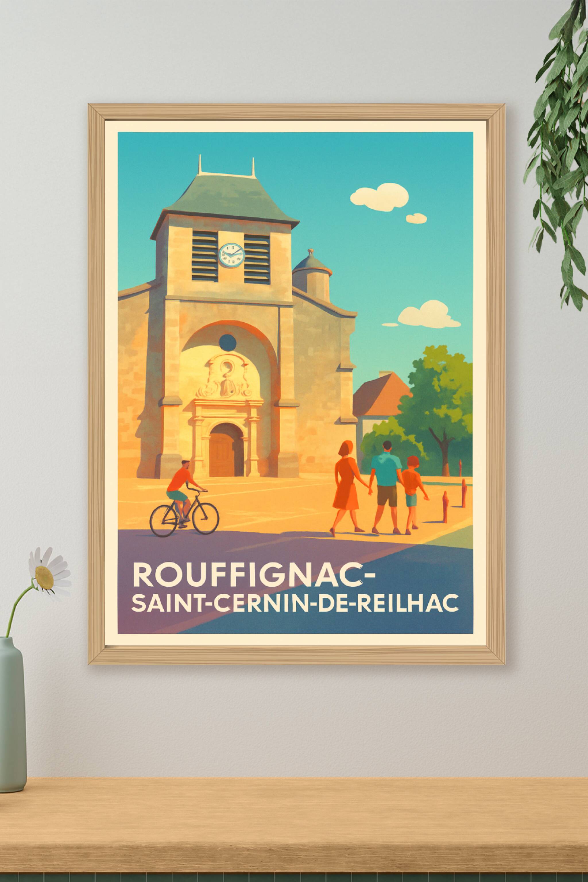 Découvrez l'atmosphère paisible et authentique de Rouffignac-Saint-Cernin-de-Reilhac à travers cette affiche illustrée aux couleurs douces et lumin...