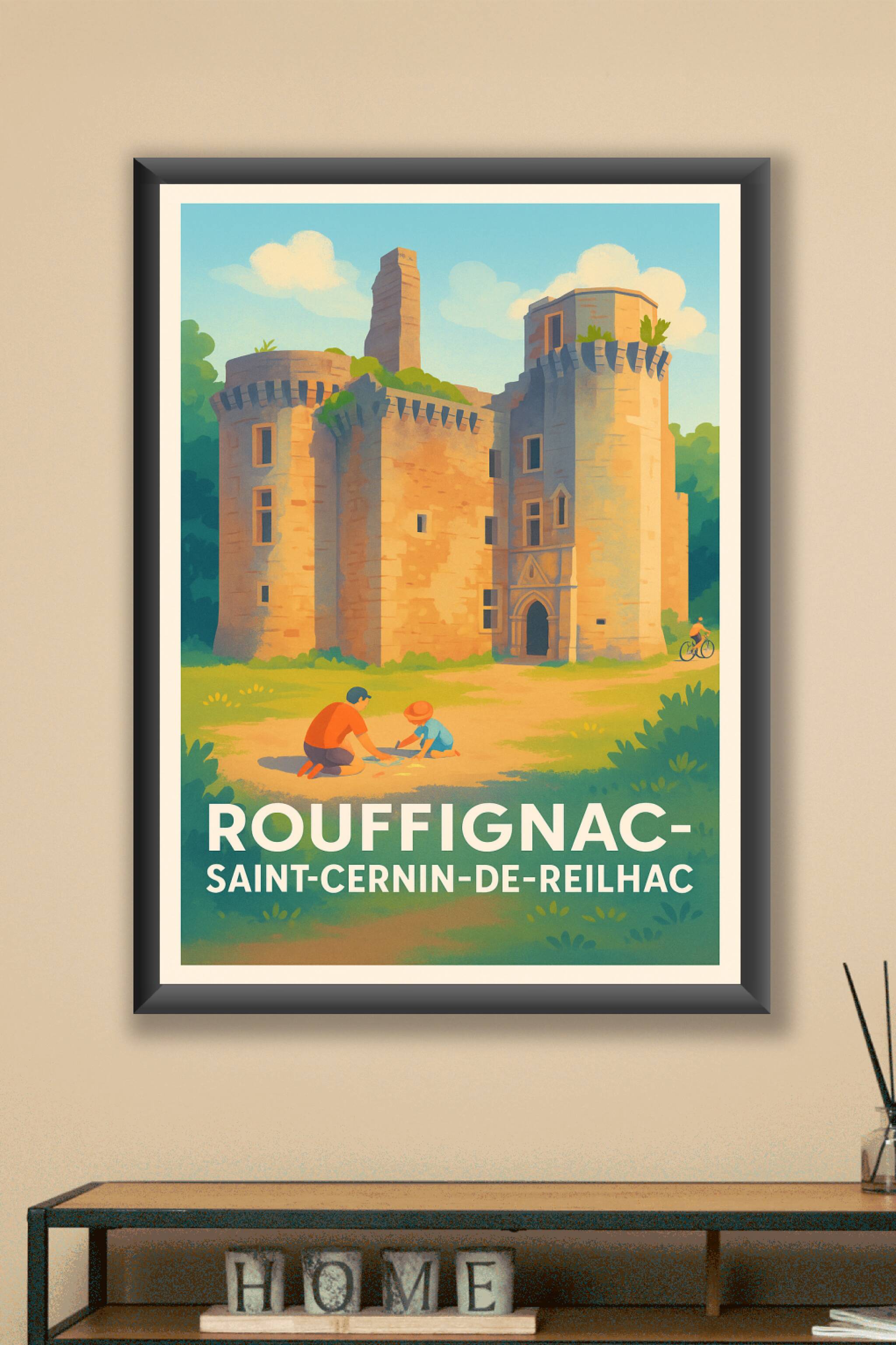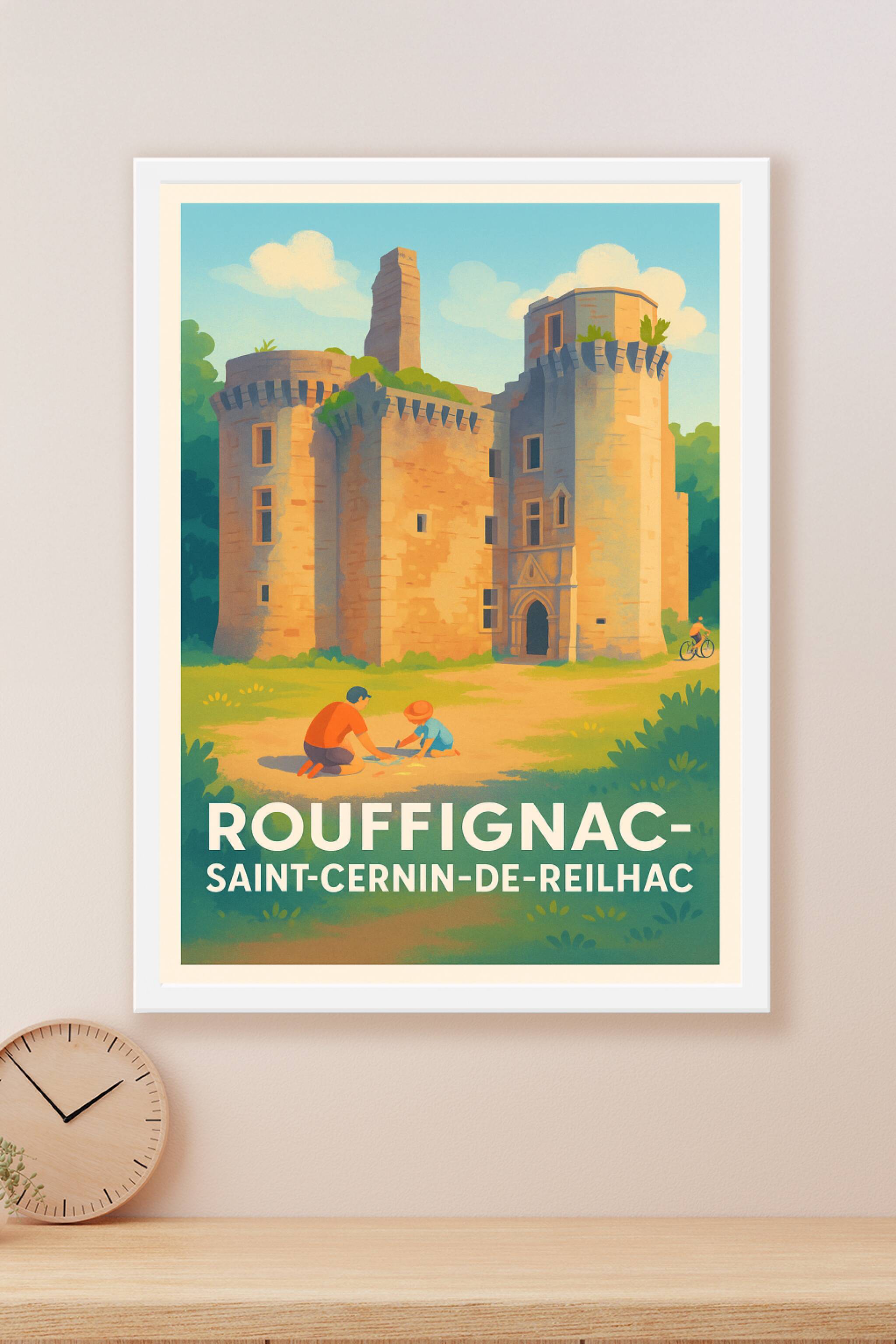Découvrez l'élégance du patrimoine historique de Rouffignac-Saint-Cernin-de-Reilhac avec cette affiche illustrée mettant en scène son château emblématique baigné de lumière. Cette scène bucolique et chaleureuse invite à la contemplation et à l’évasion, idéale pour les passionnés d’histoire et d’art. Ce poster est disponible en tirage "Fine Art" sur papier 305g coton, assurant une qualité d'impression remarquable et des couleurs chatoyantes. Offrez-vous ce superbe poster en formats A1 à A4, avec ou sans cadre, pour sublimer votre décoration intérieure ou pour un cadeau raffiné, 100% fabriqué en France.