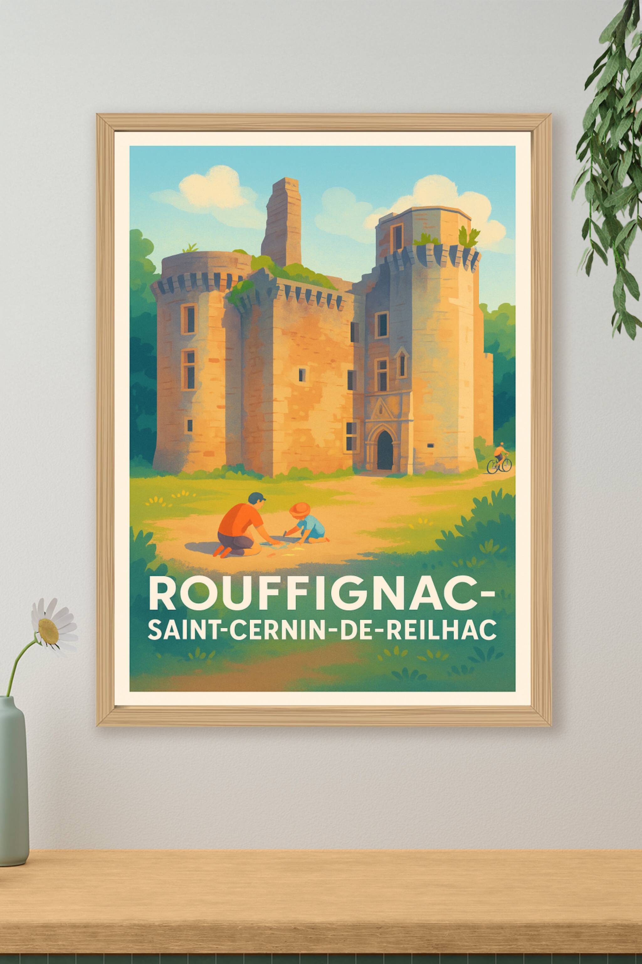 Découvrez l'élégance du patrimoine historique de Rouffignac-Saint-Cernin-de-Reilhac avec cette affiche illustrée mettant en scène son château emblé...