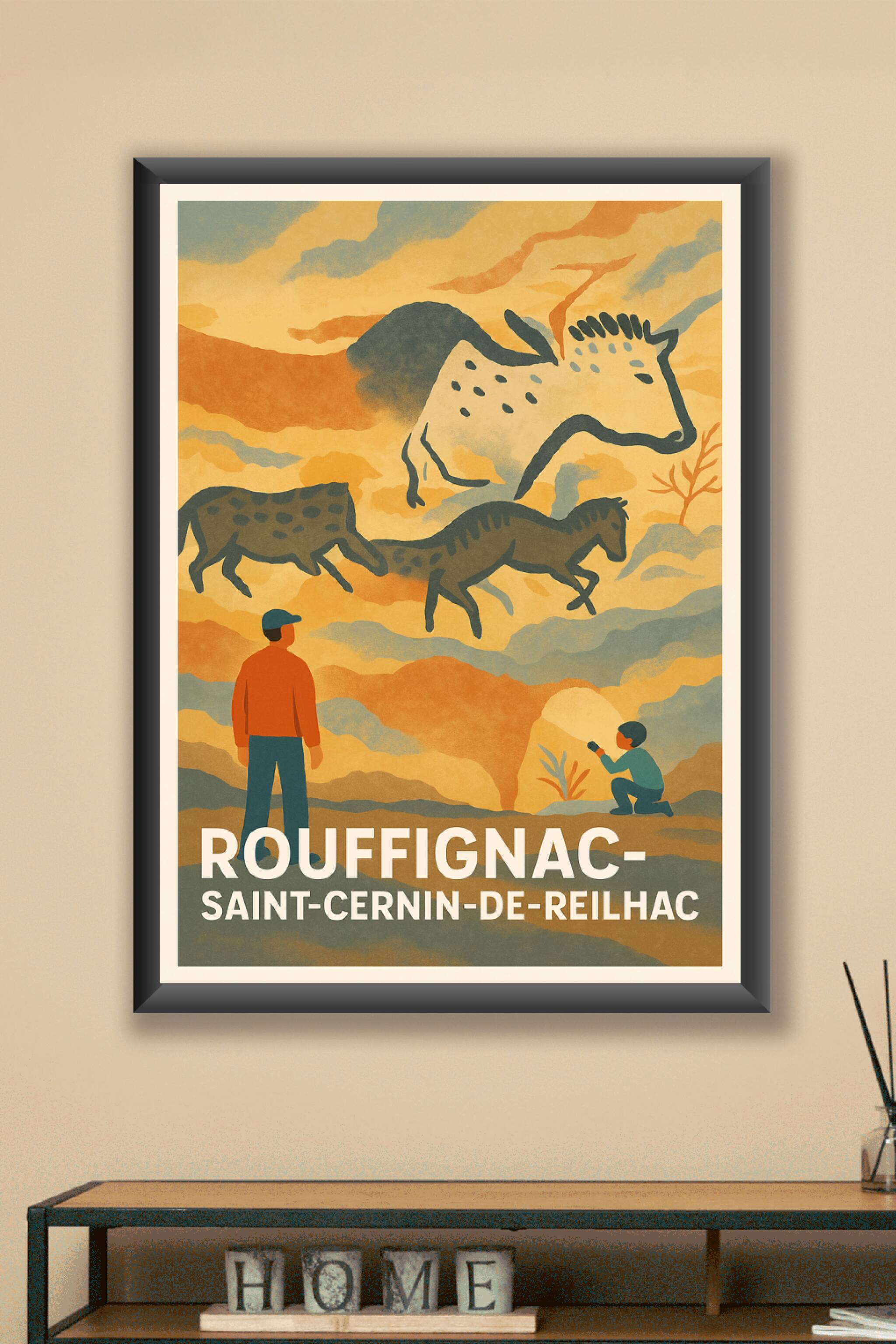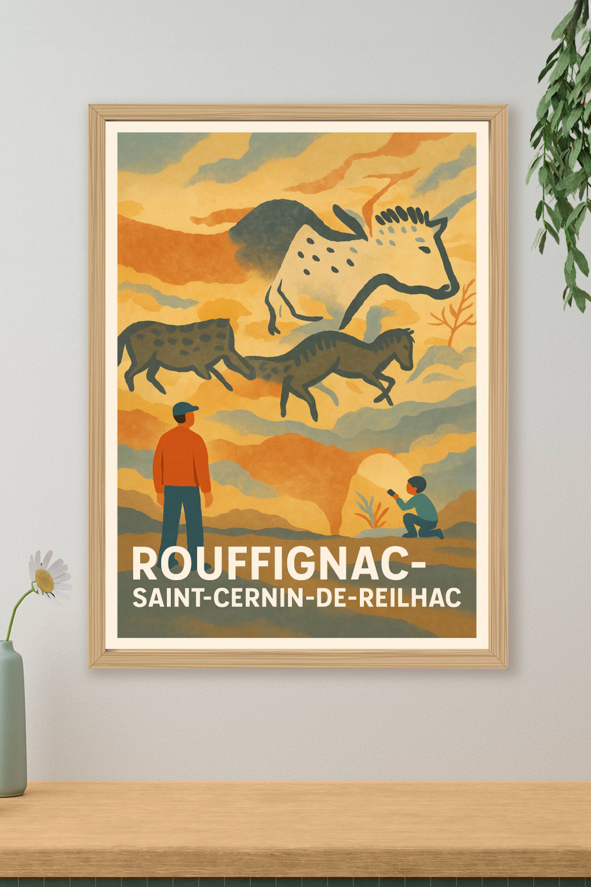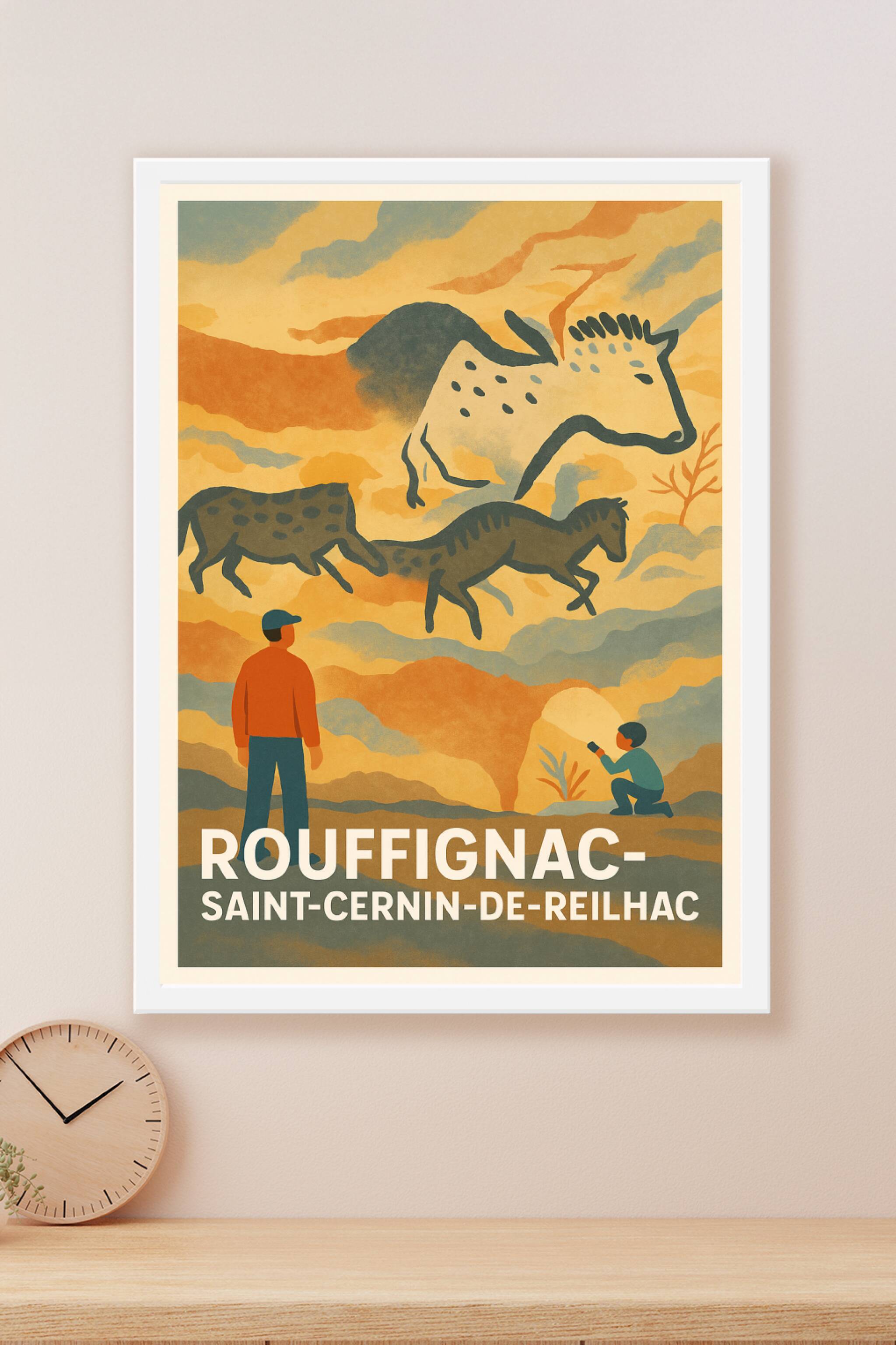 Découvrez l'univers fascinant de Rouffignac-Saint-Cernin-de-Reilhac à travers cette affiche artistique qui évoque les célèbres grottes ornées de la...