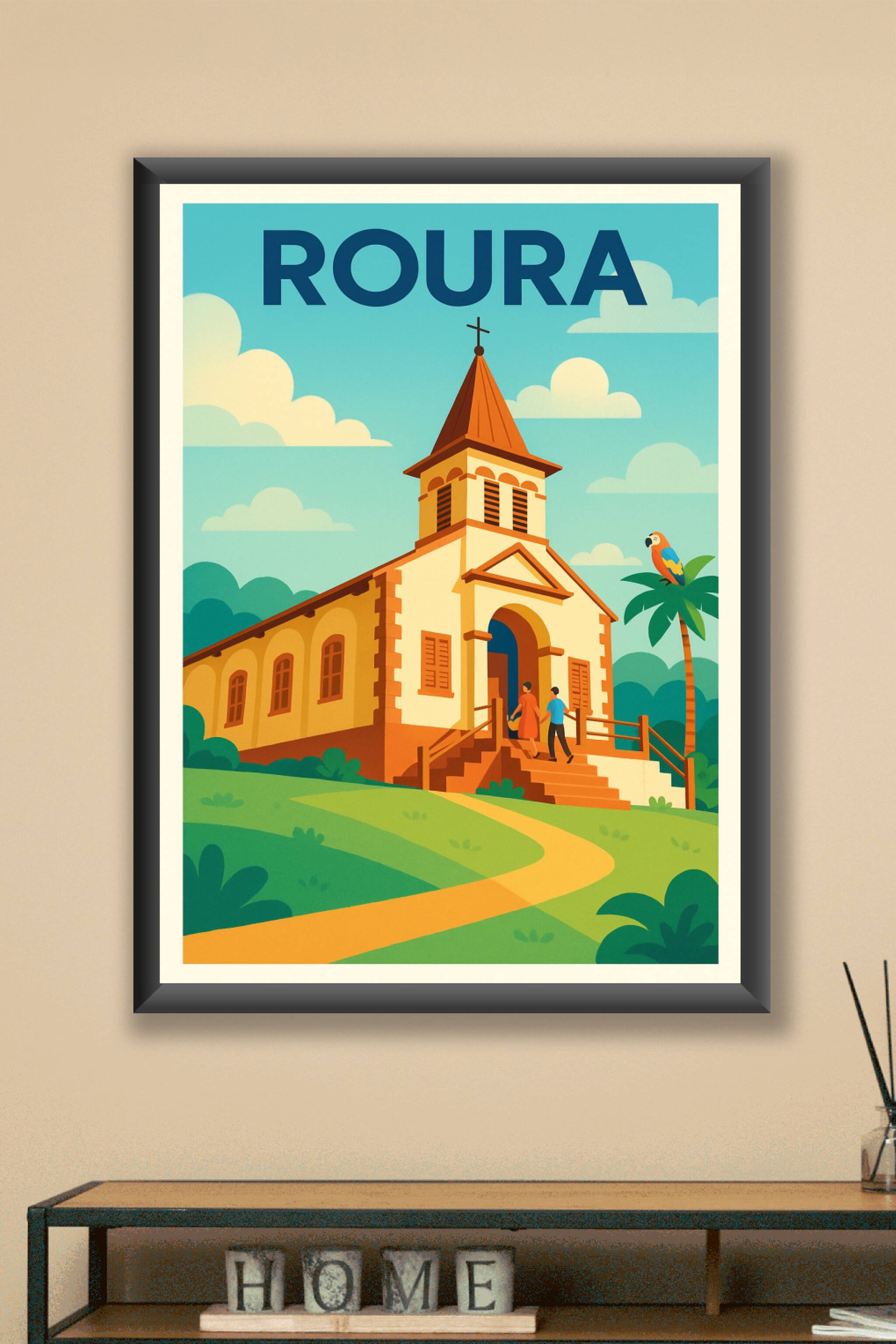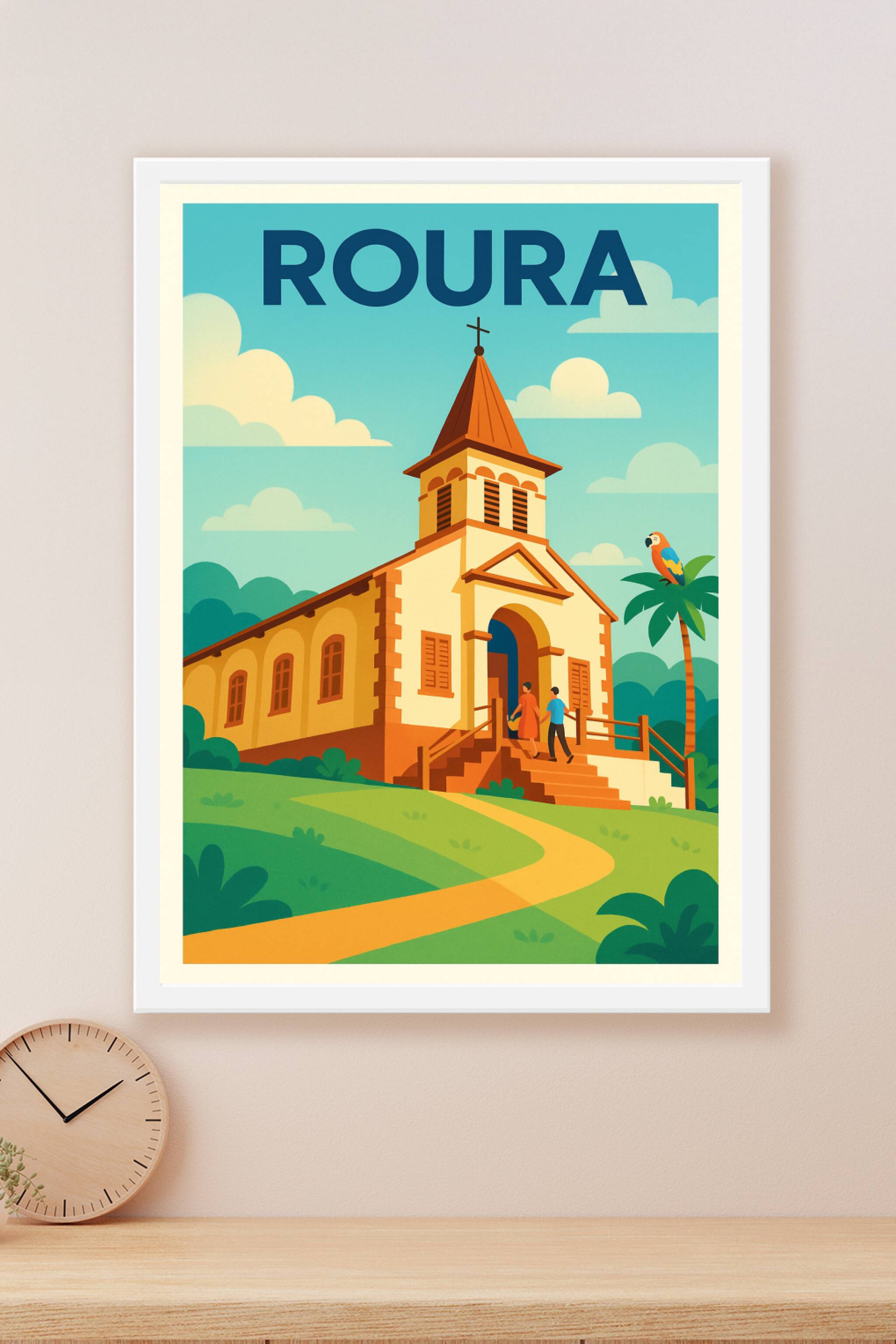 Découvrez l'atmosphère paisible et chaleureuse de Roura avec cette affiche illustrée mettant en scène une église typique au cœur d'une nature luxur...
