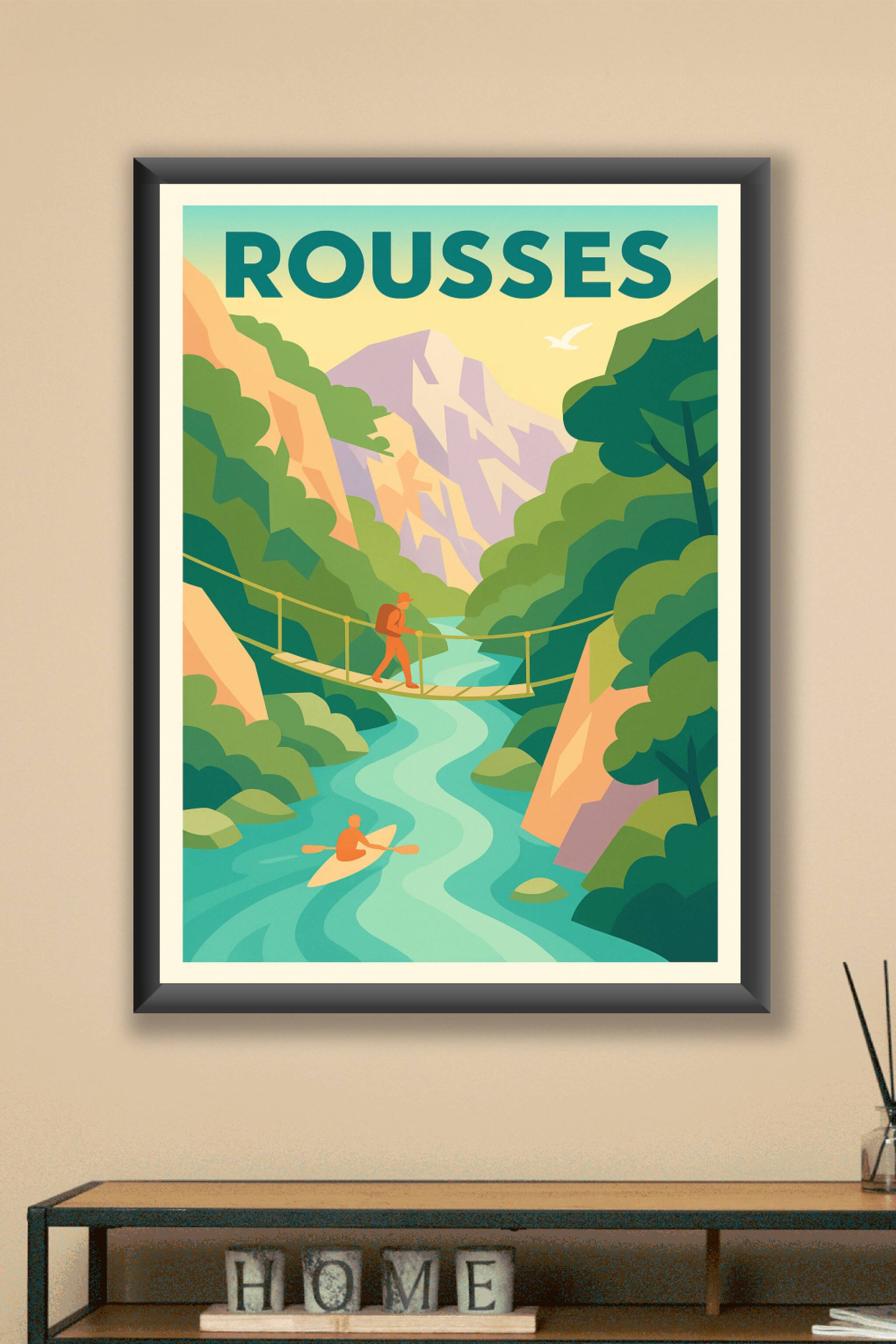 Découvrez la beauté sauvage et apaisante des Rousses avec cette affiche au style graphique et coloré, illustrant un paysage de montagnes, de rivièr...