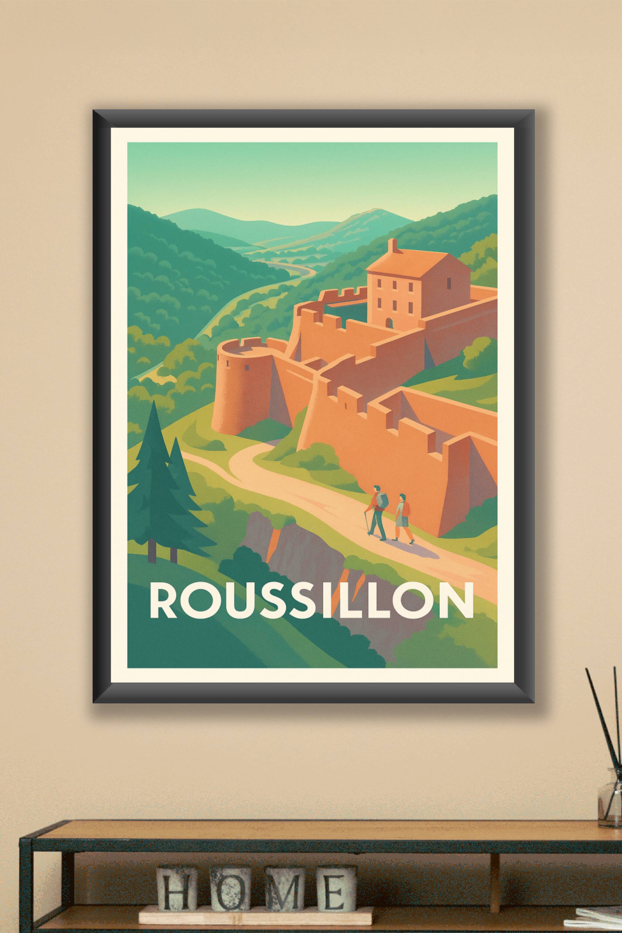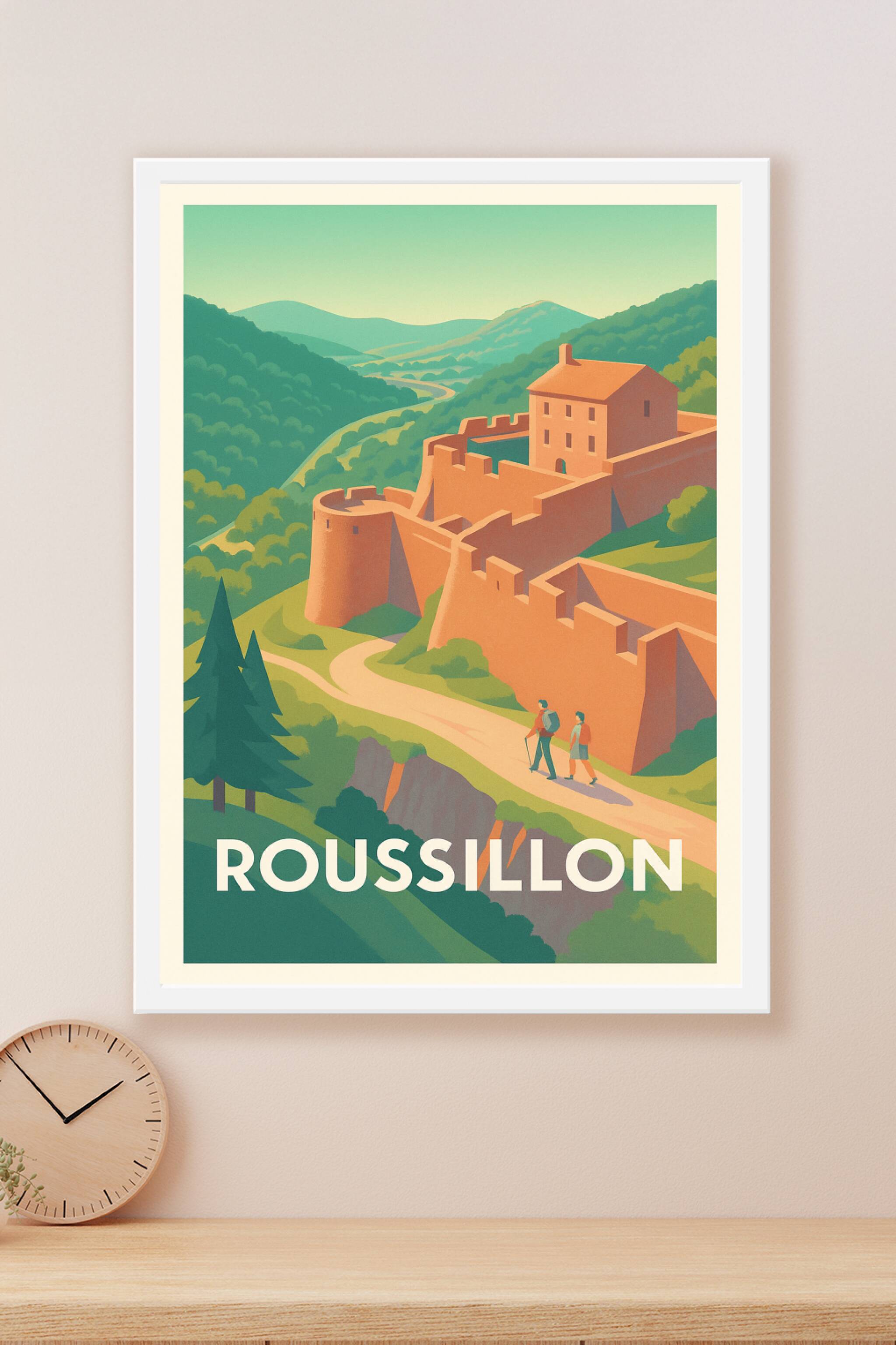 Découvrez la beauté naturelle et le charme historique de Roussillon avec cette affiche illustrée dans un style vintage aux couleurs douces. Le post...