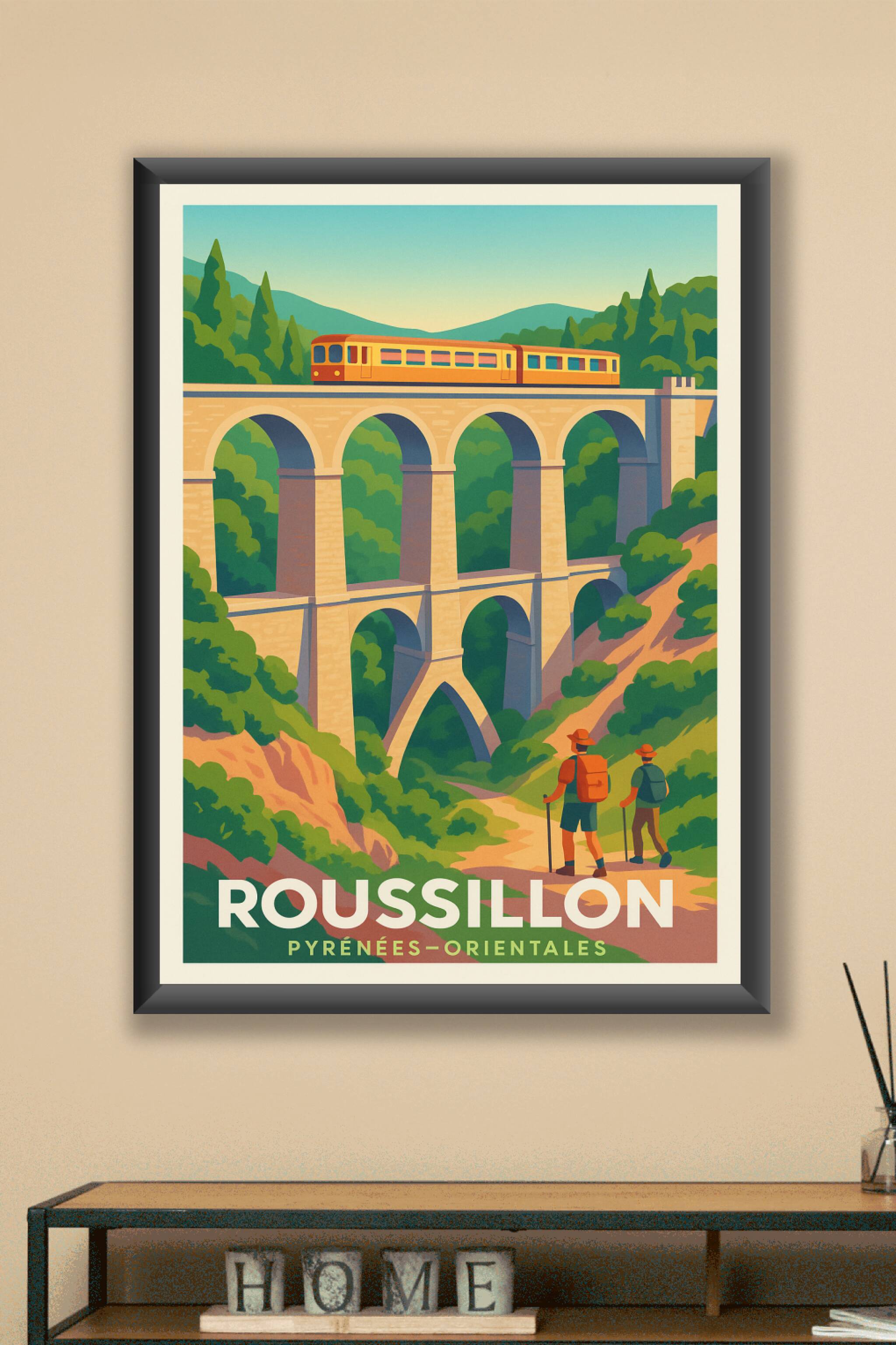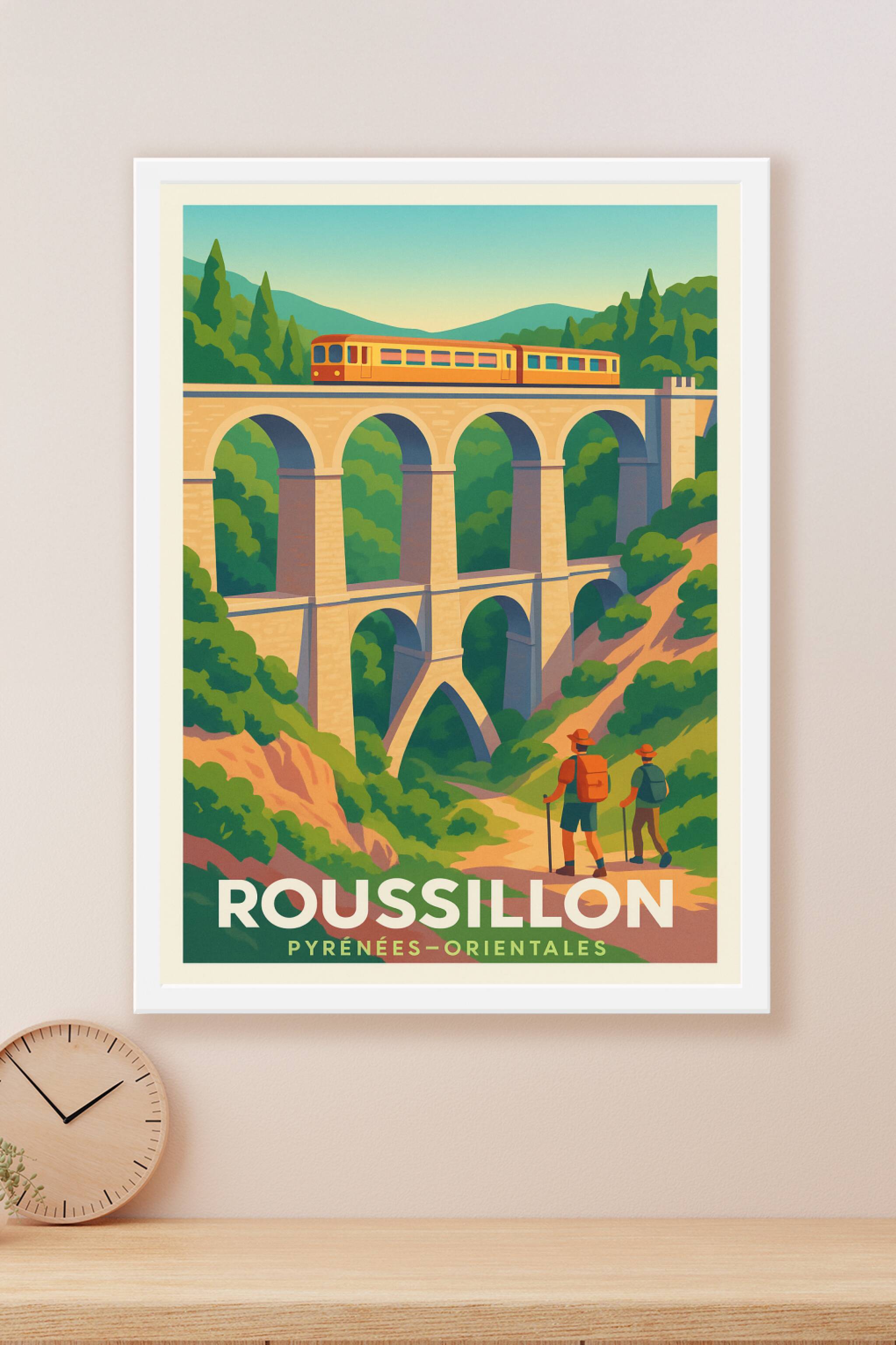Découvrez la beauté authentique du Roussillon dans les Pyrénées-Orientales à travers cette affiche vintage illustrant un train traversant un viaduc...