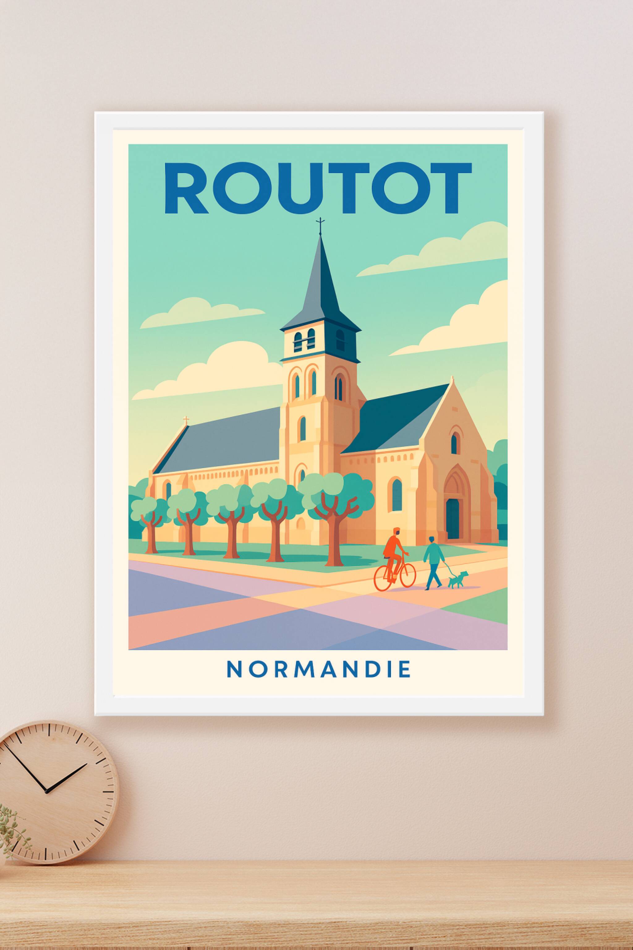 Découvrez le charme paisible de Routot à travers cette affiche élégante représentant l’architecture typique de la région normande. Ce poster au sty...