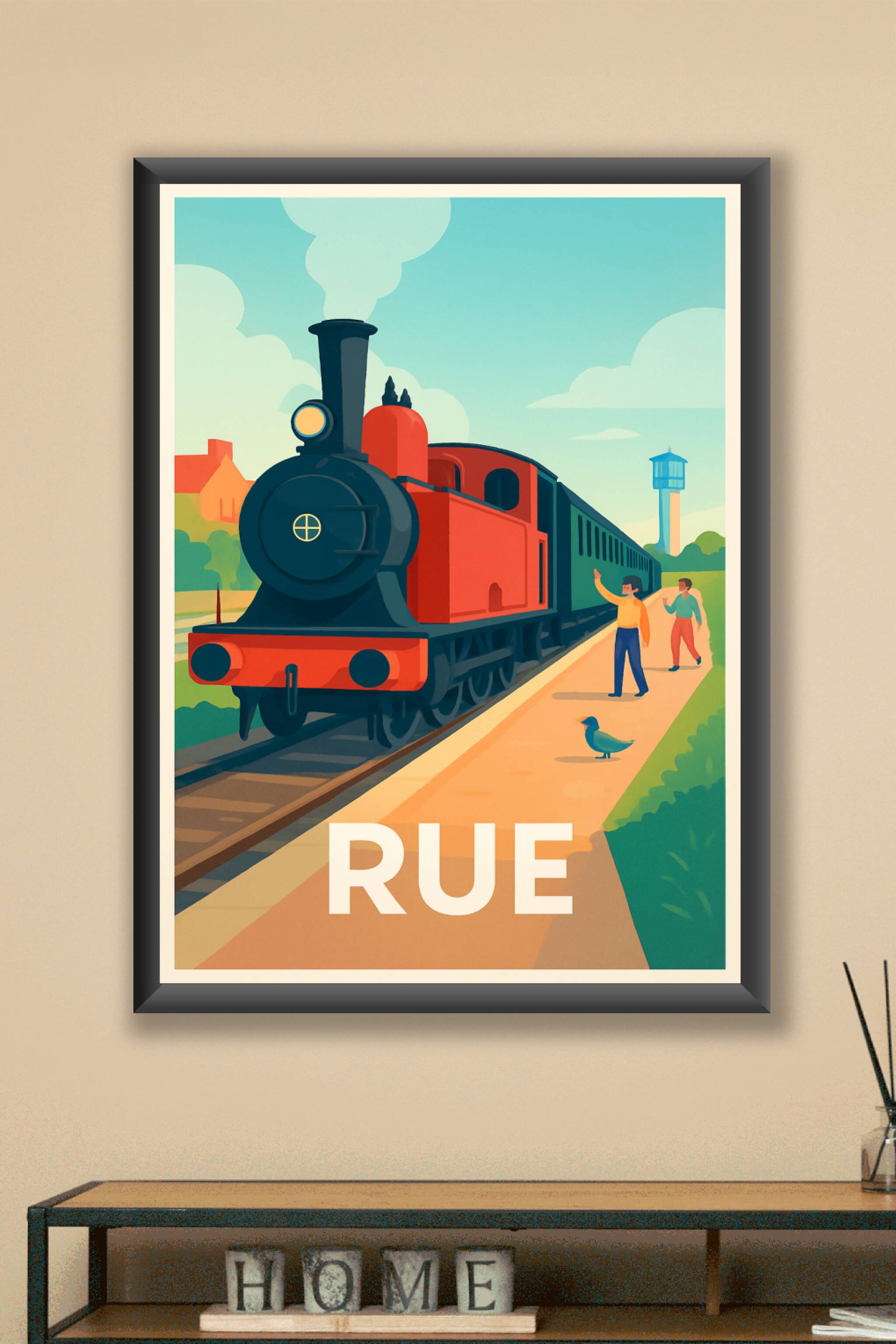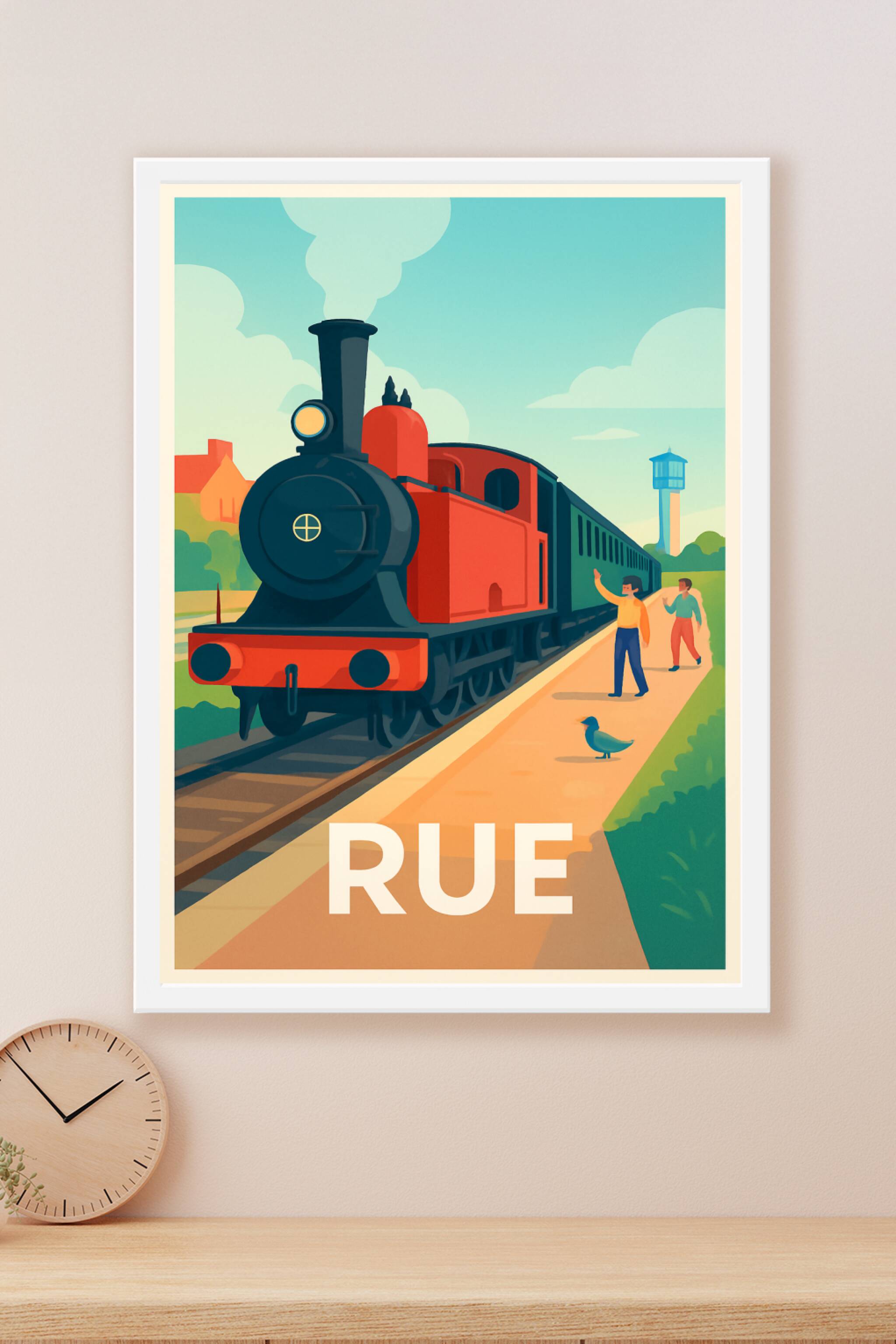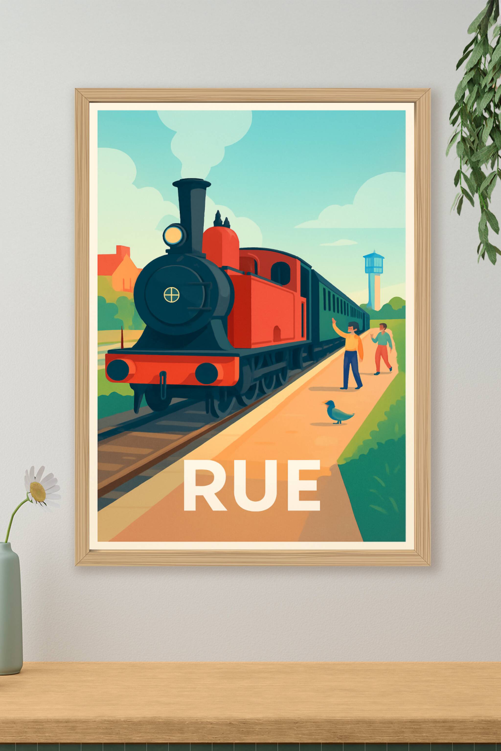 Découvrez l'atmosphère vintage et chaleureuse de la petite ville de Rue avec cette affiche illustrée mettant en scène un train à vapeur rouge trave...