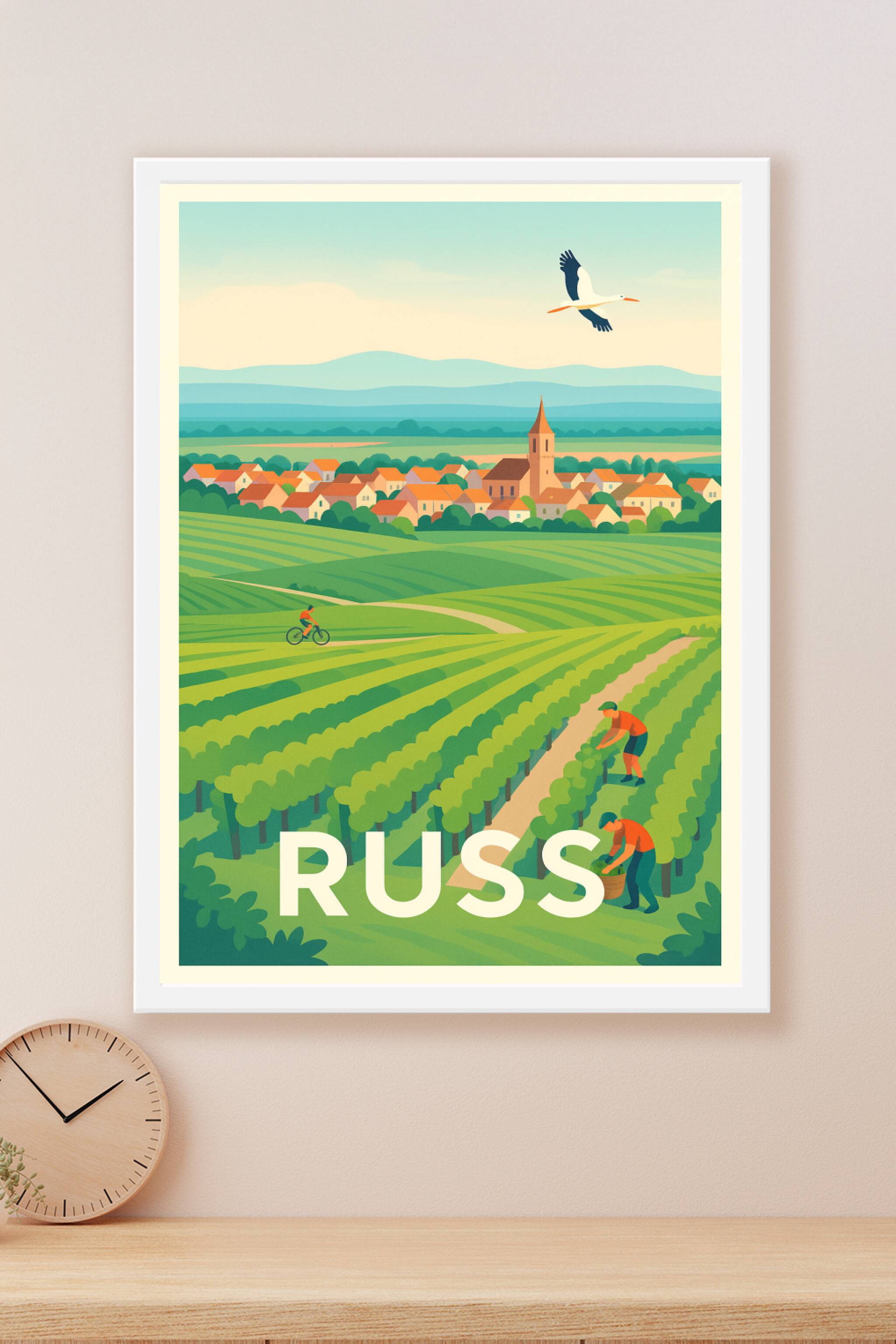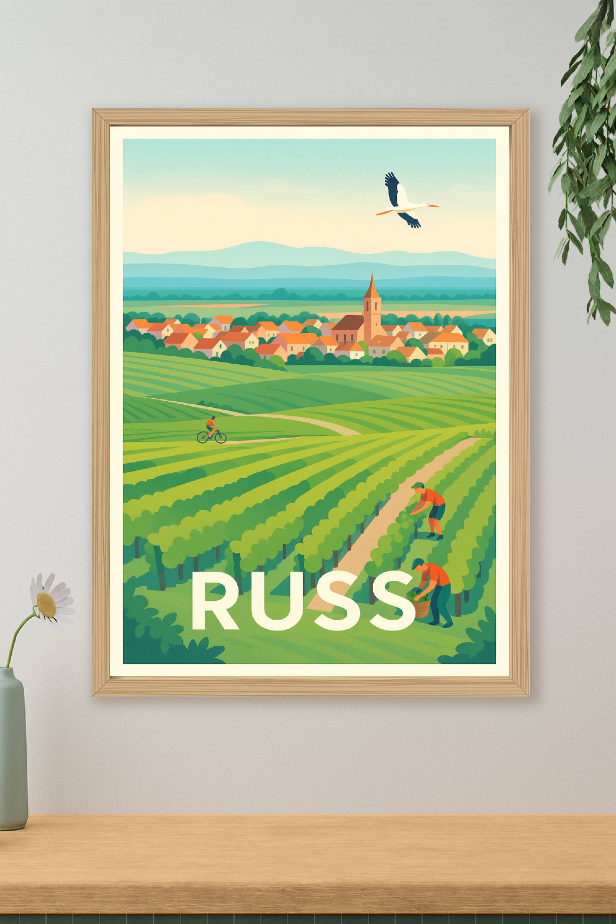 Découvrez l'affiche représentant le village pittoresque de Russ niché au milieu de ses vignobles verdoyants. Cette scène paisible met en valeur les...