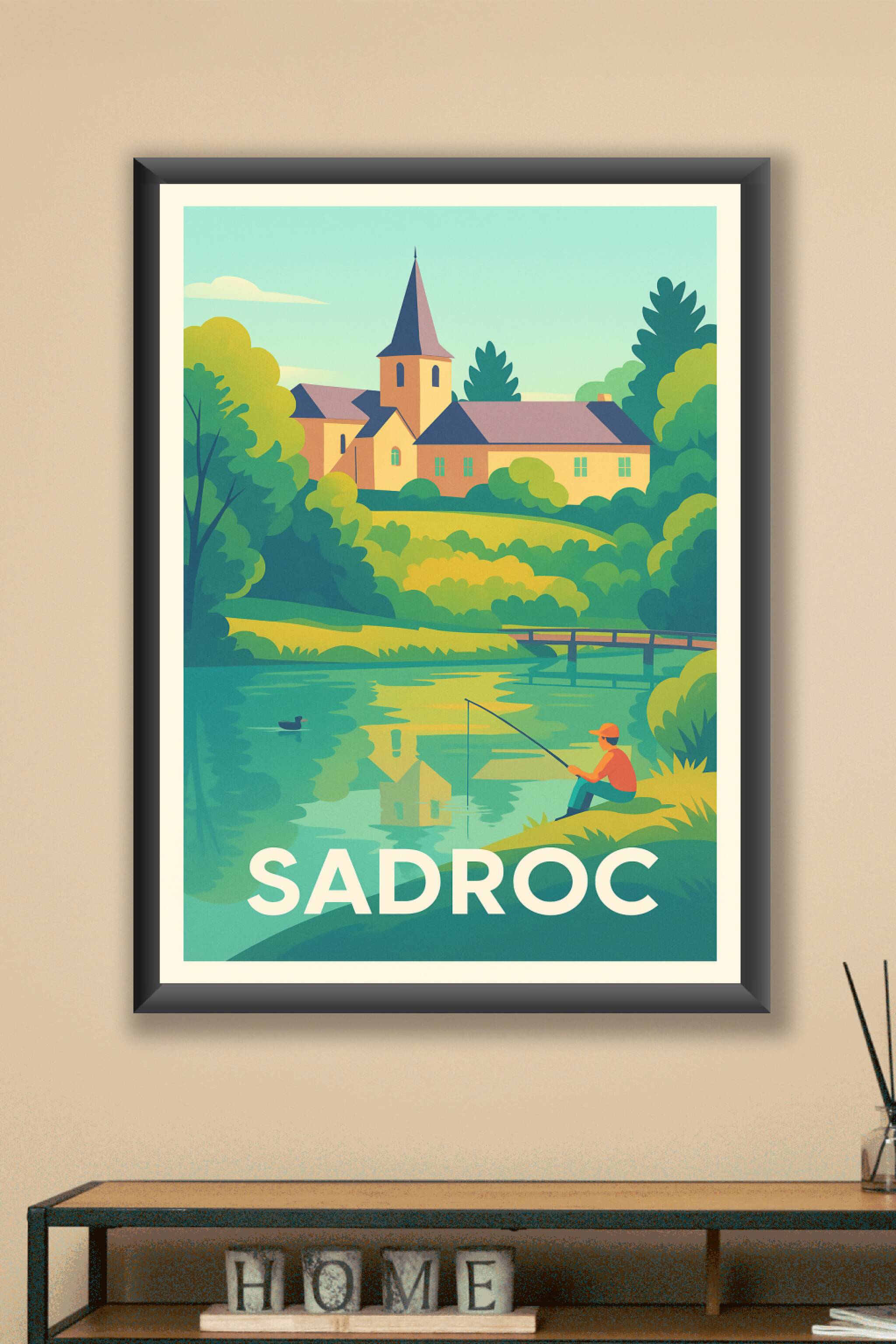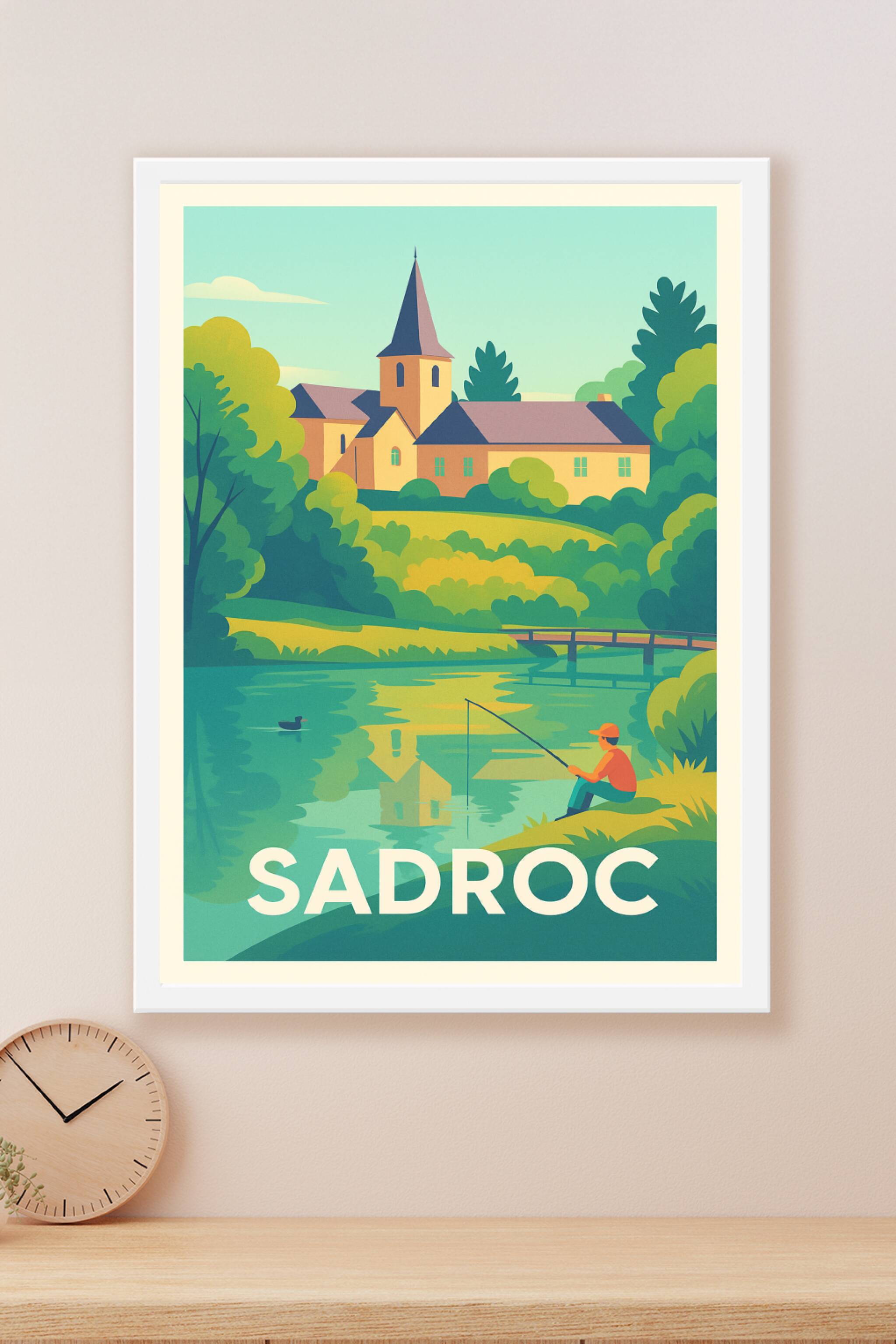 Découvrez l'atmosphère paisible de Sadroc avec cette affiche illustrée représentant un pêcheur au bord d'un plan d'eau, encadré par une nature luxu...