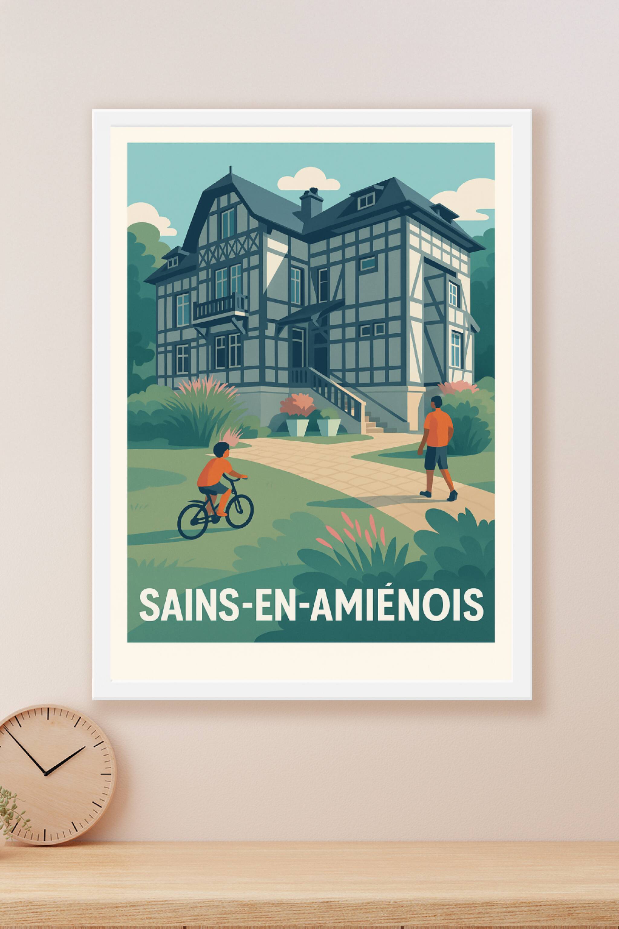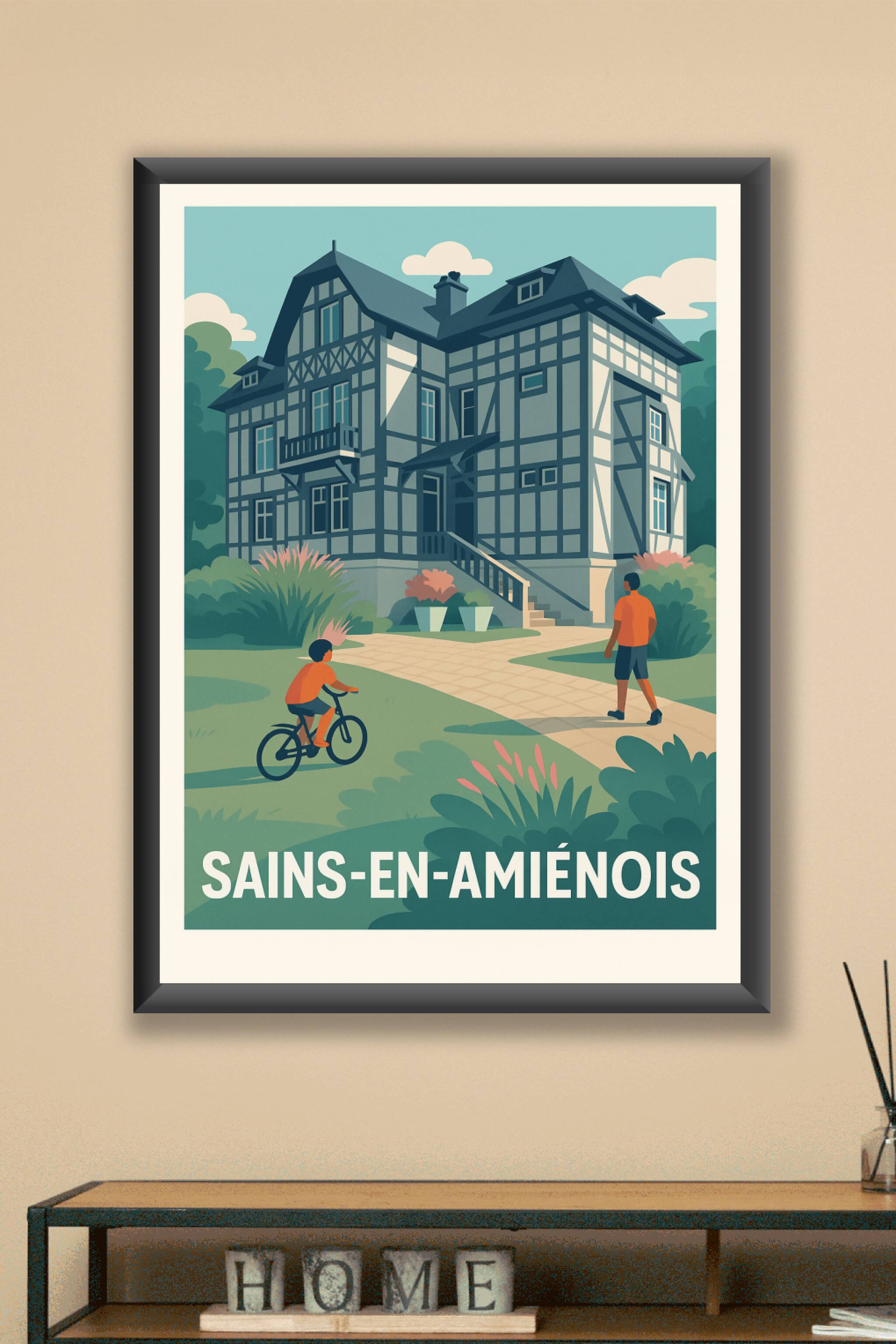 Découvrez l'élégance intemporelle de Sains-en-Amiénois avec cette affiche illustrée qui met en lumière une maison à colombages typique et l'atmosph...