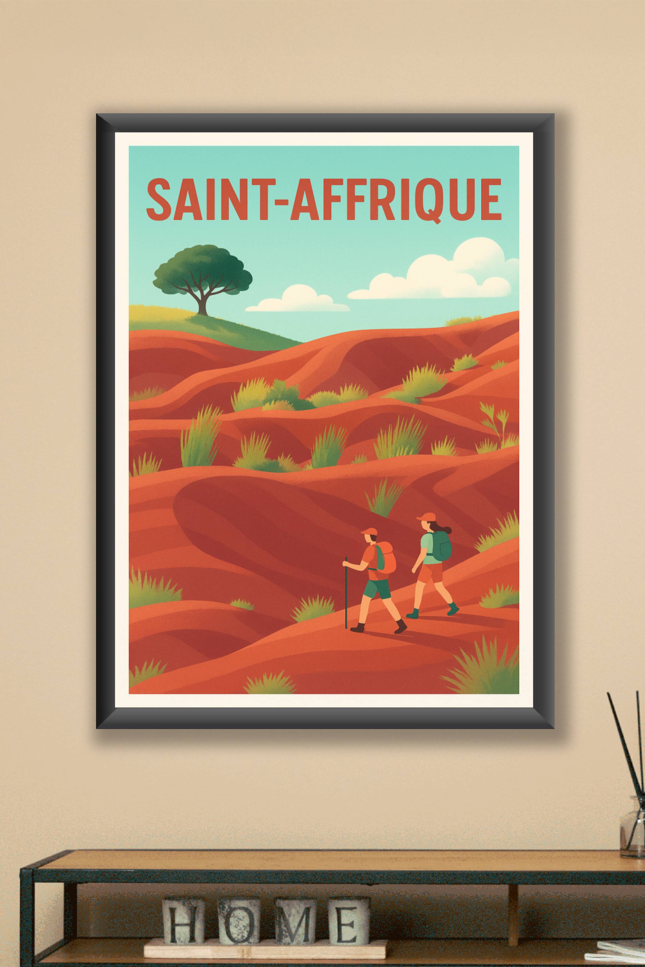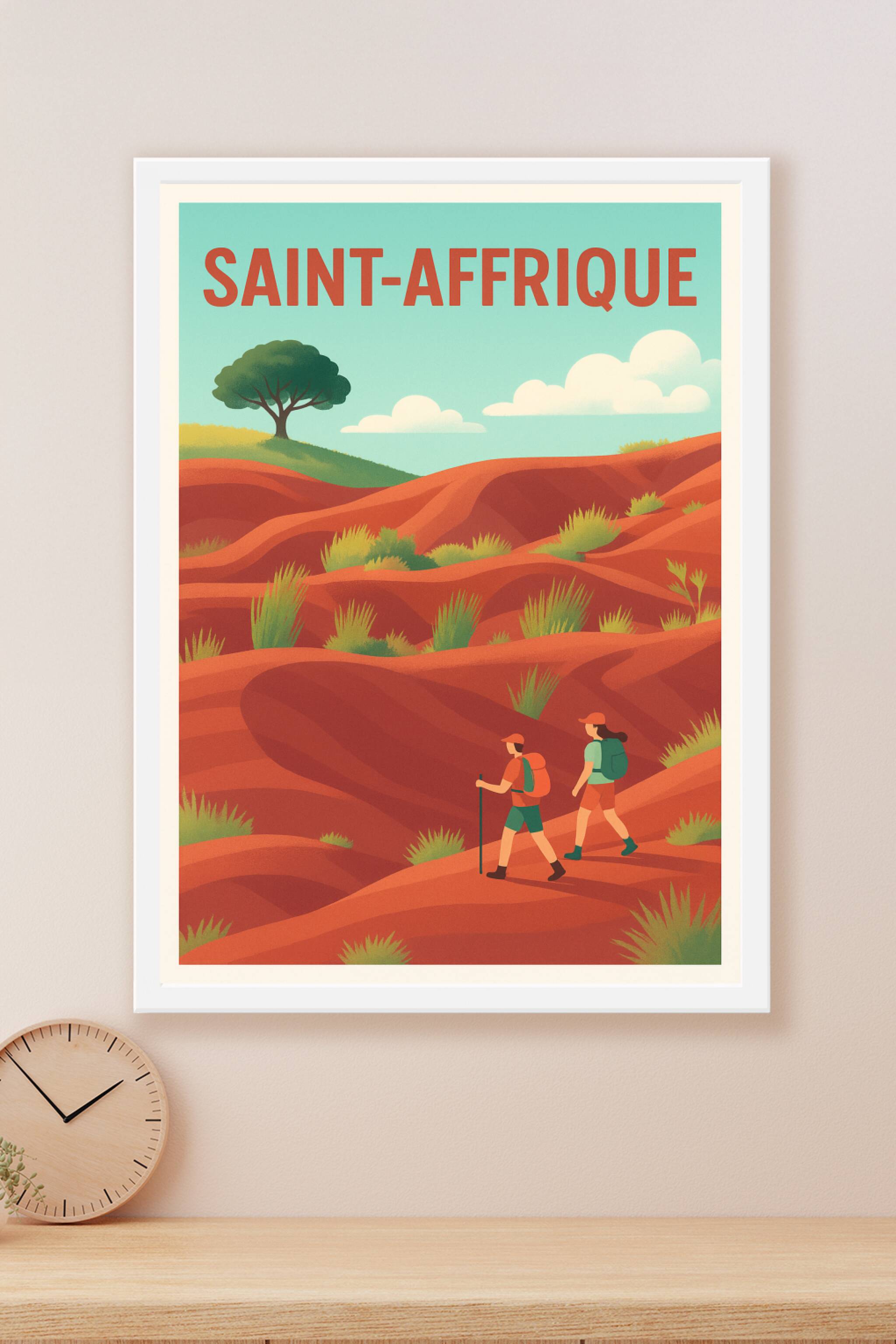 Découvrez la beauté sauvage des paysages de Saint-Affrique avec cette affiche au style épuré et chaleureux. Ce poster met en scène deux randonneurs évoluant dans les terres rouges et vallonnées, sous un ciel bleu apaisant et quelques nuages légers. Imprimée en tirage "Fine Art" sur un papier 305g coton haut de gamme, cette affiche garantit une qualité d'impression remarquable et des couleurs profondes, parfaites pour sublimer votre décoration intérieure. Disponible en plusieurs formats du A4 au A1, avec ou sans cadre, elle s'adapte à tous les espaces et apporte une touche d'aventure et de nature à votre maison. Offrez-vous ou aux passionnés de randonnée un poster unique, 100% fabriqué en France et pensé pour durer.
