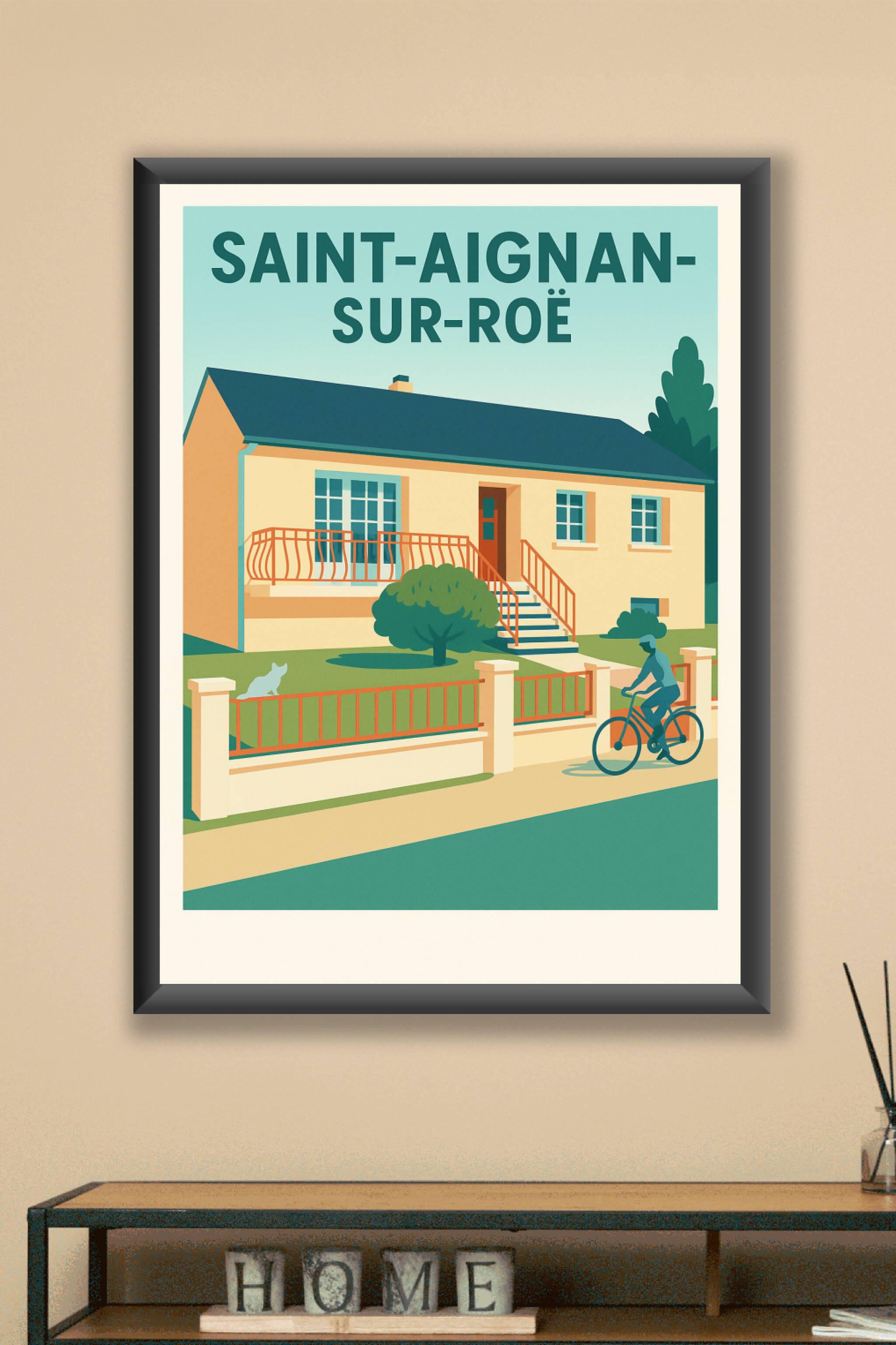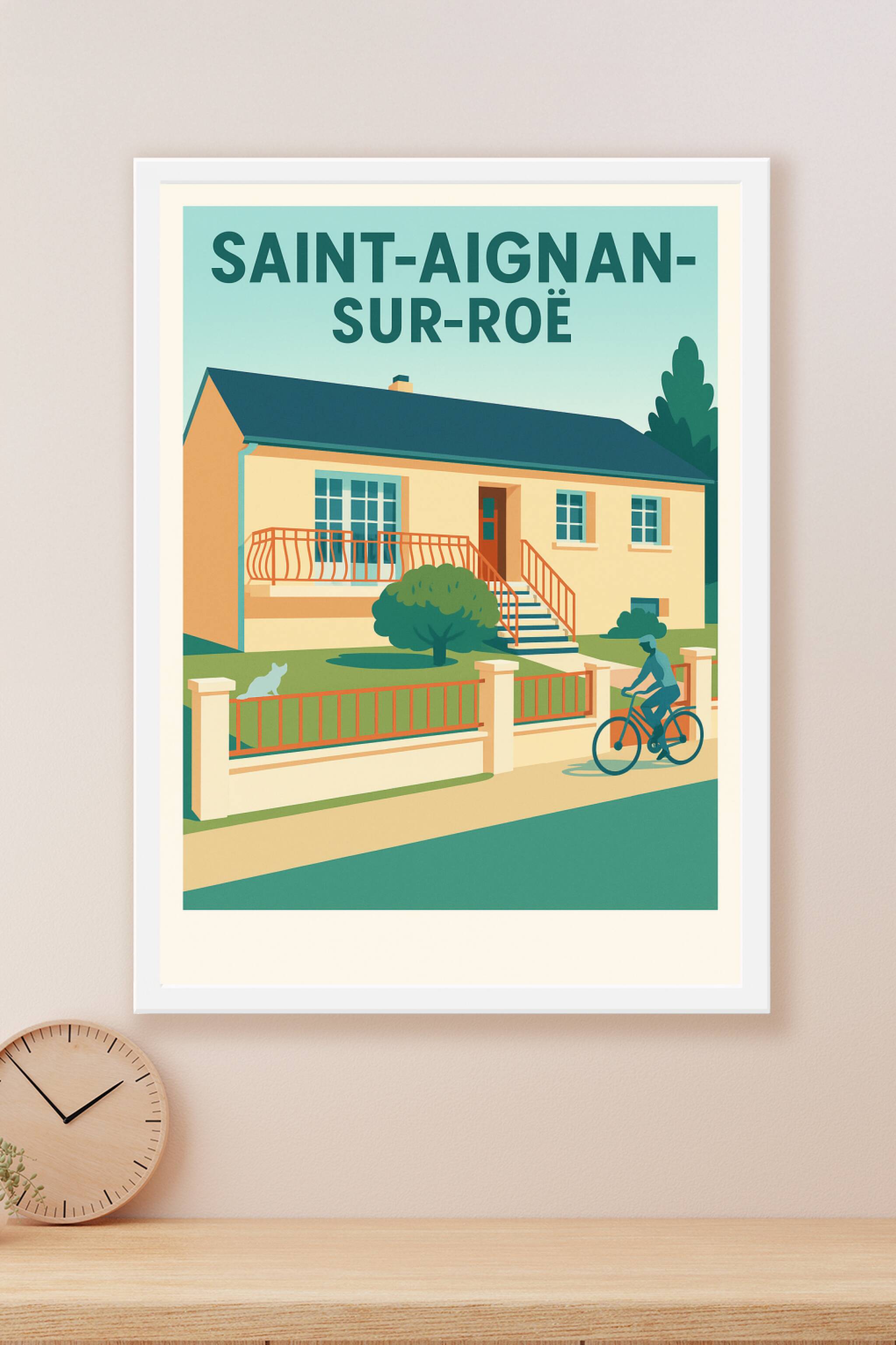 Découvrez cette affiche illustrant une maison typique de Saint-Aignan-sur-Roë, représentant la sérénité et l'atmosphère authentique de ce village p...