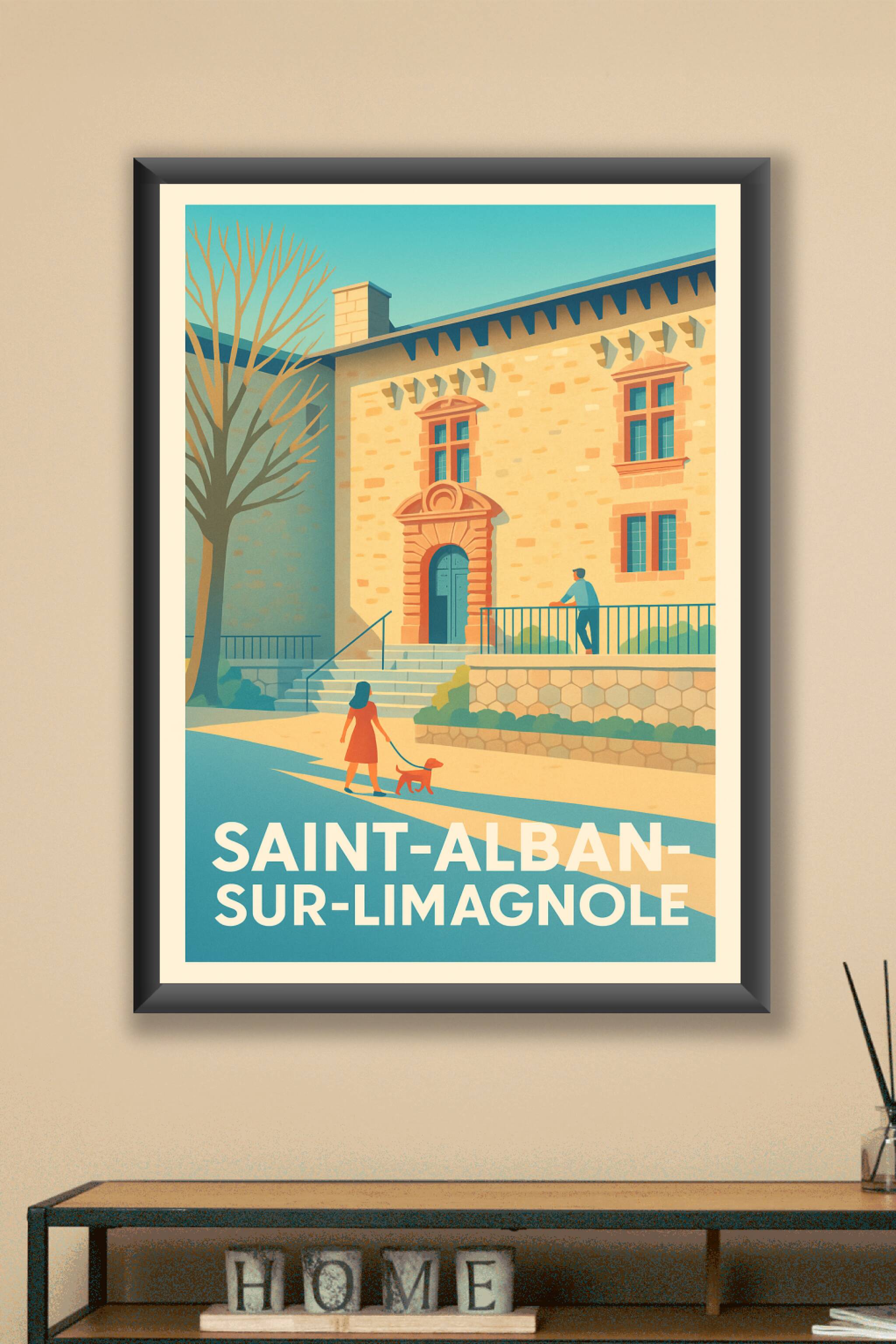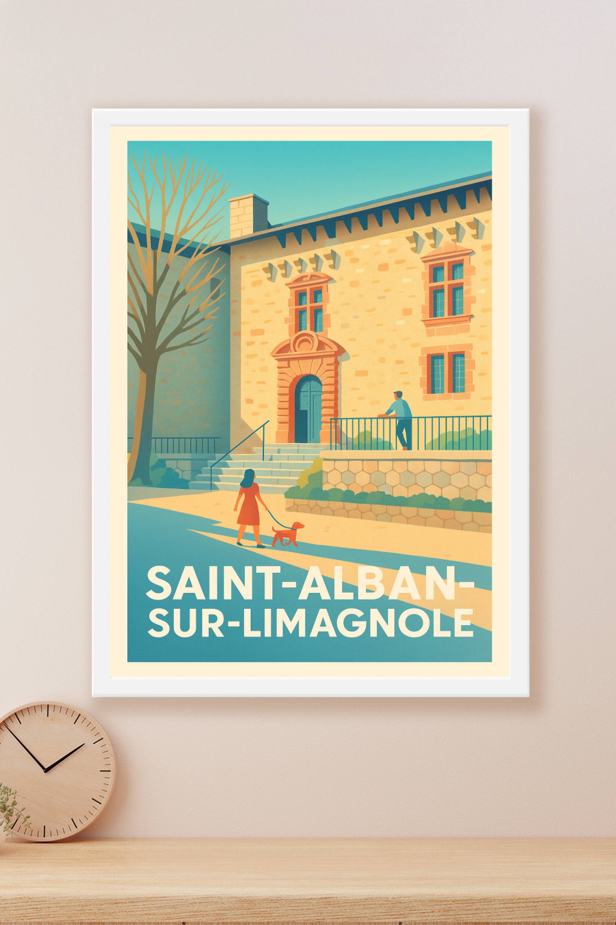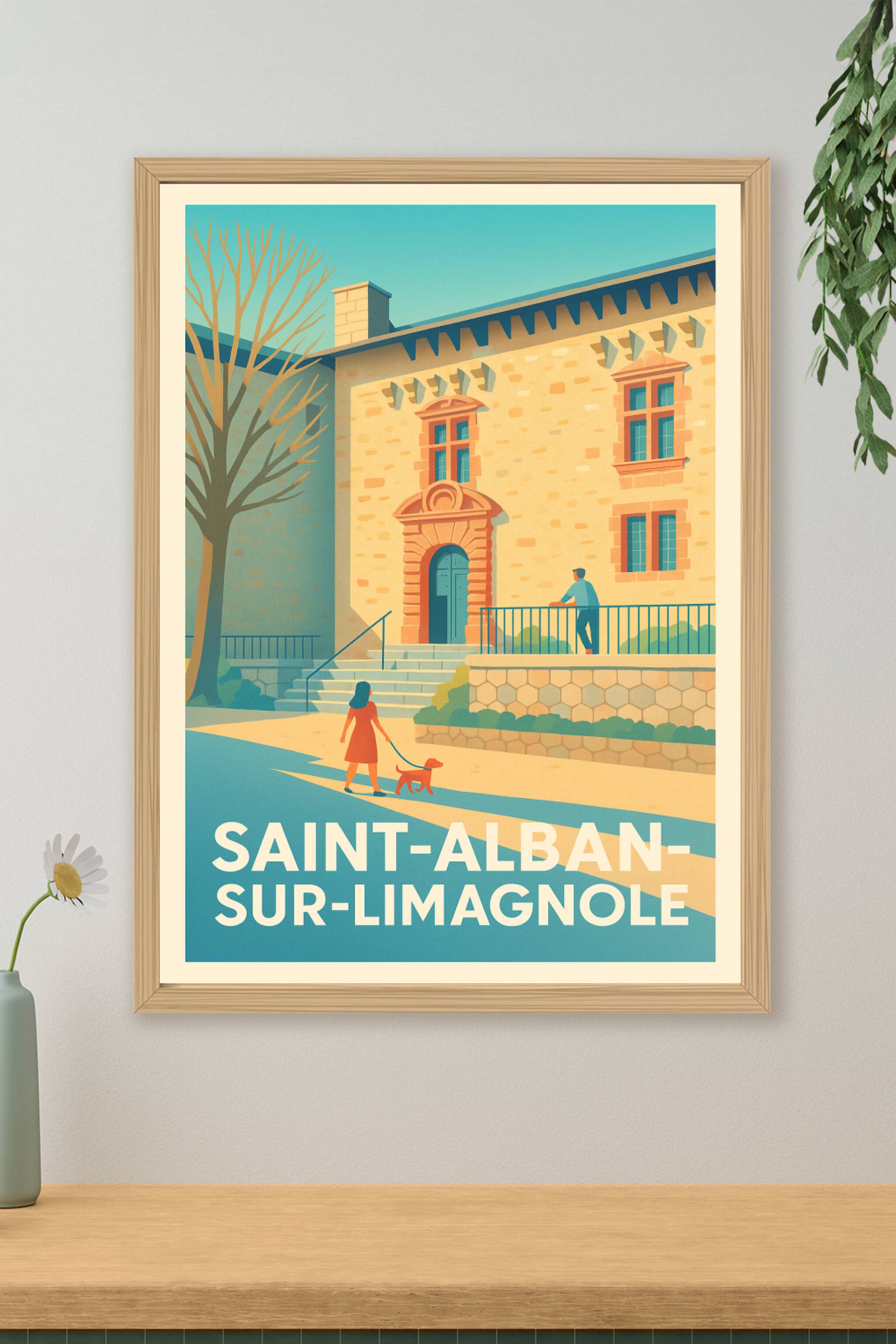 Découvrez cette affiche illustrant l'élégance tranquille de Saint-Alban-sur-Limagnole, où une maison en pierre et une scène de vie locale s'harmoni...