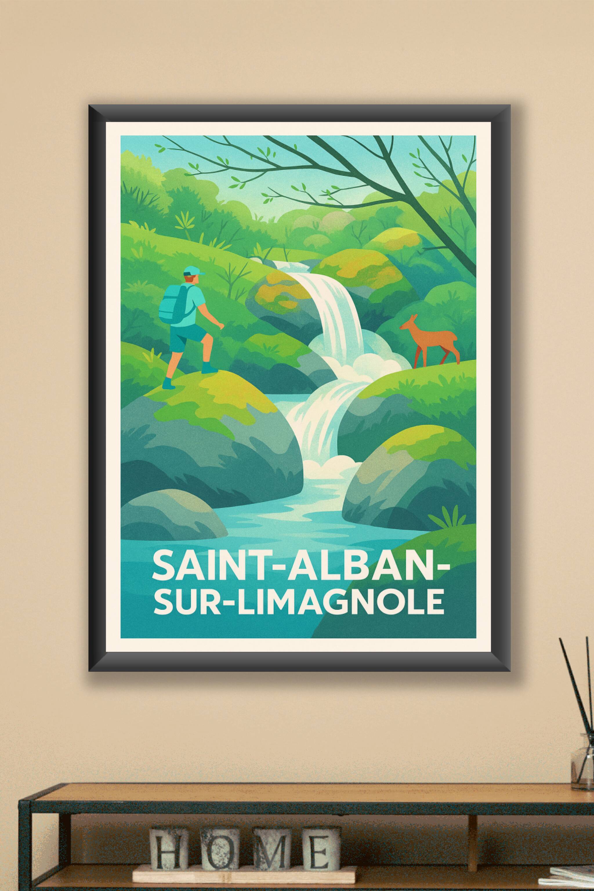 Découvrez l'essence pure de la nature avec cette affiche illustrant un paysage apaisant de Saint-Alban-sur-Limagnole, où randonneur et faune sauvag...