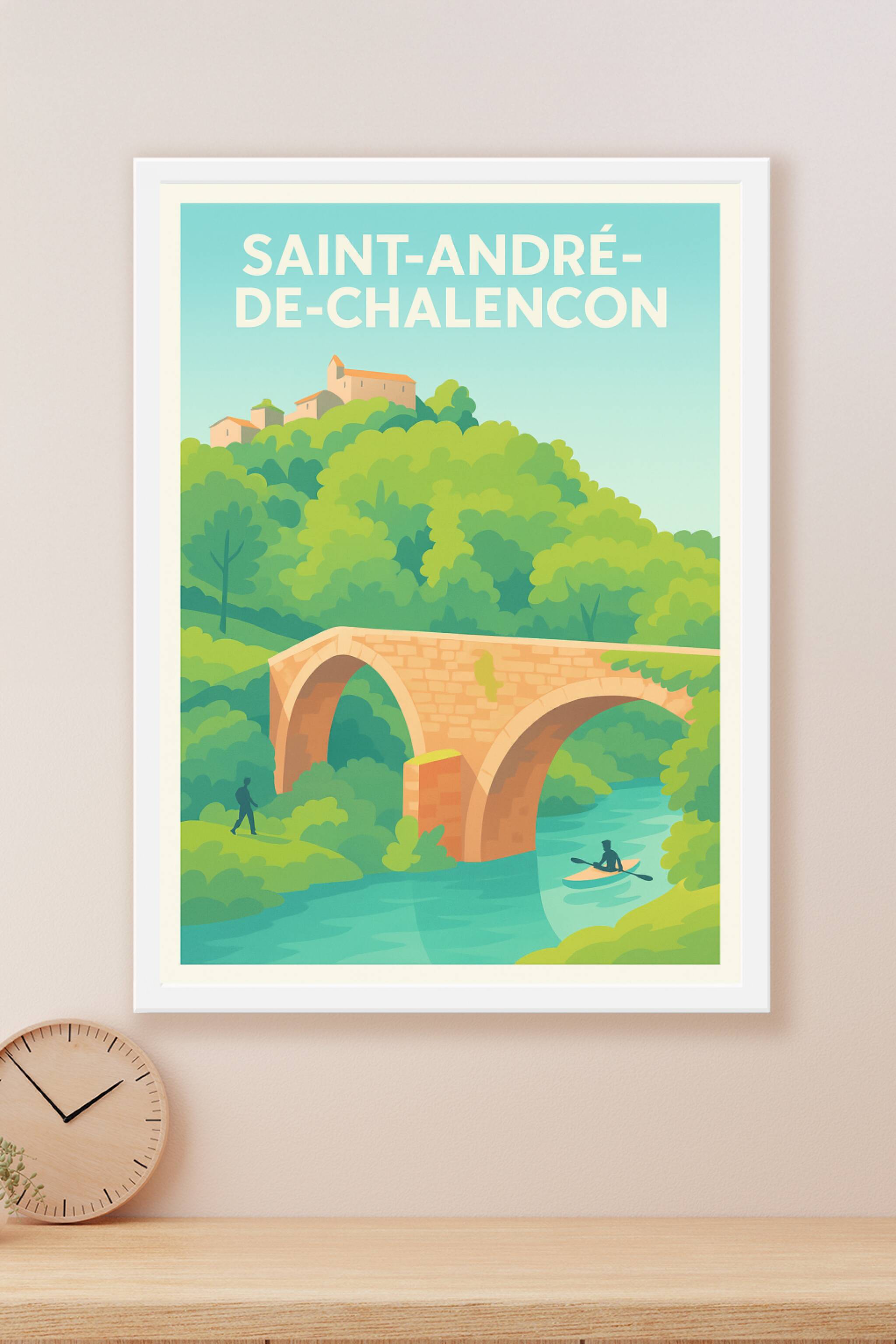 Découvrez la sérénité naturelle de Saint-André-de-Chalençon à travers cette affiche au design épuré mettant en scène un pont ancien et une rivière ...
